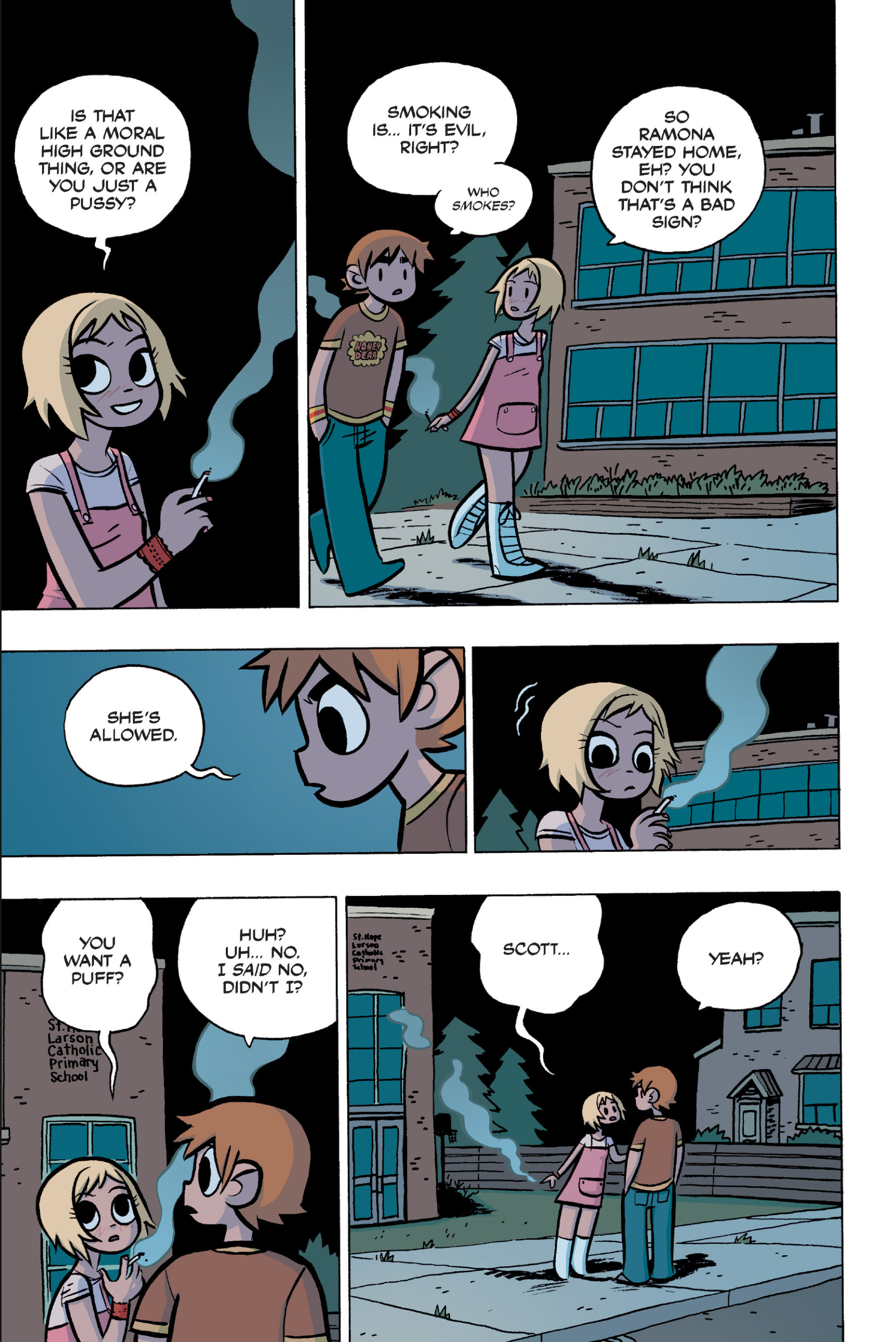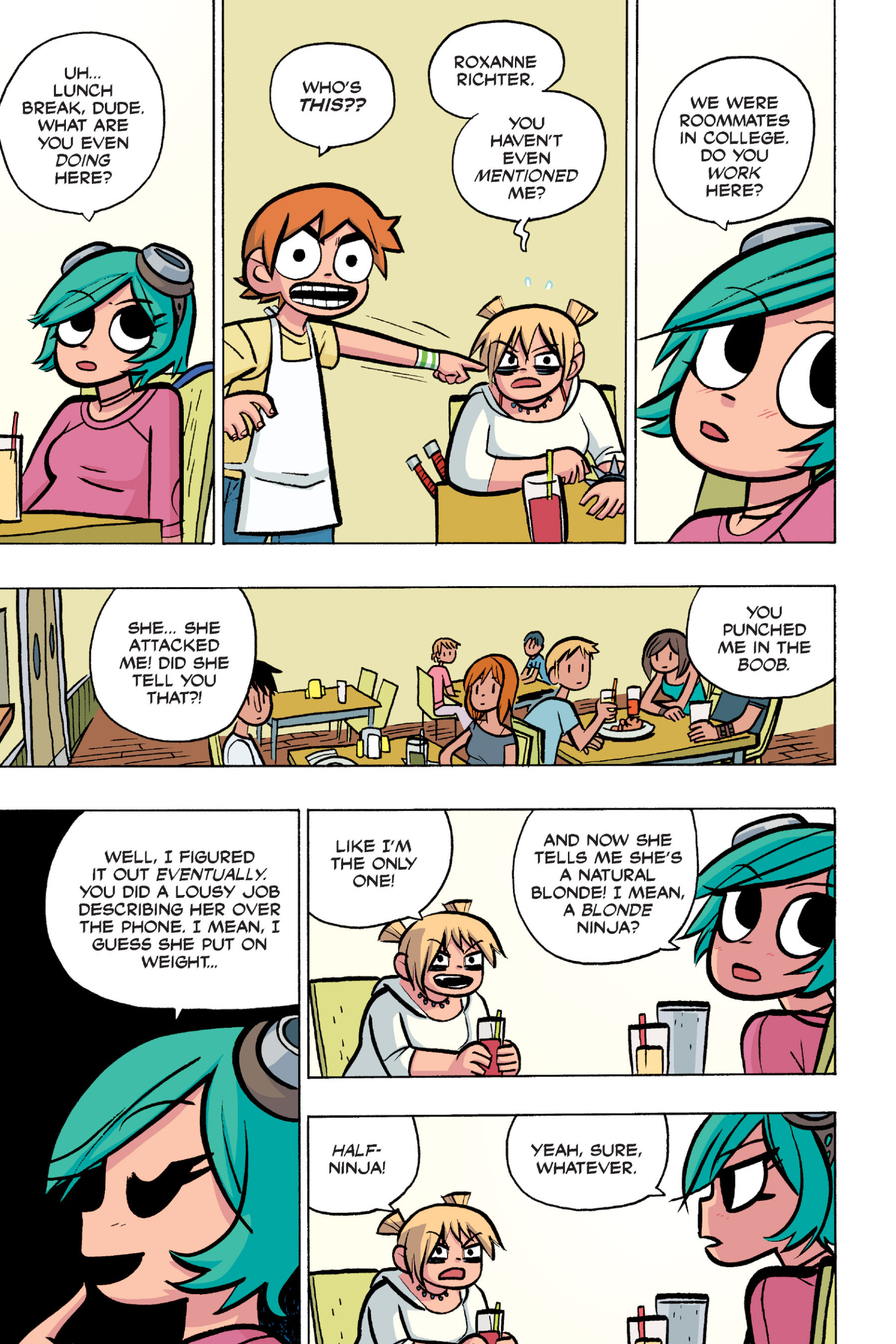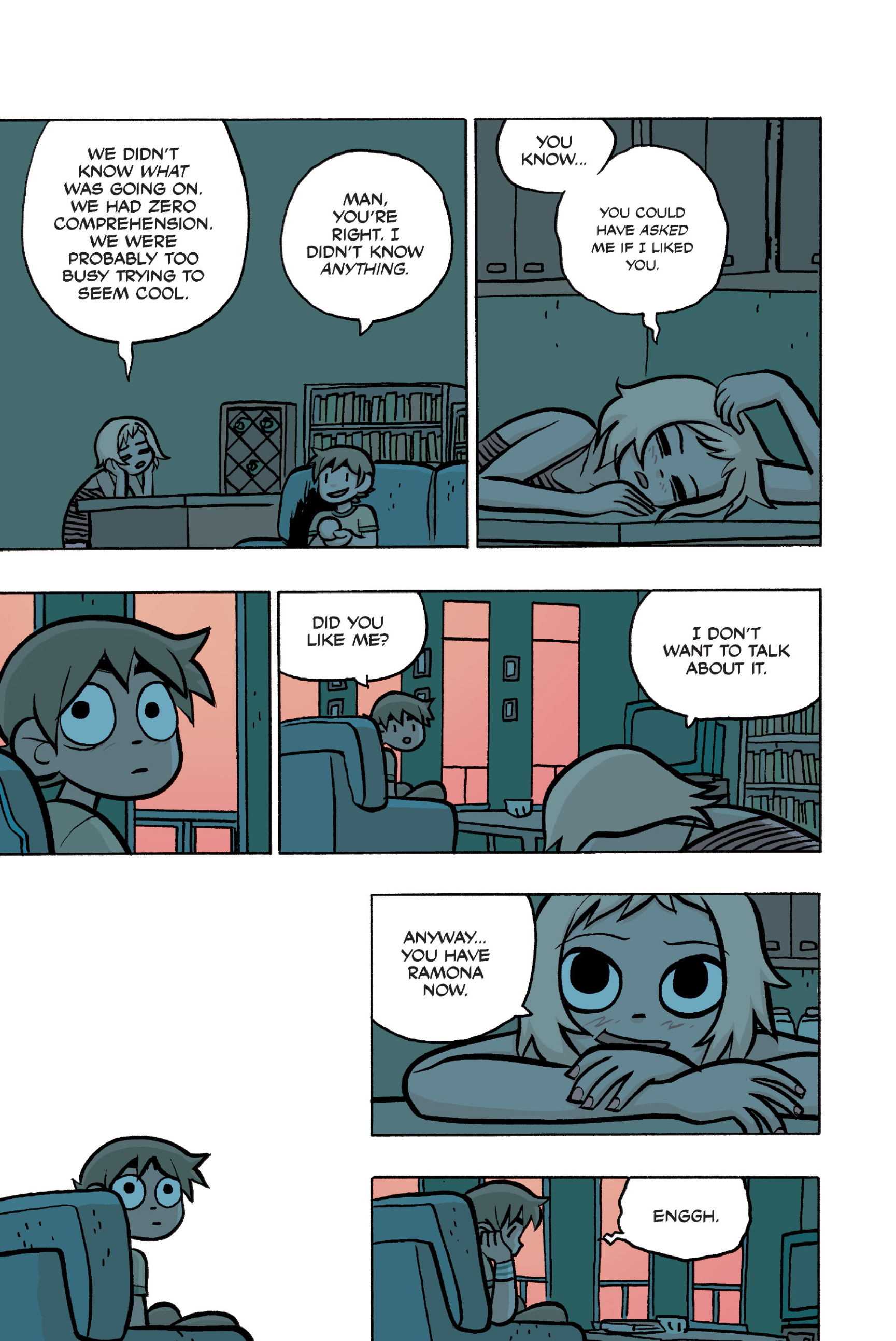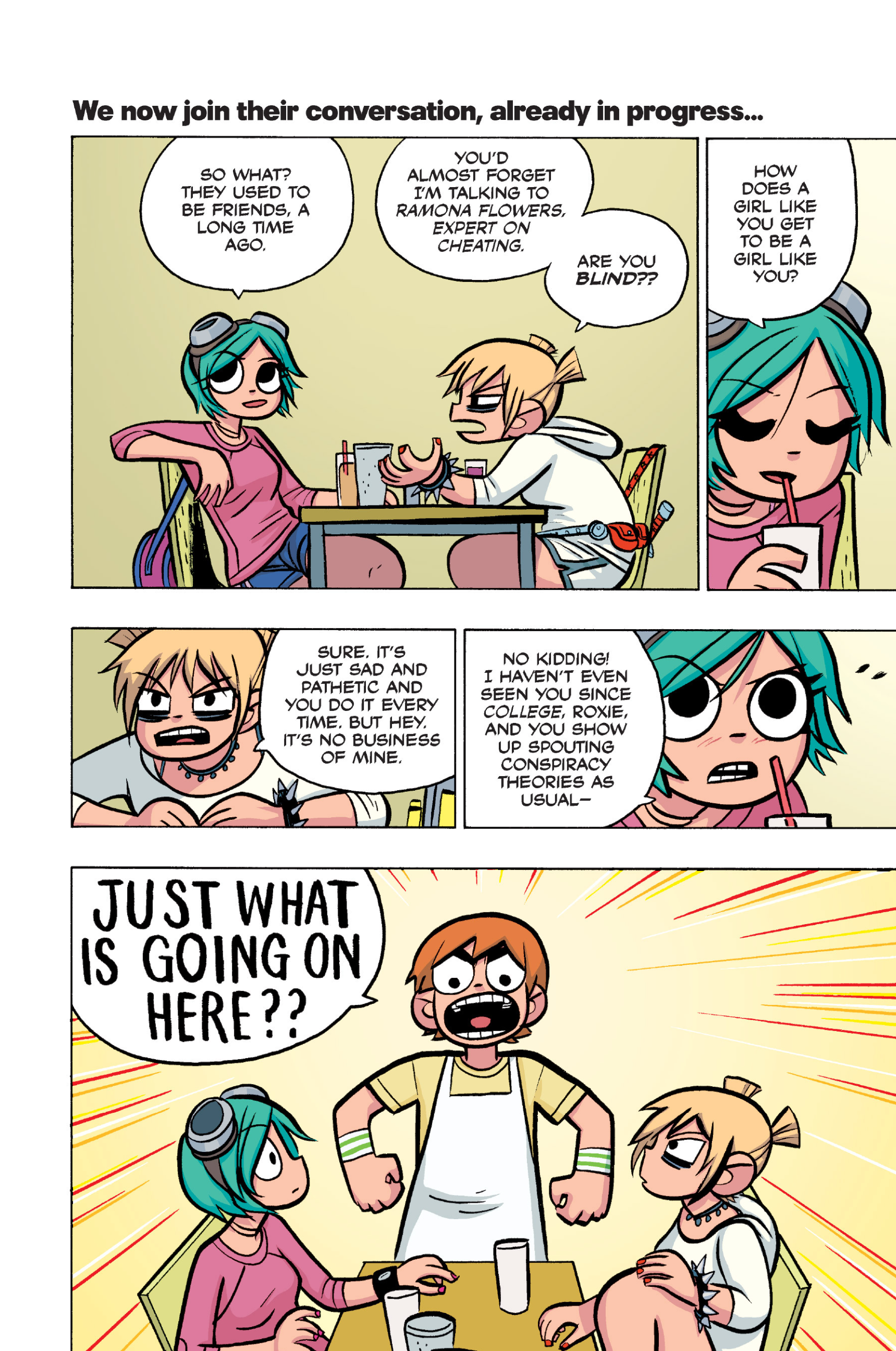 >>152870963I feel like this conversation is just sort of a sample of the entire comic: shallow small talk filled with simple, small lies that are immediately called out upon, as proof that the participants are posers and/or assholes. Why would Ramona even feel the need to lie about this?