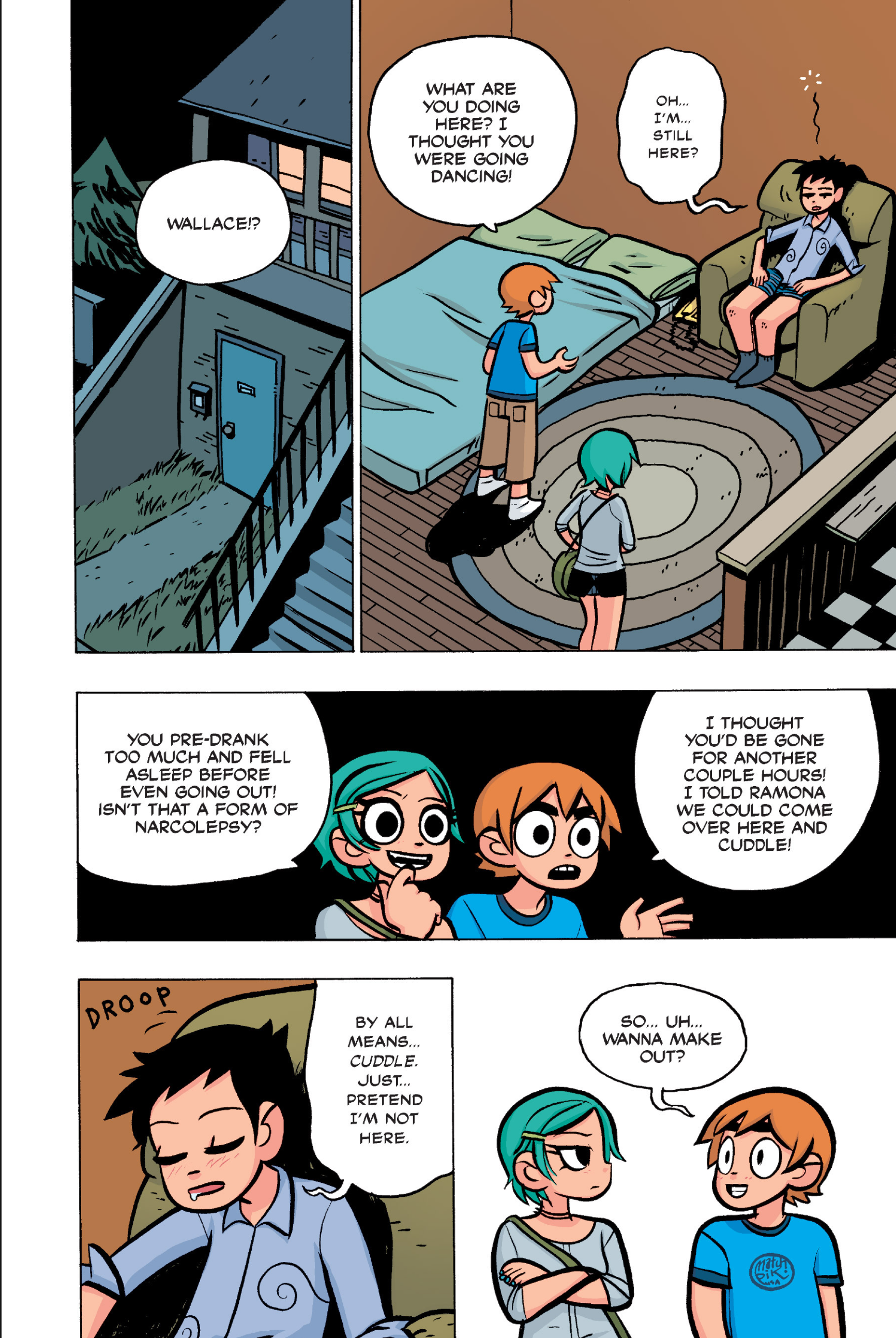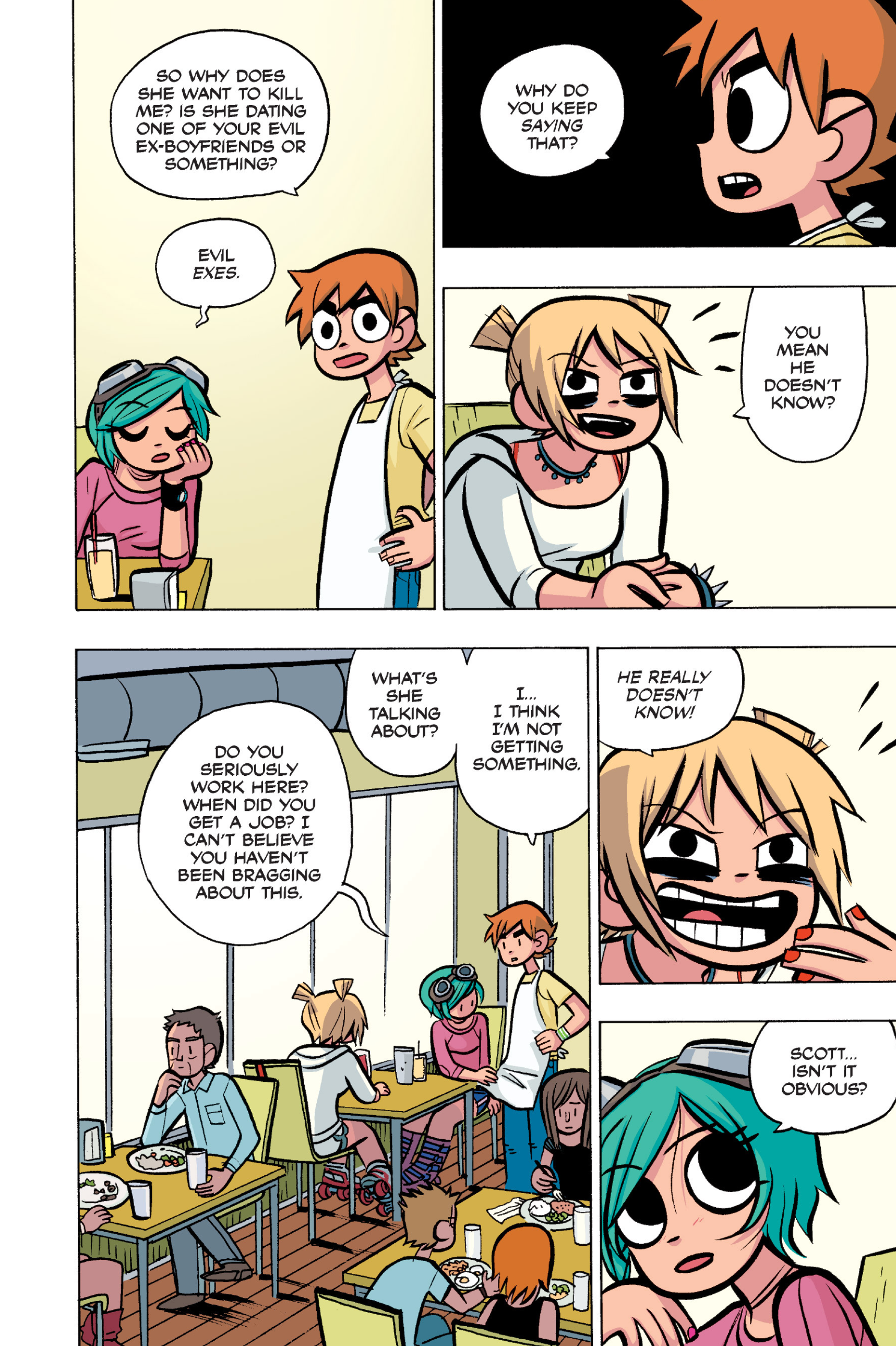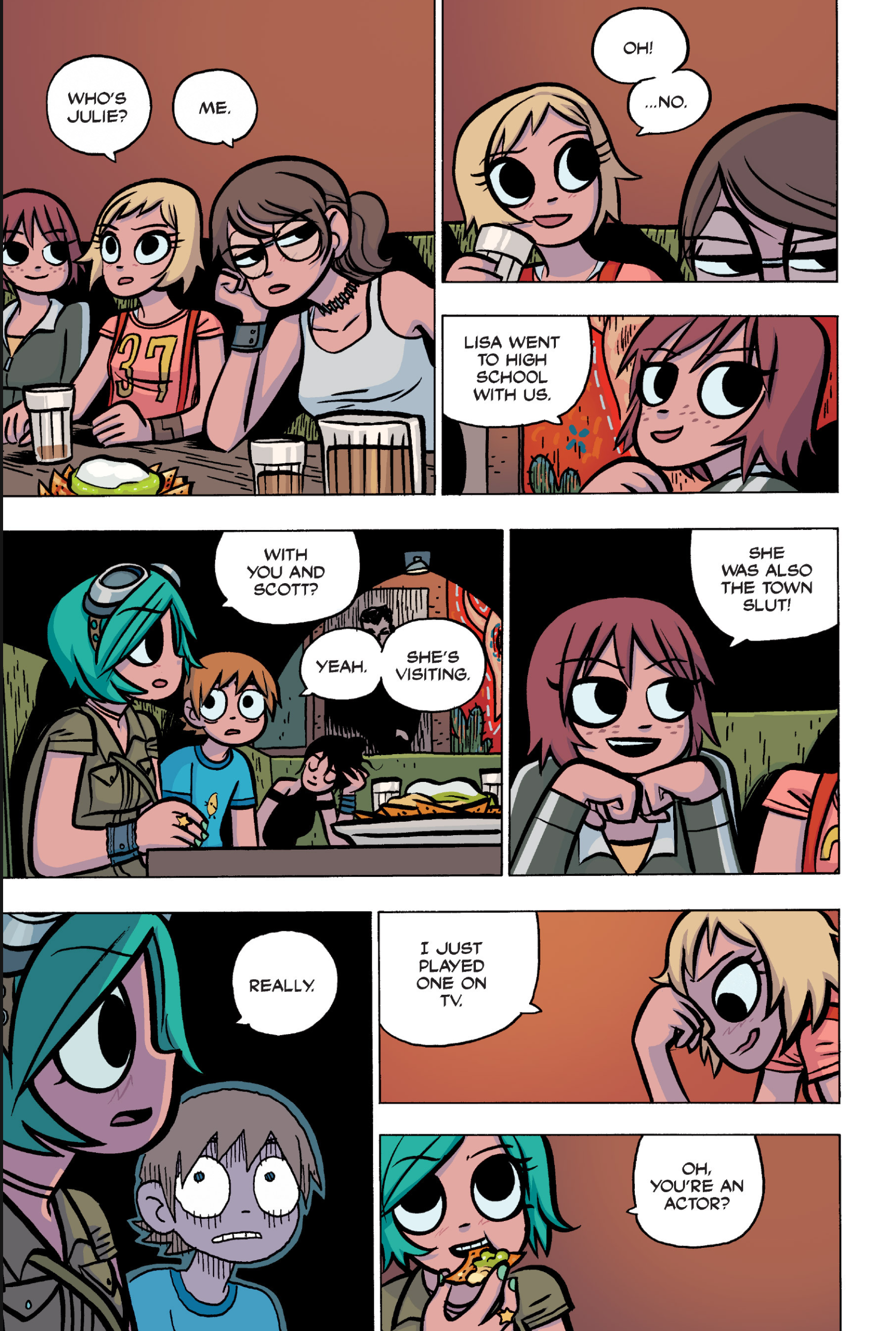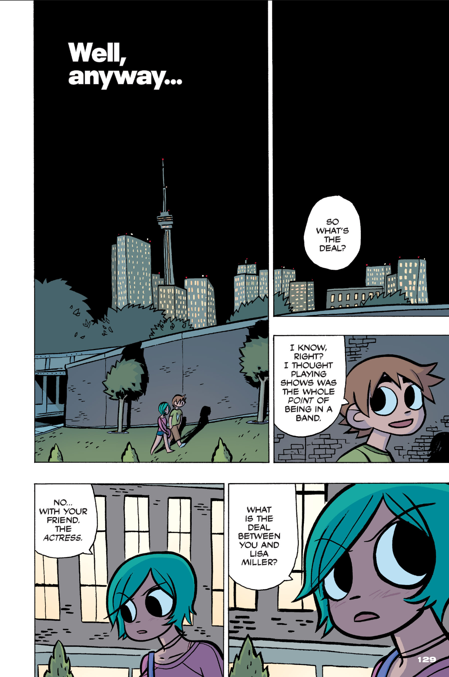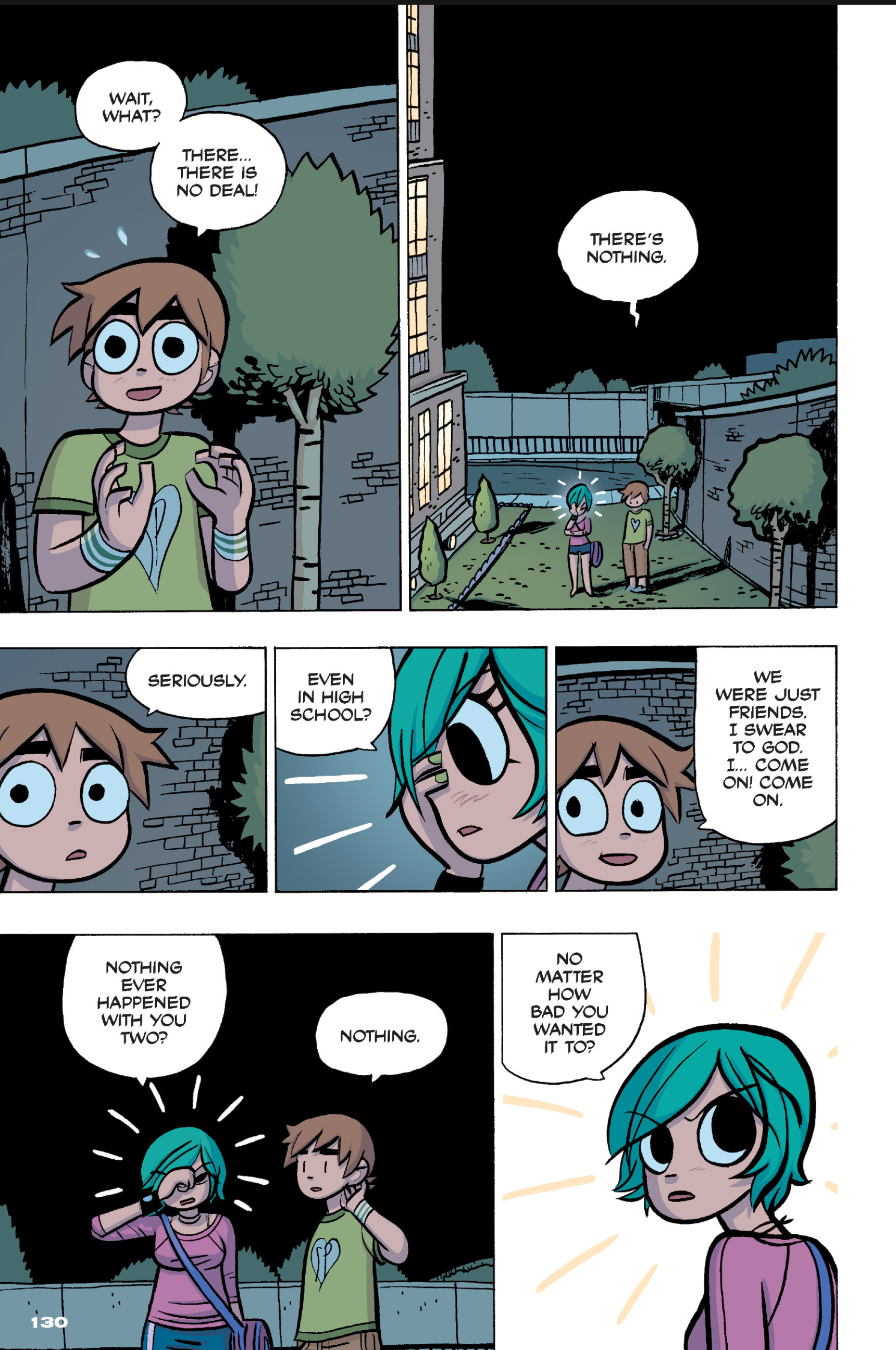 >>152870963I feel like this conversation is just sort of a sample of the entire comic: shallow small talk filled with simple, small lies that are immediately called out upon, as proof that the participants are posers and/or assholes. Why would Ramona even feel the need to lie about this?