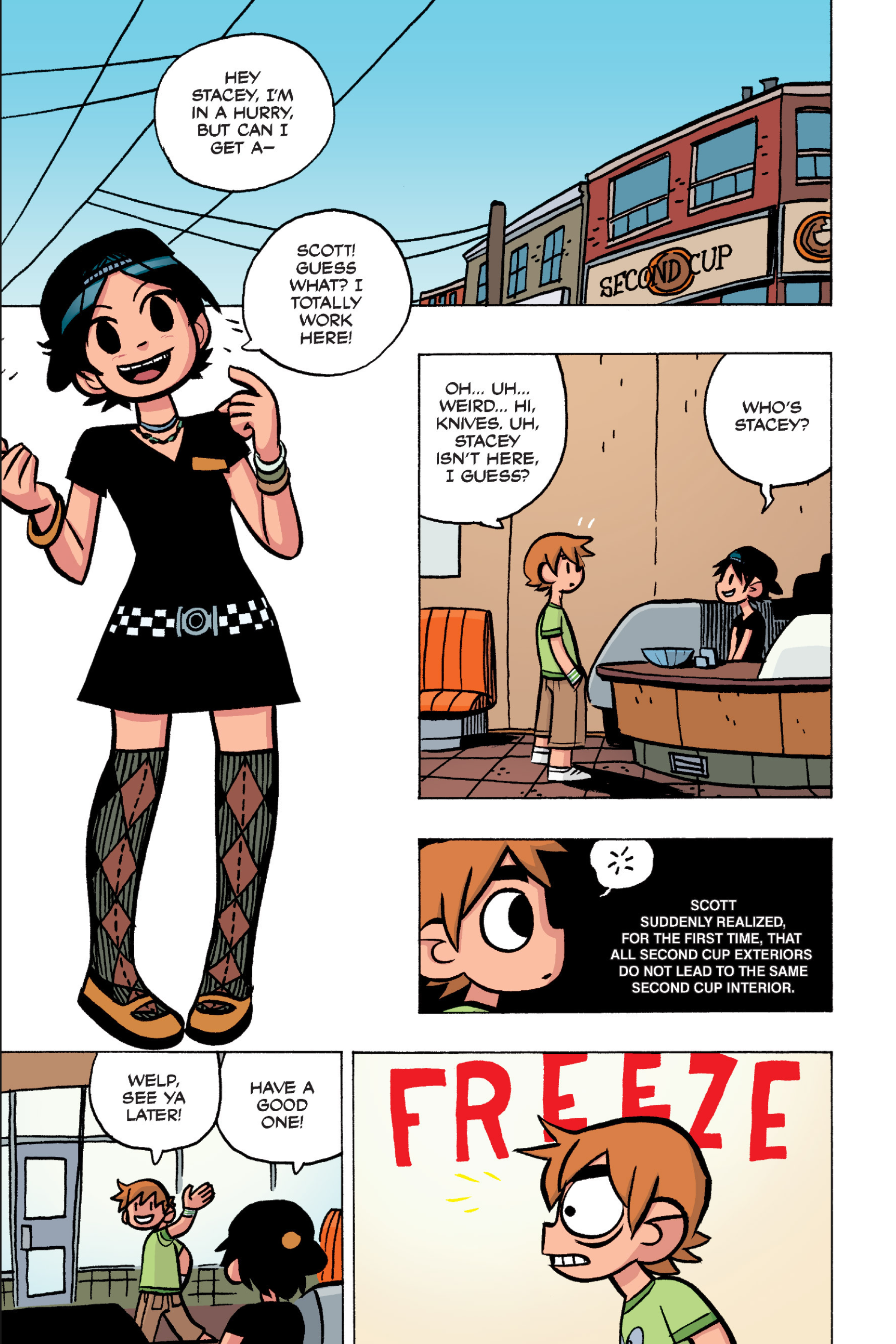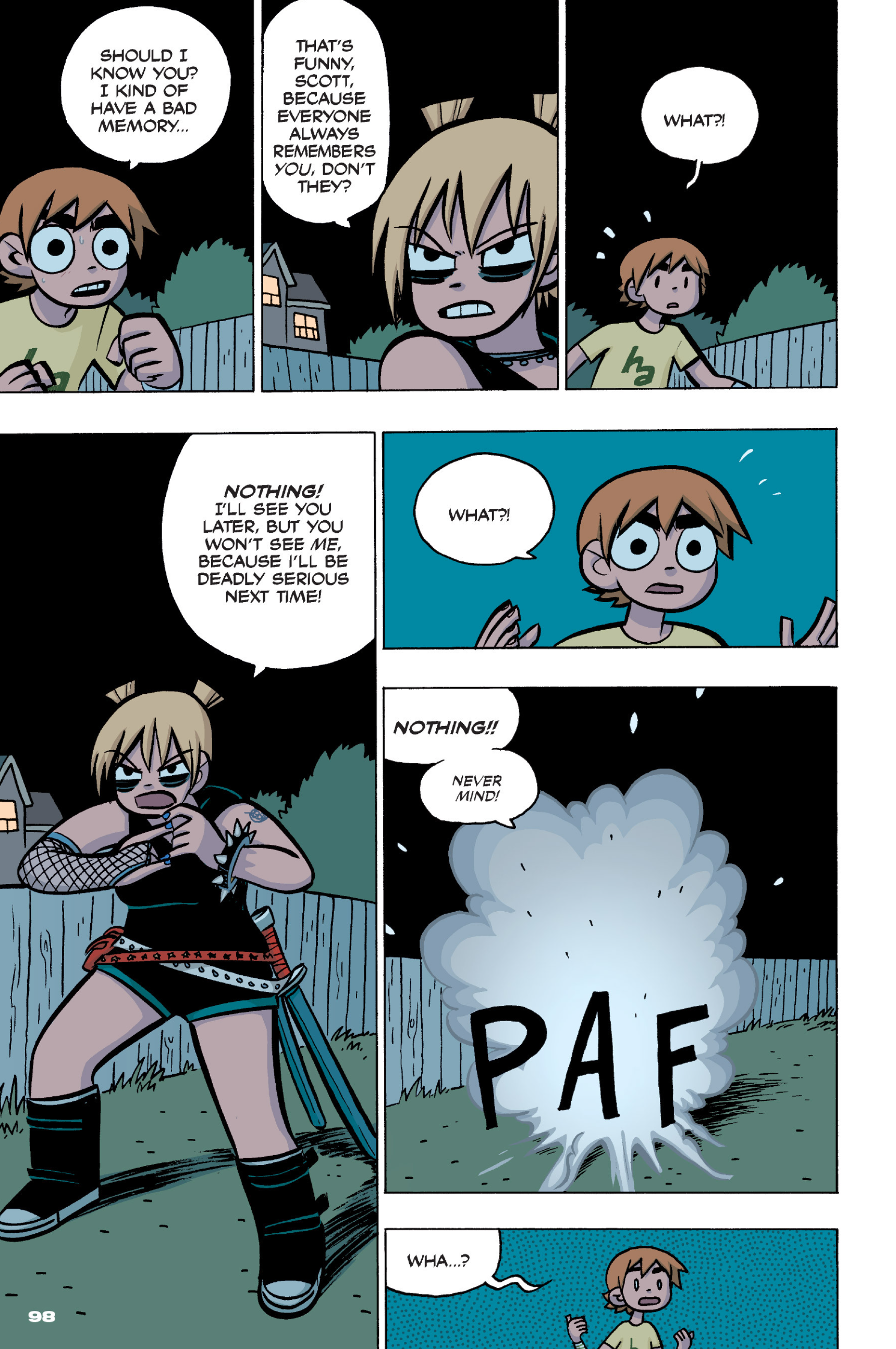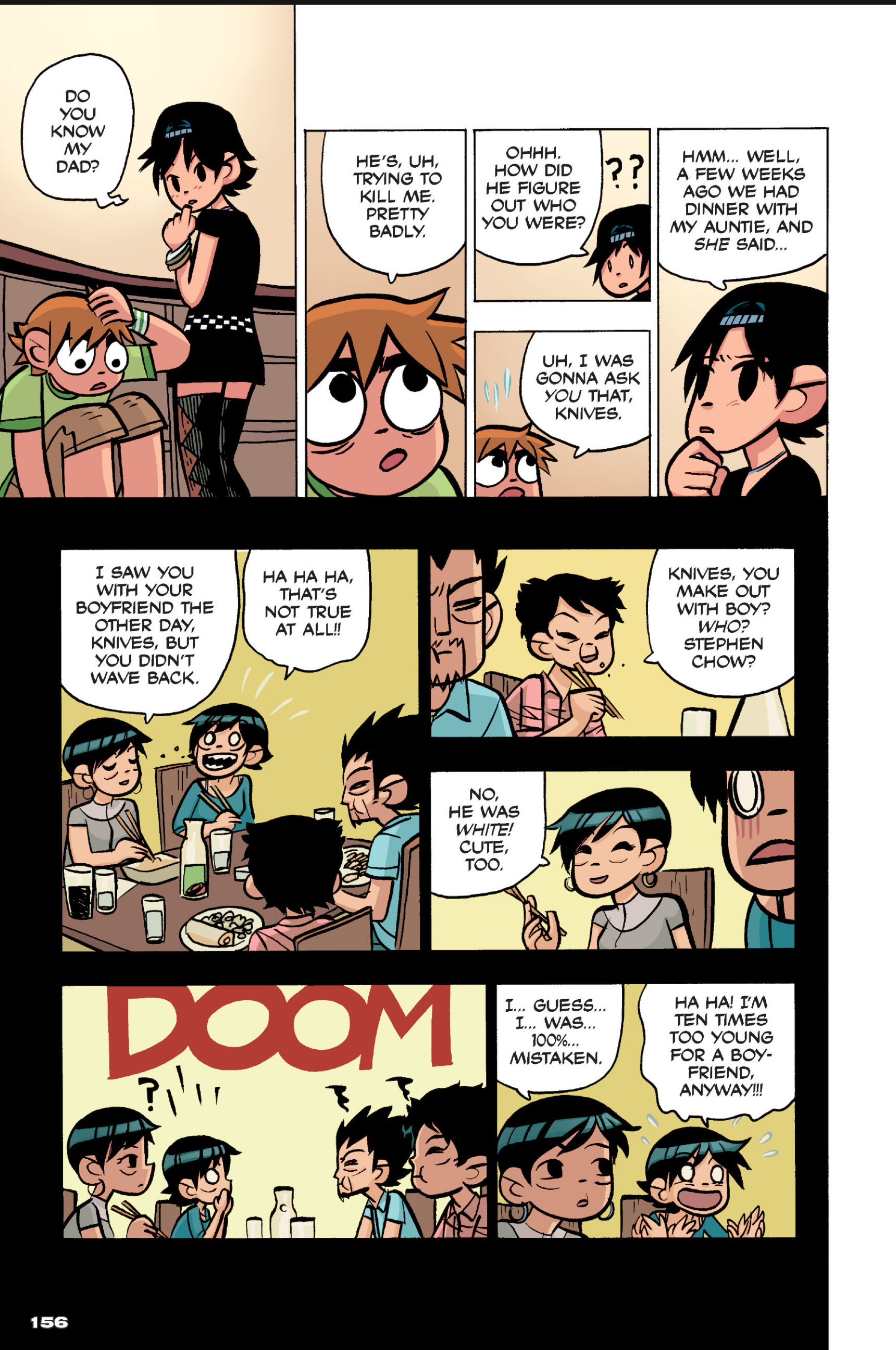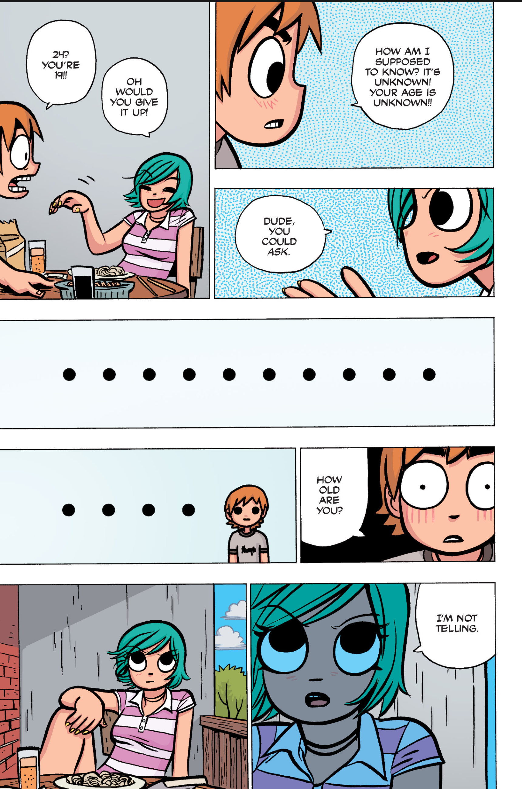 >>152870963I feel like this conversation is just sort of a sample of the entire comic: shallow small talk filled with simple, small lies that are immediately called out upon, as proof that the participants are posers and/or assholes. Why would Ramona even feel the need to lie about this?