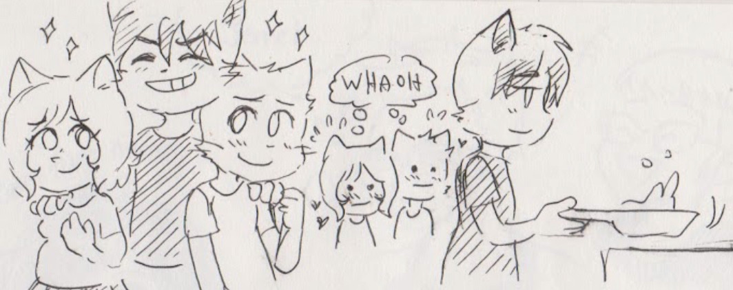 New BCI out. Apparently Paulo divorces Daisy and starts dating both Mike and Lucy> Doodles of older versions of Mike, Lucy, and Paulo from the webcomic Bittersweet Candy Bowl. They’re meant to be goofy drawings that take place after Family Planning, when Paulo returns to Roseville. There is an implication he is in a romantic relationship with the both of them.>>In the first doodle Paulo has his hands on Mike and Lucy’s shoulders, grinning proudly, while Mike and Lucy blush and smile towards him. The second doodle shows Paulo making a stir-fry, clearly becoming their book, and Mike and Lucy stare blushing with hearts coming out thinking “WHAOH"