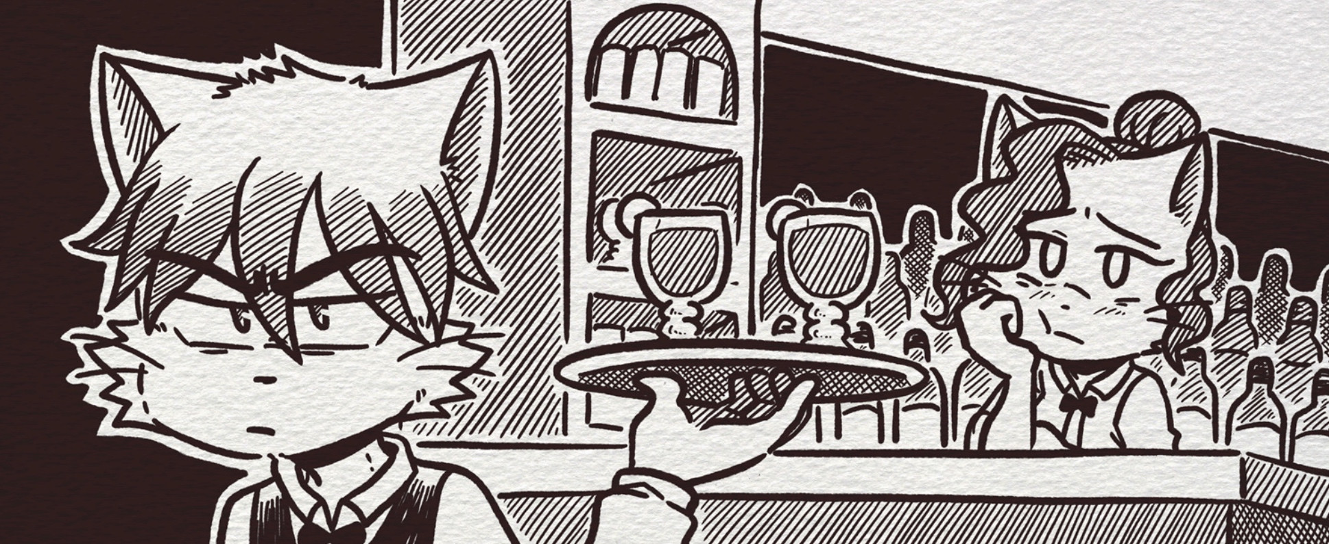 >>152943720Finally taeshi's degeneracy arcs can begin>A panel from the exclusive side comic “Family Planning” from the webcomic Bittersweet Candy Bowl.>>An older Paulo is working his server job, walking away carrying two cocktails to his table, looking disgruntled and angry, while the bartender stares at him longingly with sadness in her eyes, from within her bar.