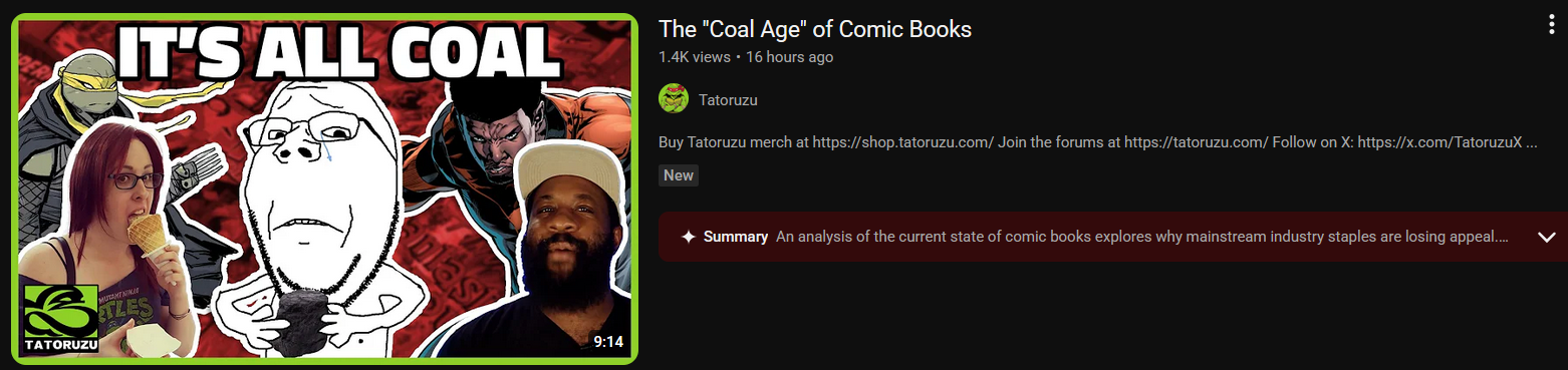 maybe it's just me but I find a lot of comic book youtube is just people summarizing what happened in a book/run no doubt because a lot of normalfags don't actually read comics but want comics read to them. like audiobooks or something. I get why but it sucks because as someone who does read comics these kinds of videos are boring to me in sure there are actually good channels out there but they probably don't get pushed much by youjewbe