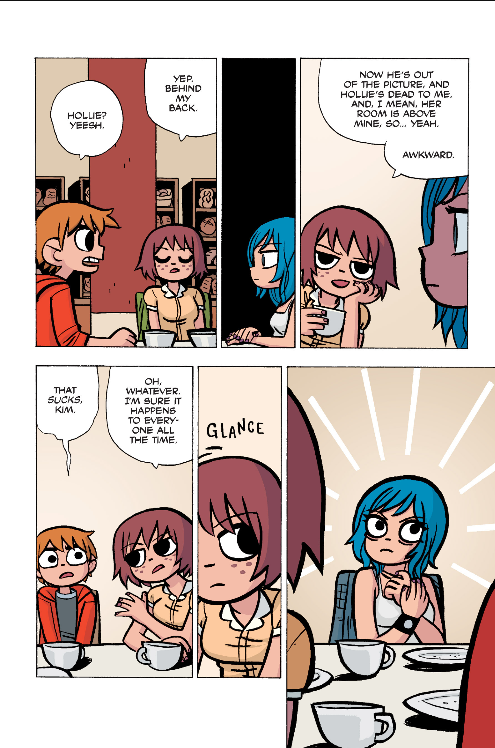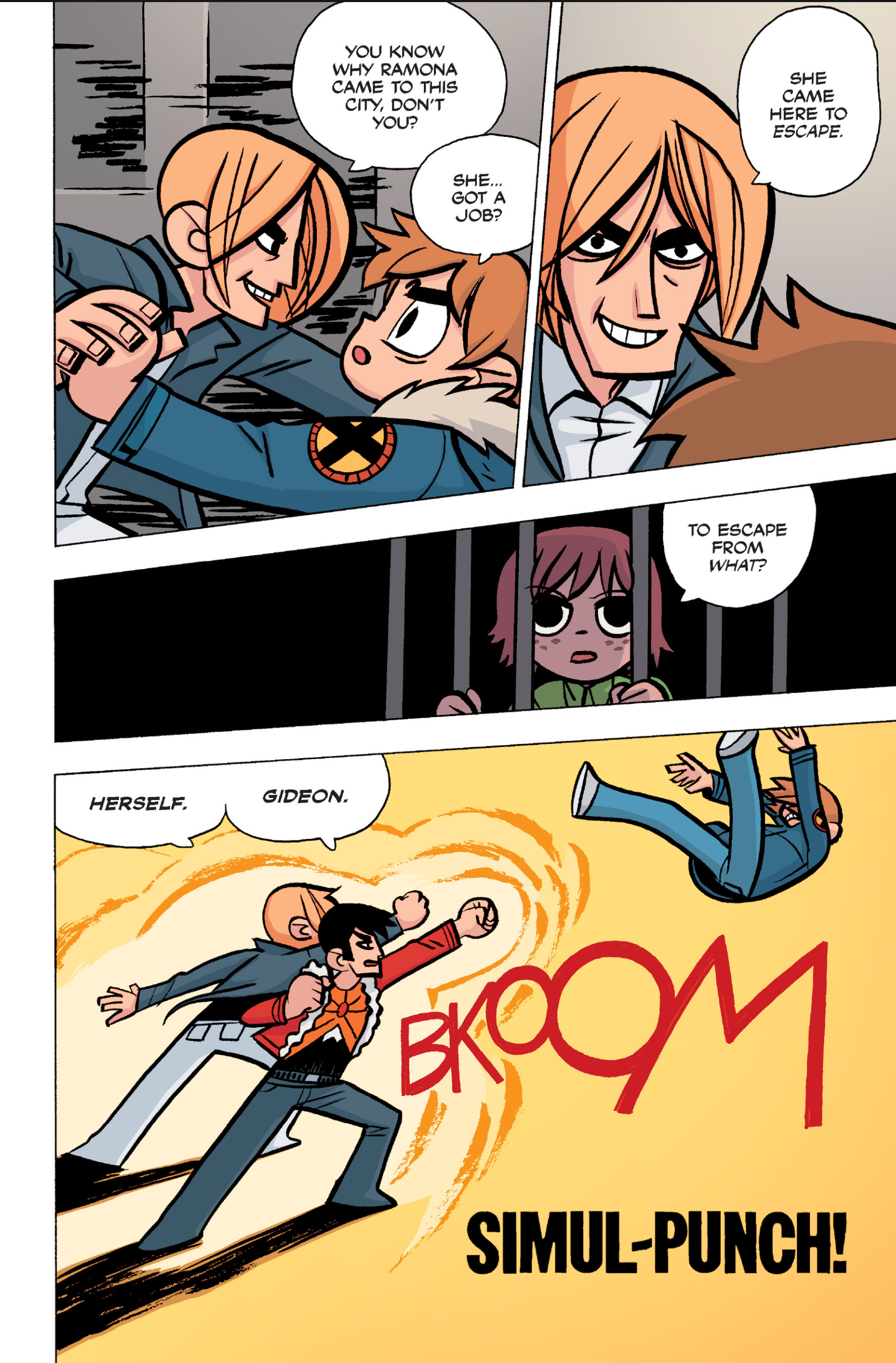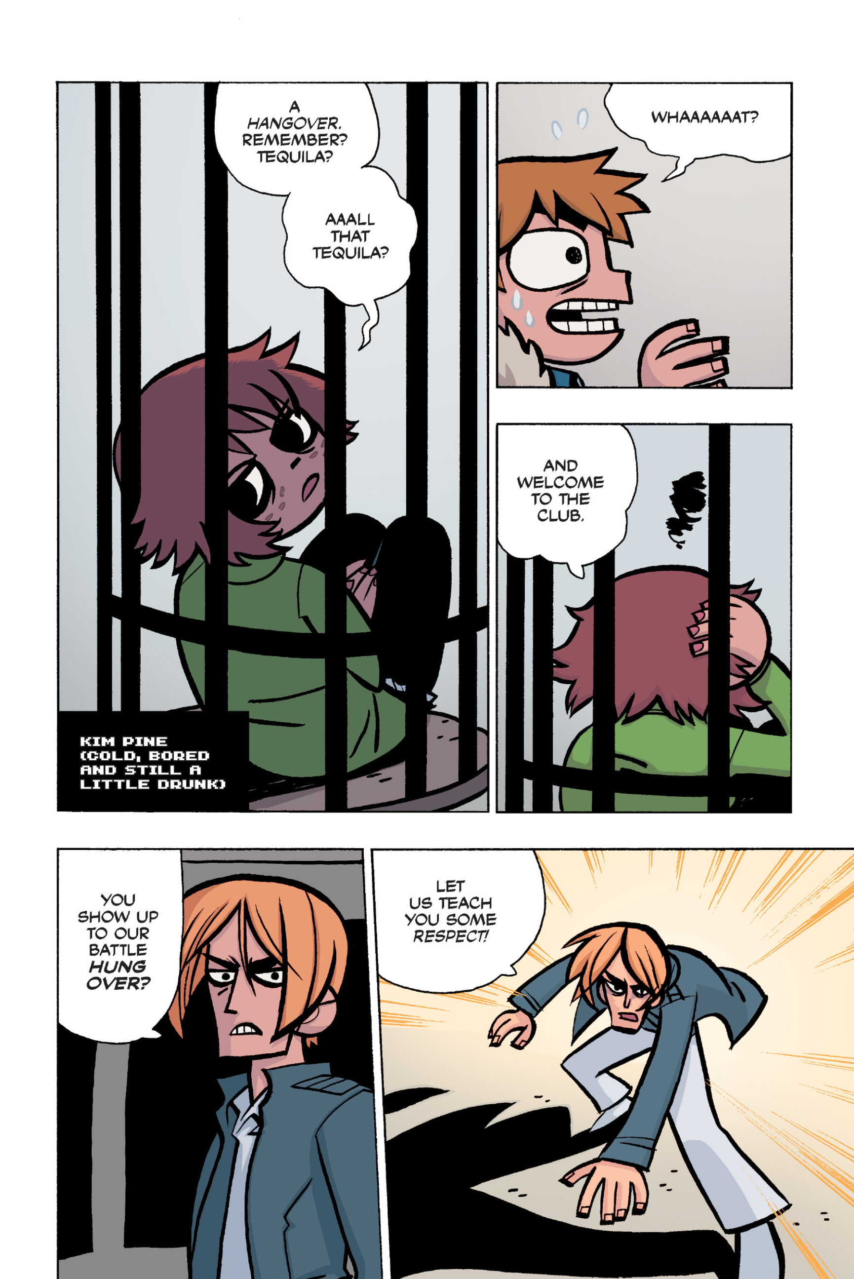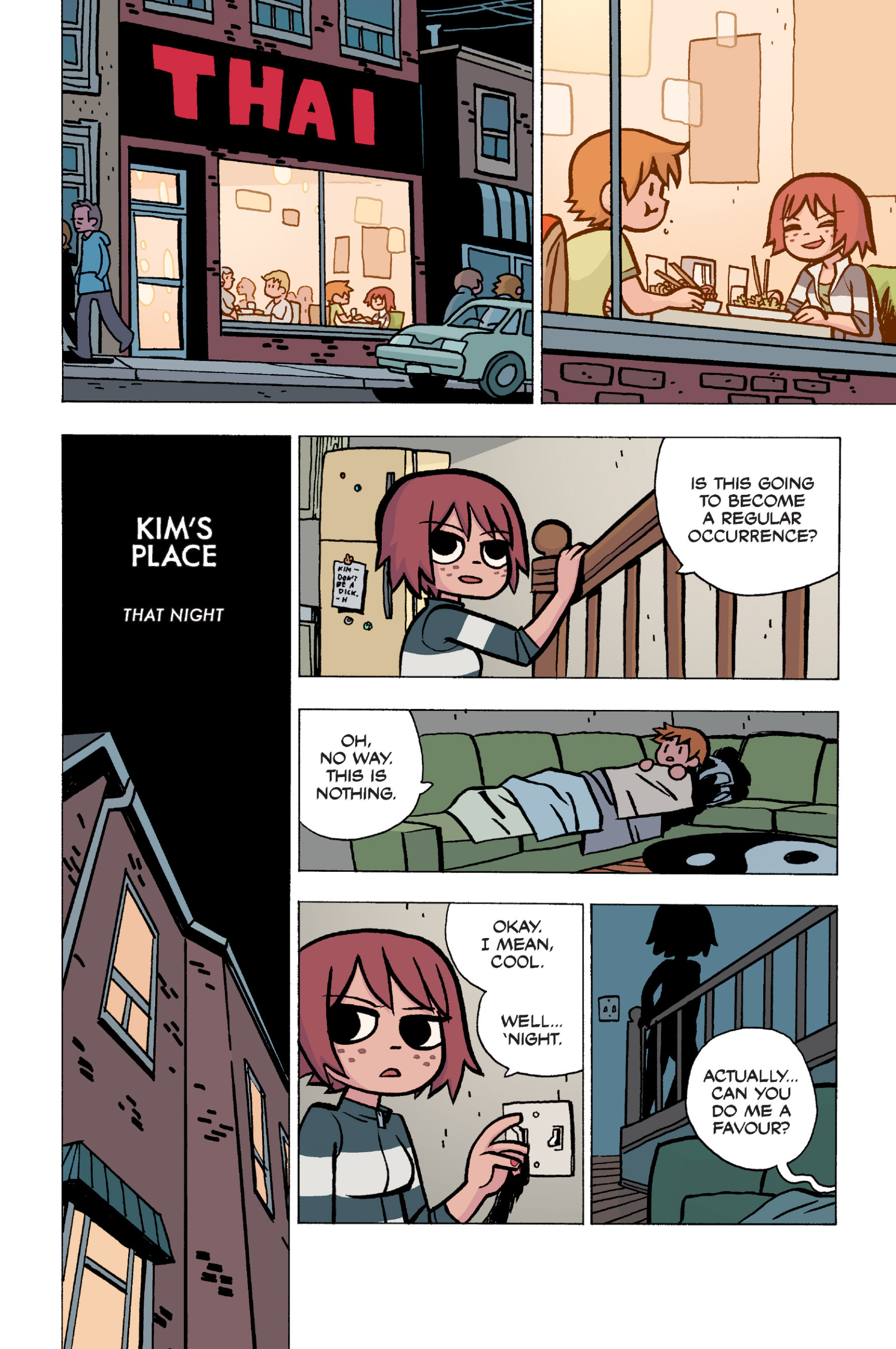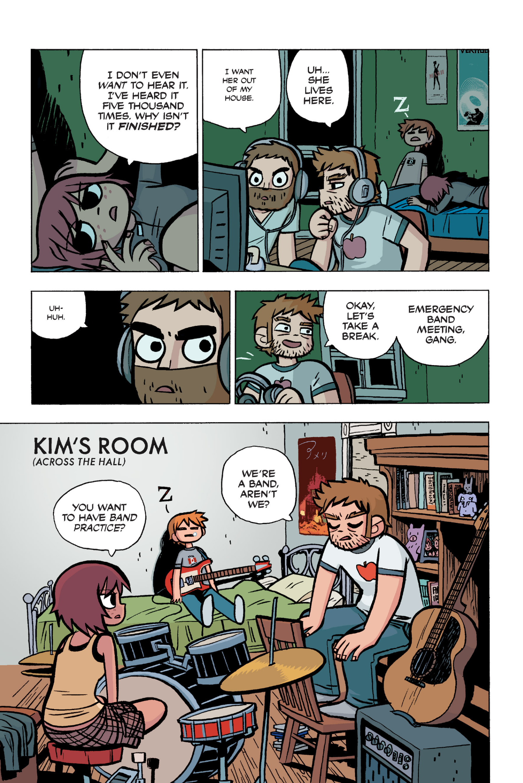 The comic never points this out but this is a particularly rough issue for Kim>No one givevs a shit about the band anymore due to their own issues, band left in limbo>Band performance cancelled because Scott is a disaster>Constant fights with her friends/roommates>Gets cheated on and has to live with the girl responsible>Kidnapped by two psycho's, when her ex shows up, has to lie to get him motivated because she's not enough on her own>Said ex then shows up on her doorstep, have to awkwardly share a bed with someone you clearly still have some level of buried affection for underneath all the pain he inflicted on youI don't blame her for moving
