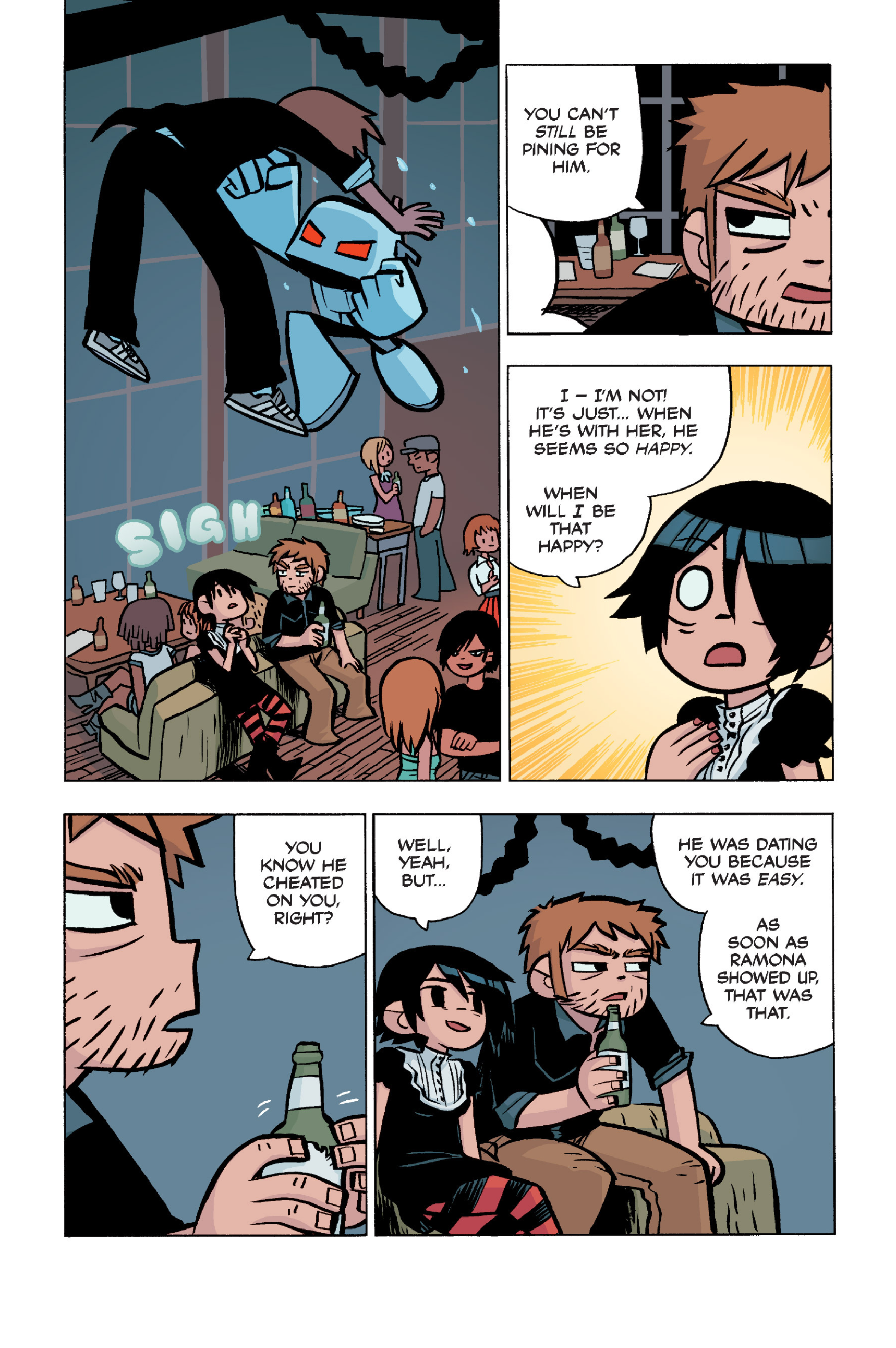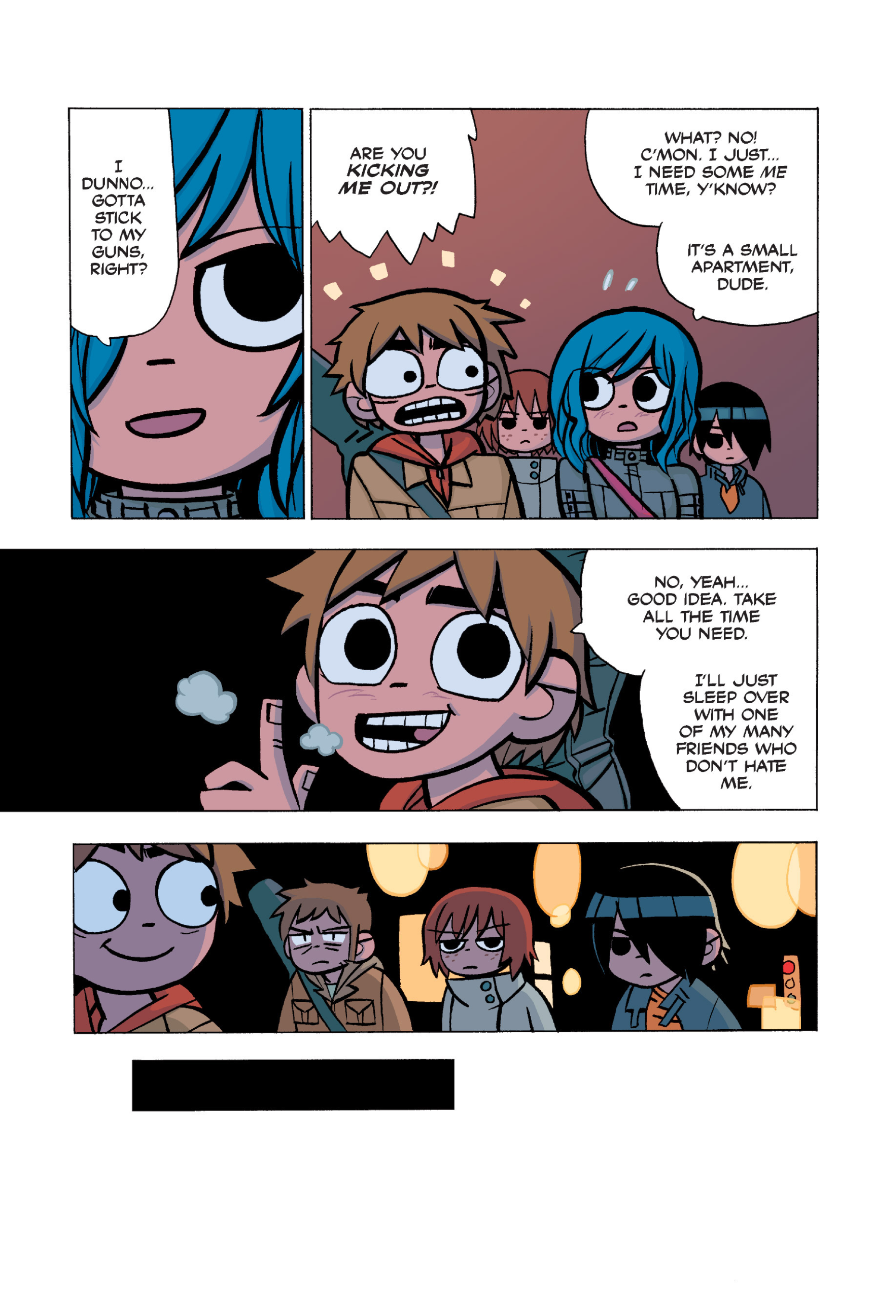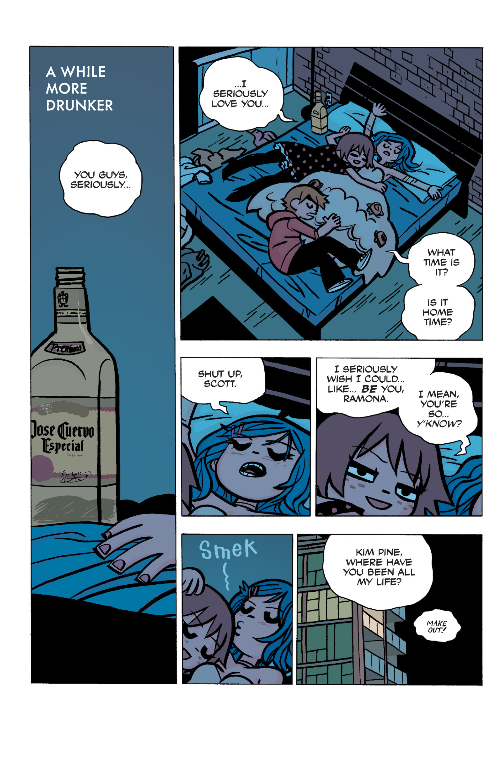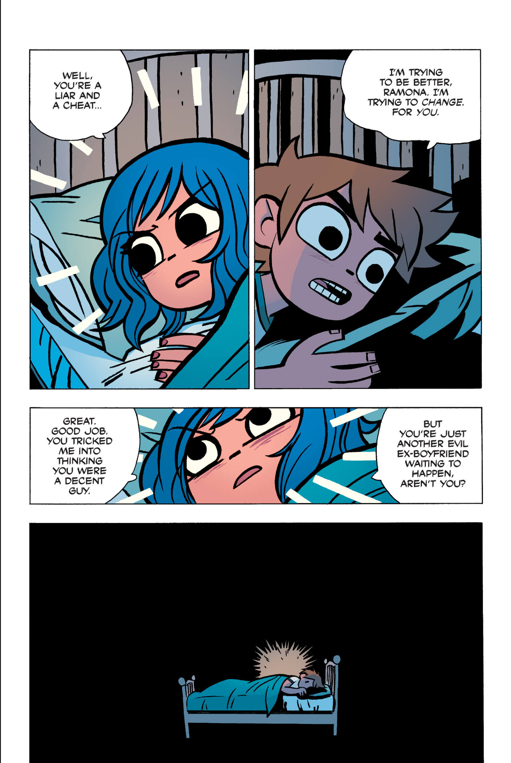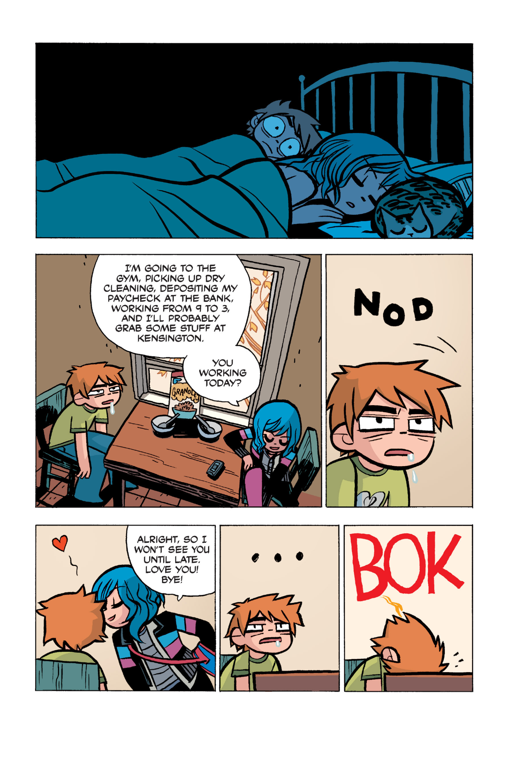 The comic never points this out but this is a particularly rough issue for Kim>No one givevs a shit about the band anymore due to their own issues, band left in limbo>Band performance cancelled because Scott is a disaster>Constant fights with her friends/roommates>Gets cheated on and has to live with the girl responsible>Kidnapped by two psycho's, when her ex shows up, has to lie to get him motivated because she's not enough on her own>Said ex then shows up on her doorstep, have to awkwardly share a bed with someone you clearly still have some level of buried affection for underneath all the pain he inflicted on youI don't blame her for moving