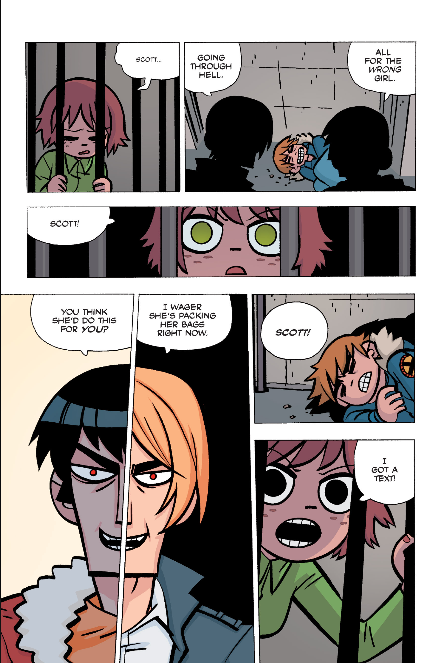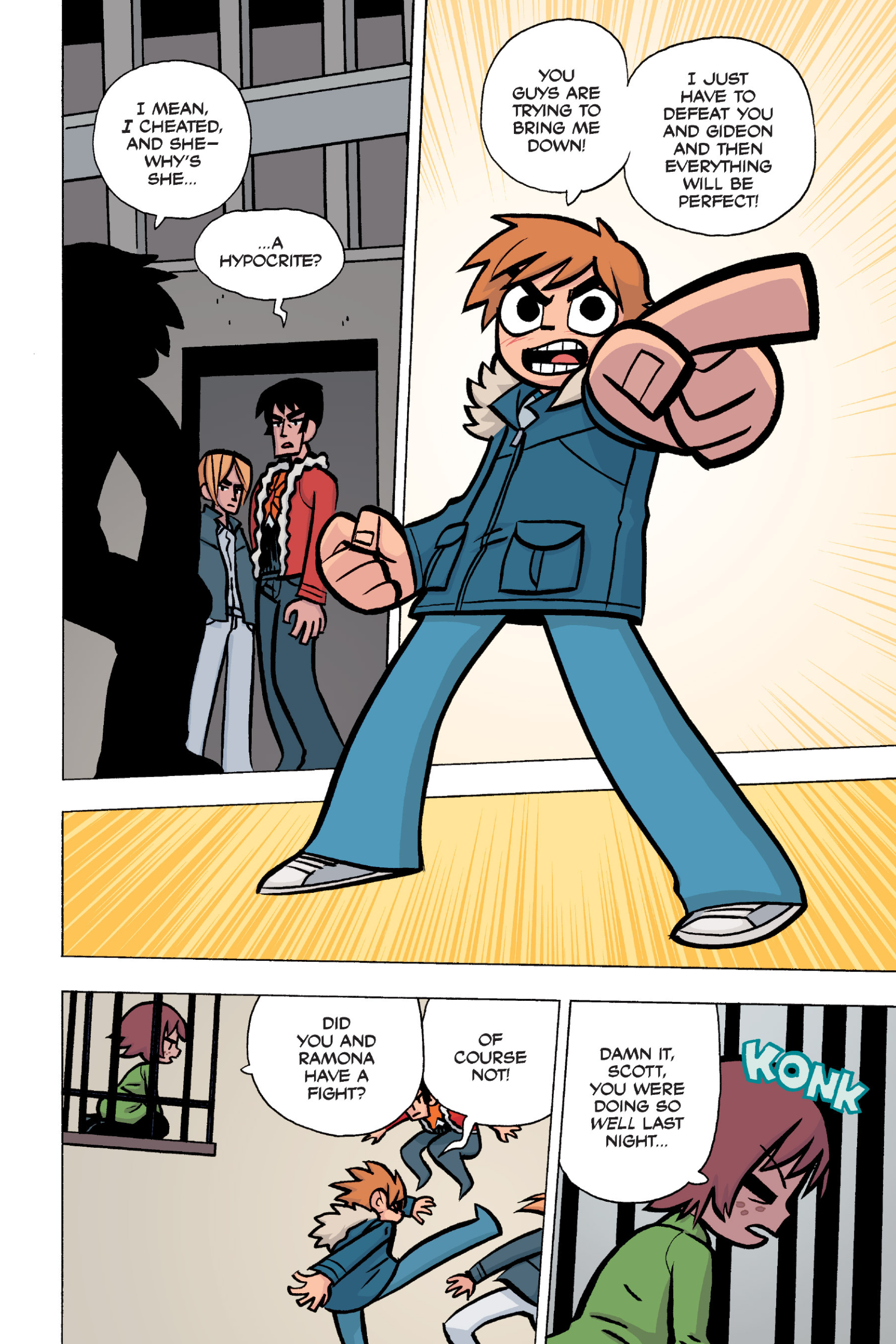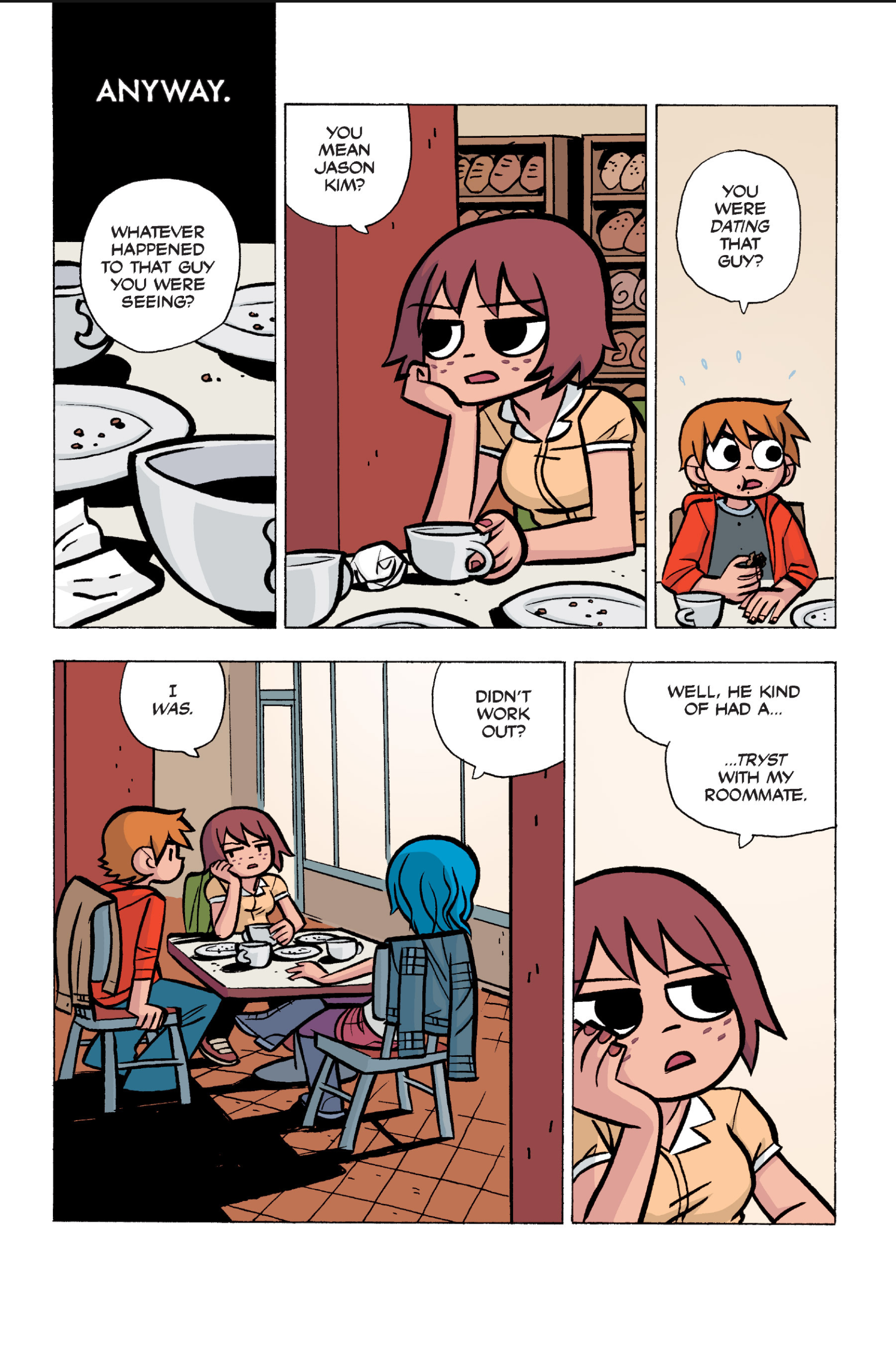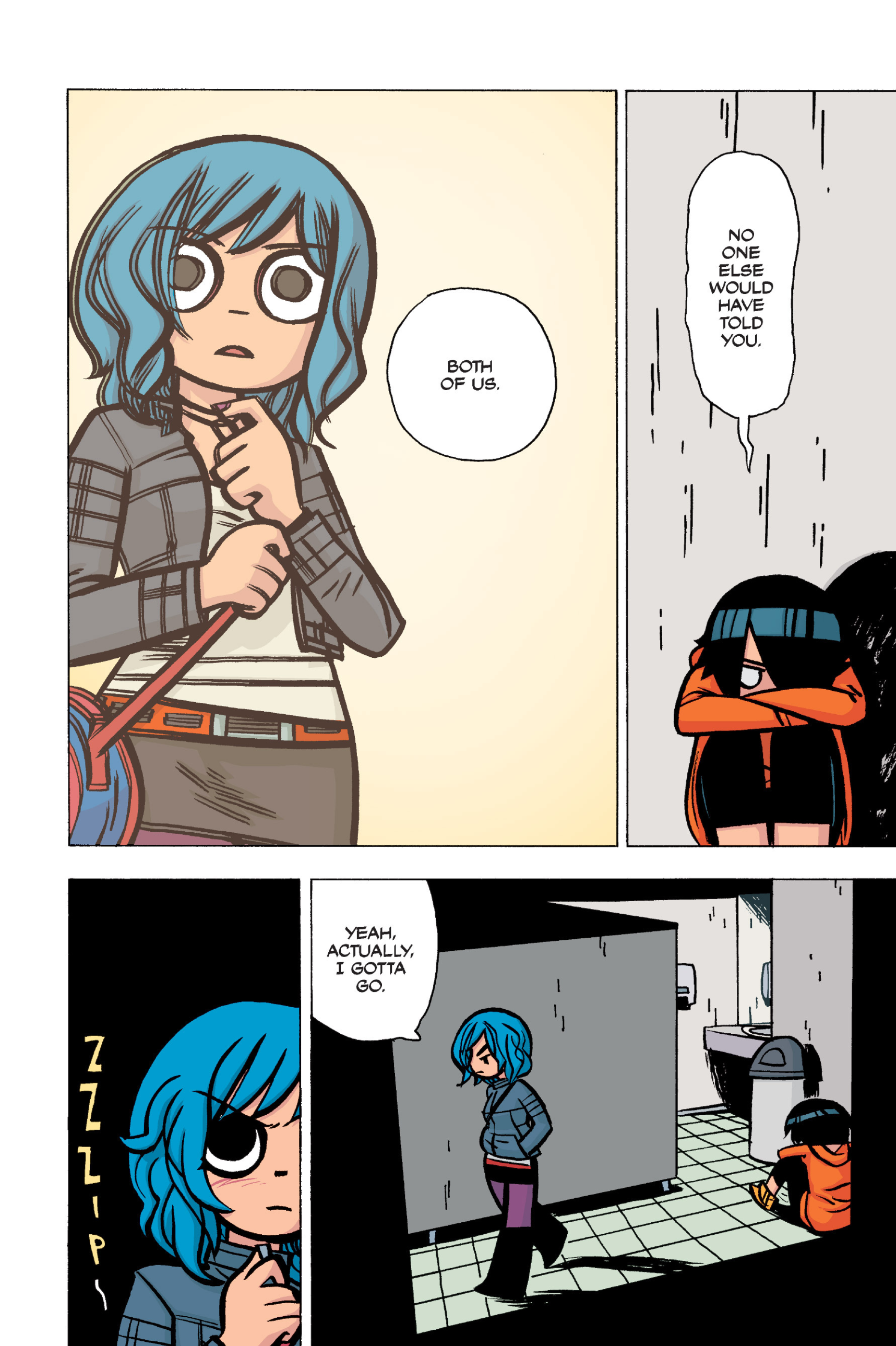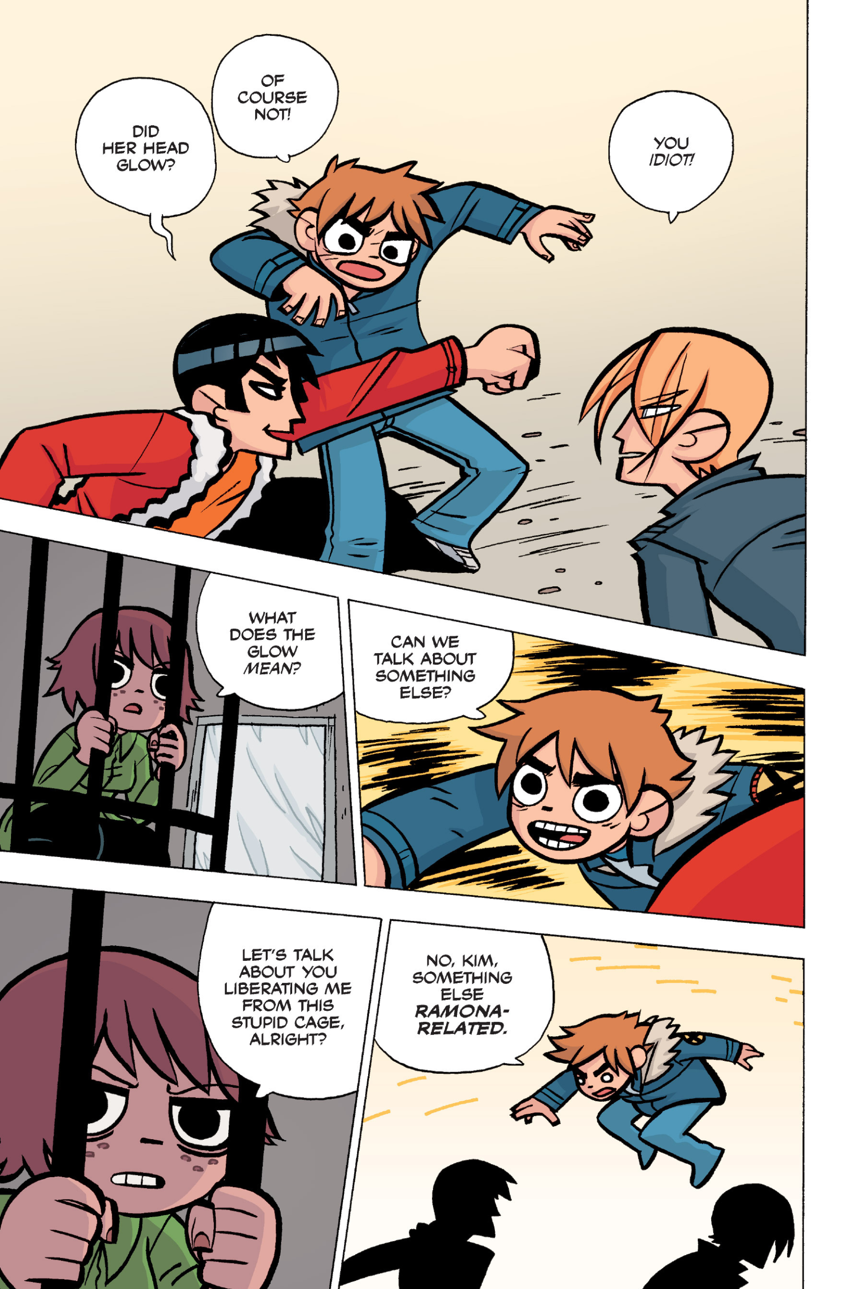 The comic never points this out but this is a particularly rough issue for Kim>No one givevs a shit about the band anymore due to their own issues, band left in limbo>Band performance cancelled because Scott is a disaster>Constant fights with her friends/roommates>Gets cheated on and has to live with the girl responsible>Kidnapped by two psycho's, when her ex shows up, has to lie to get him motivated because she's not enough on her own>Said ex then shows up on her doorstep, have to awkwardly share a bed with someone you clearly still have some level of buried affection for underneath all the pain he inflicted on youI don't blame her for moving