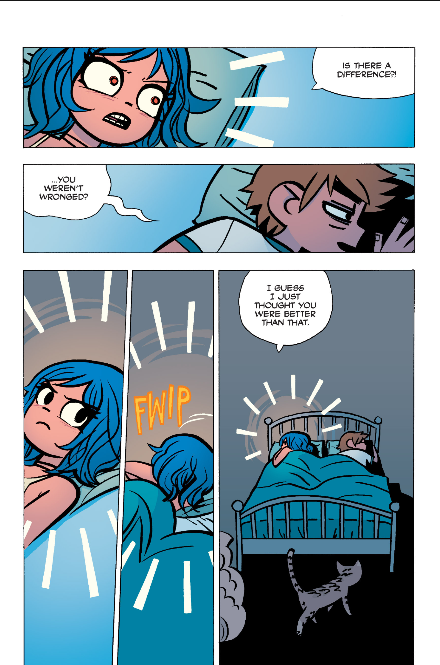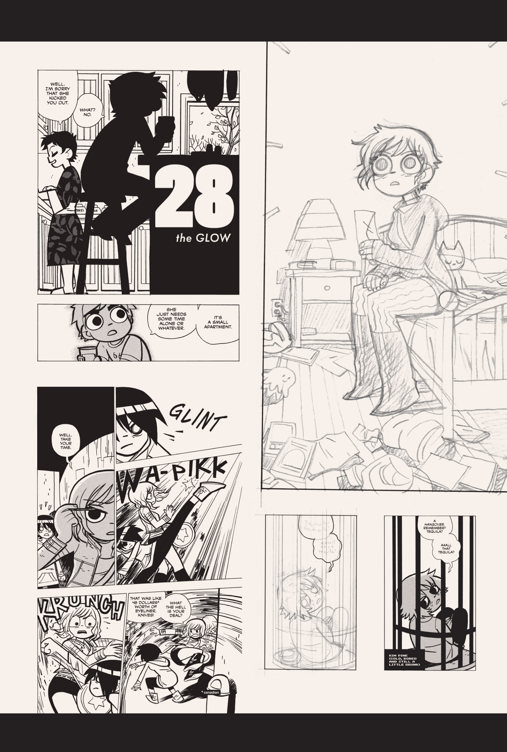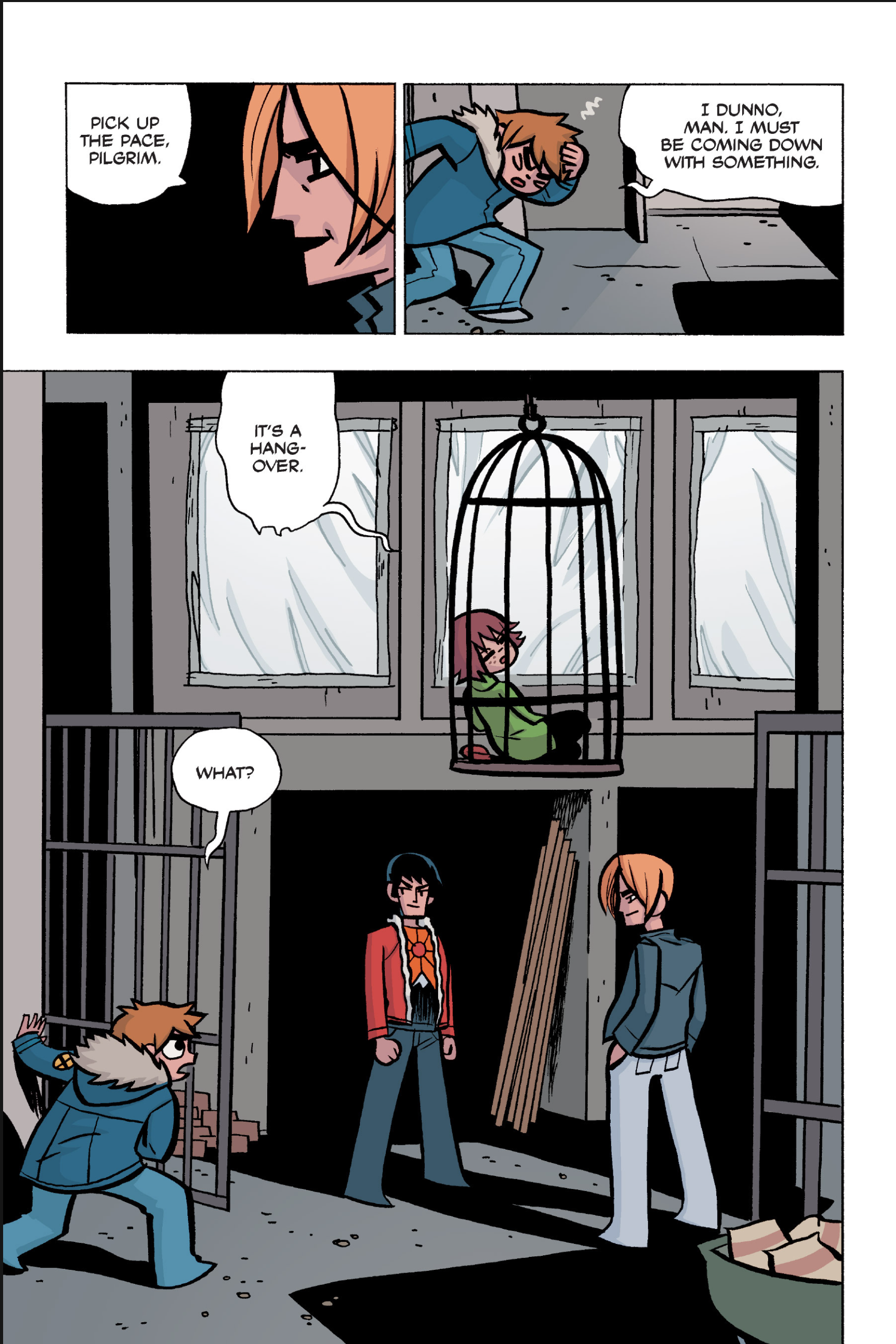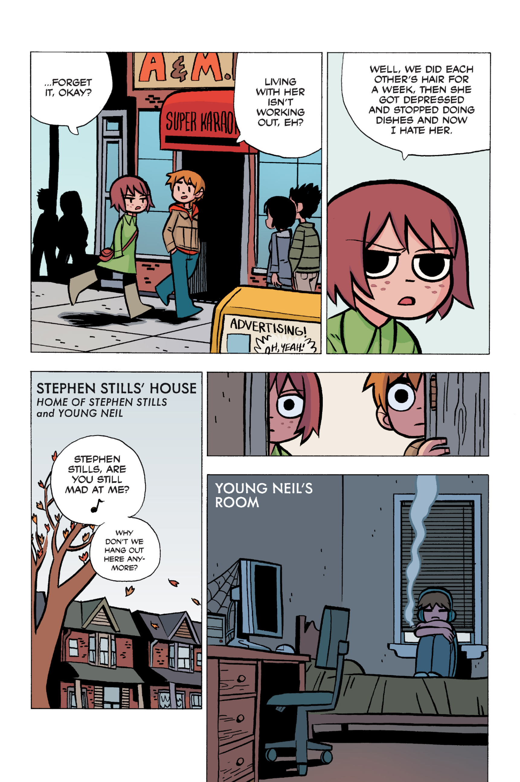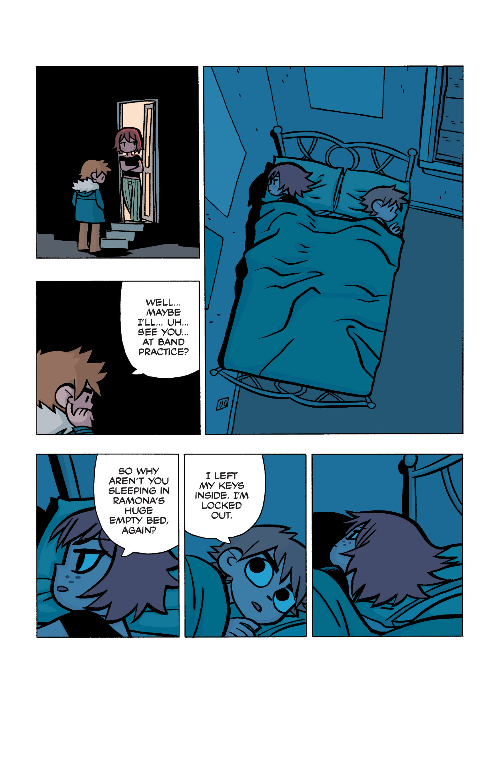 The comic never points this out but this is a particularly rough issue for Kim>No one givevs a shit about the band anymore due to their own issues, band left in limbo>Band performance cancelled because Scott is a disaster>Constant fights with her friends/roommates>Gets cheated on and has to live with the girl responsible>Kidnapped by two psycho's, when her ex shows up, has to lie to get him motivated because she's not enough on her own>Said ex then shows up on her doorstep, have to awkwardly share a bed with someone you clearly still have some level of buried affection for underneath all the pain he inflicted on youI don't blame her for moving