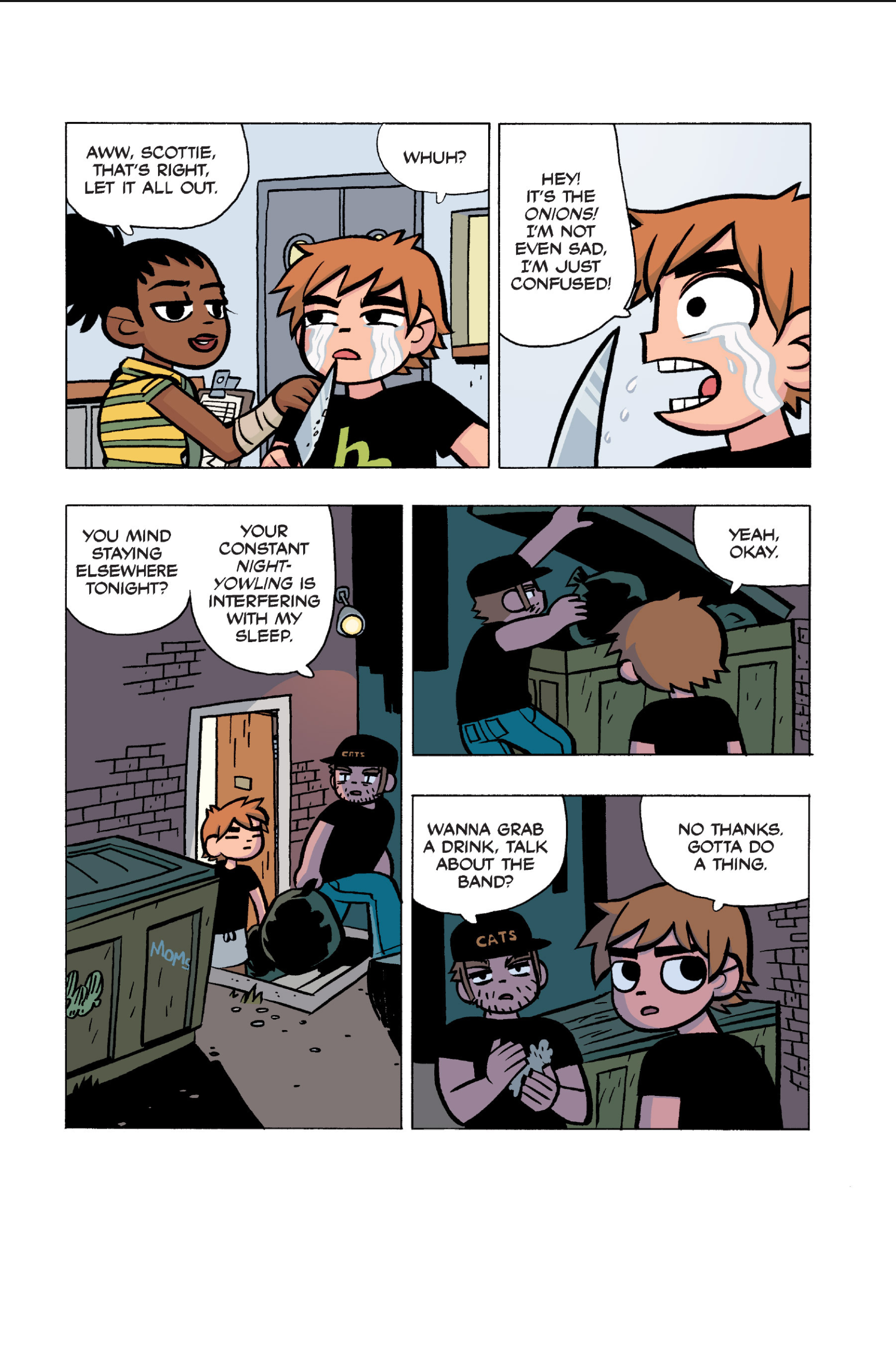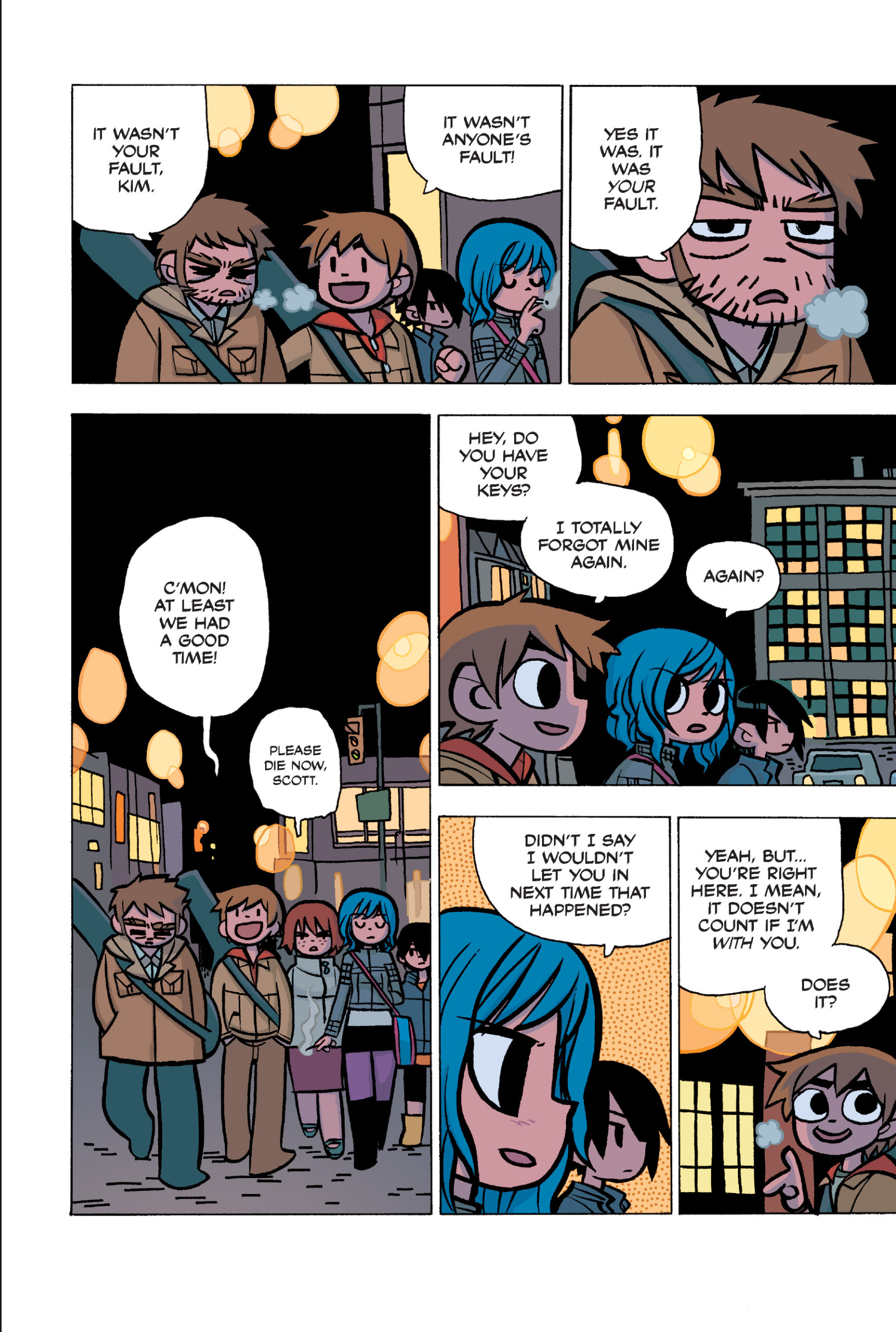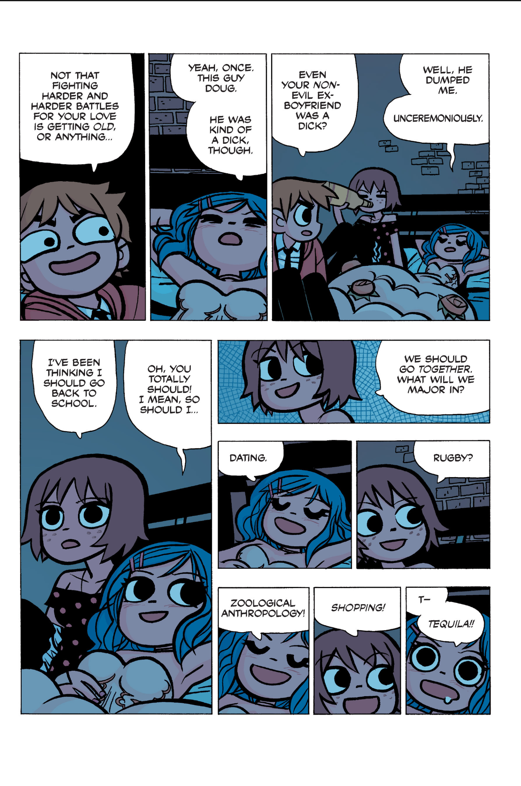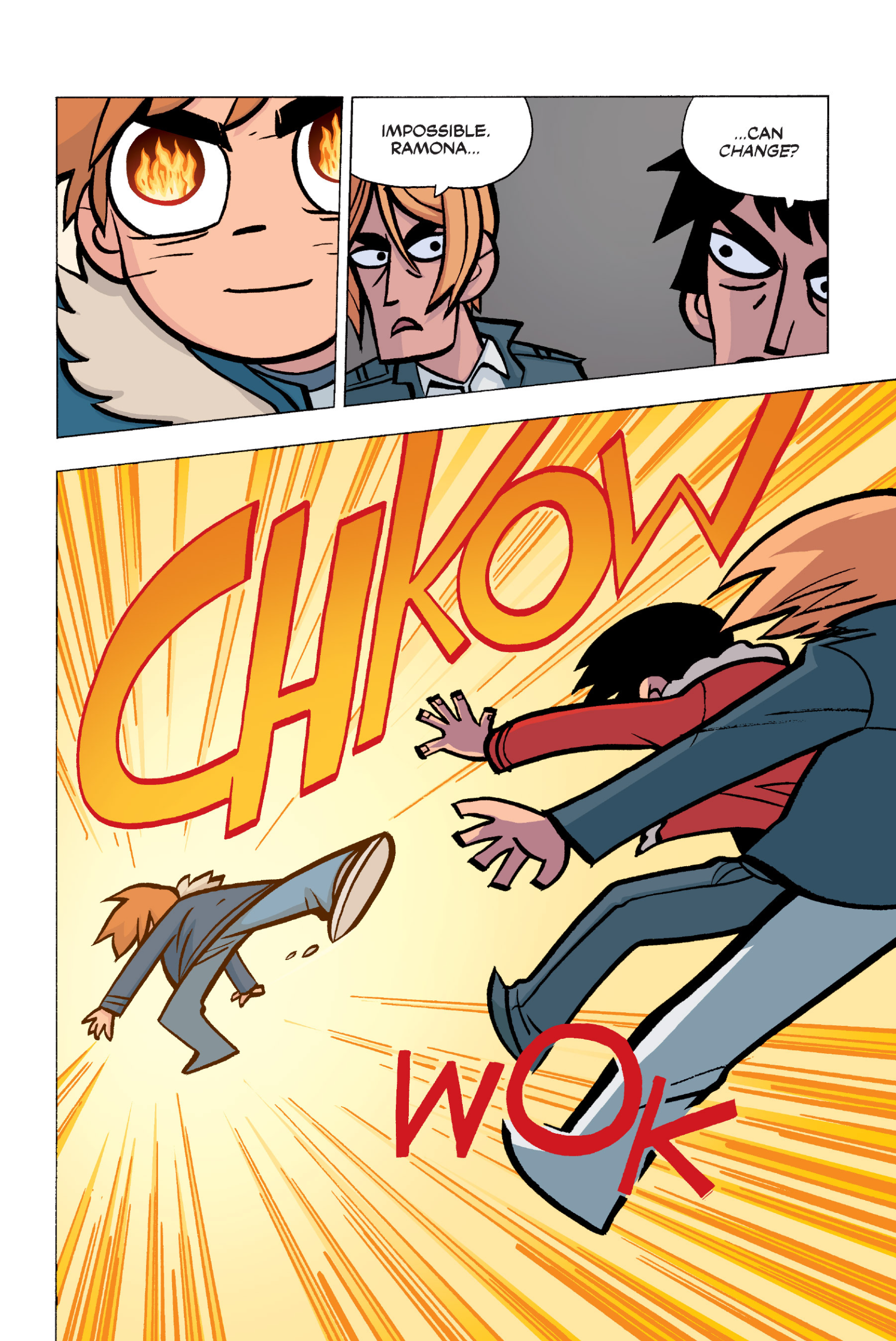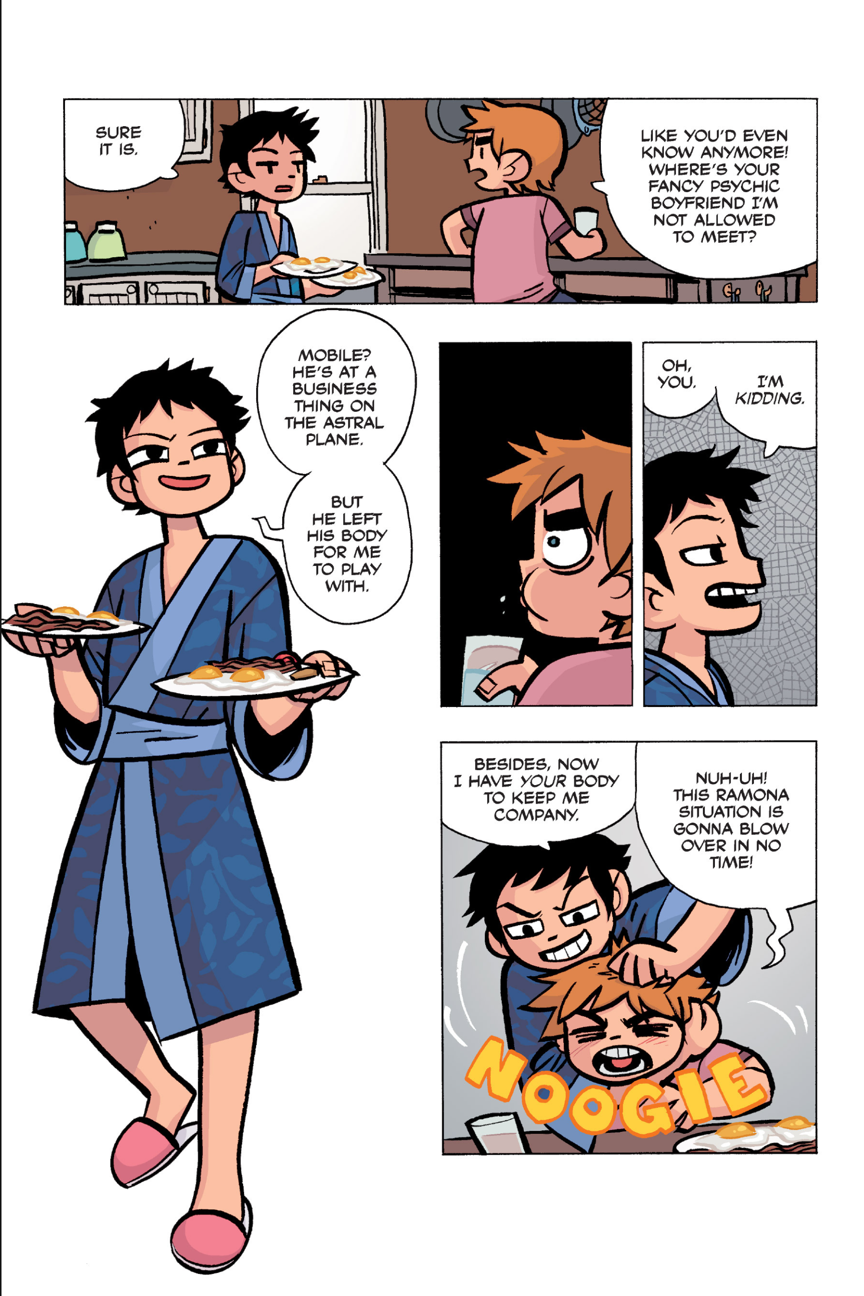 The comic never points this out but this is a particularly rough issue for Kim>No one givevs a shit about the band anymore due to their own issues, band left in limbo>Band performance cancelled because Scott is a disaster>Constant fights with her friends/roommates>Gets cheated on and has to live with the girl responsible>Kidnapped by two psycho's, when her ex shows up, has to lie to get him motivated because she's not enough on her own>Said ex then shows up on her doorstep, have to awkwardly share a bed with someone you clearly still have some level of buried affection for underneath all the pain he inflicted on youI don't blame her for moving