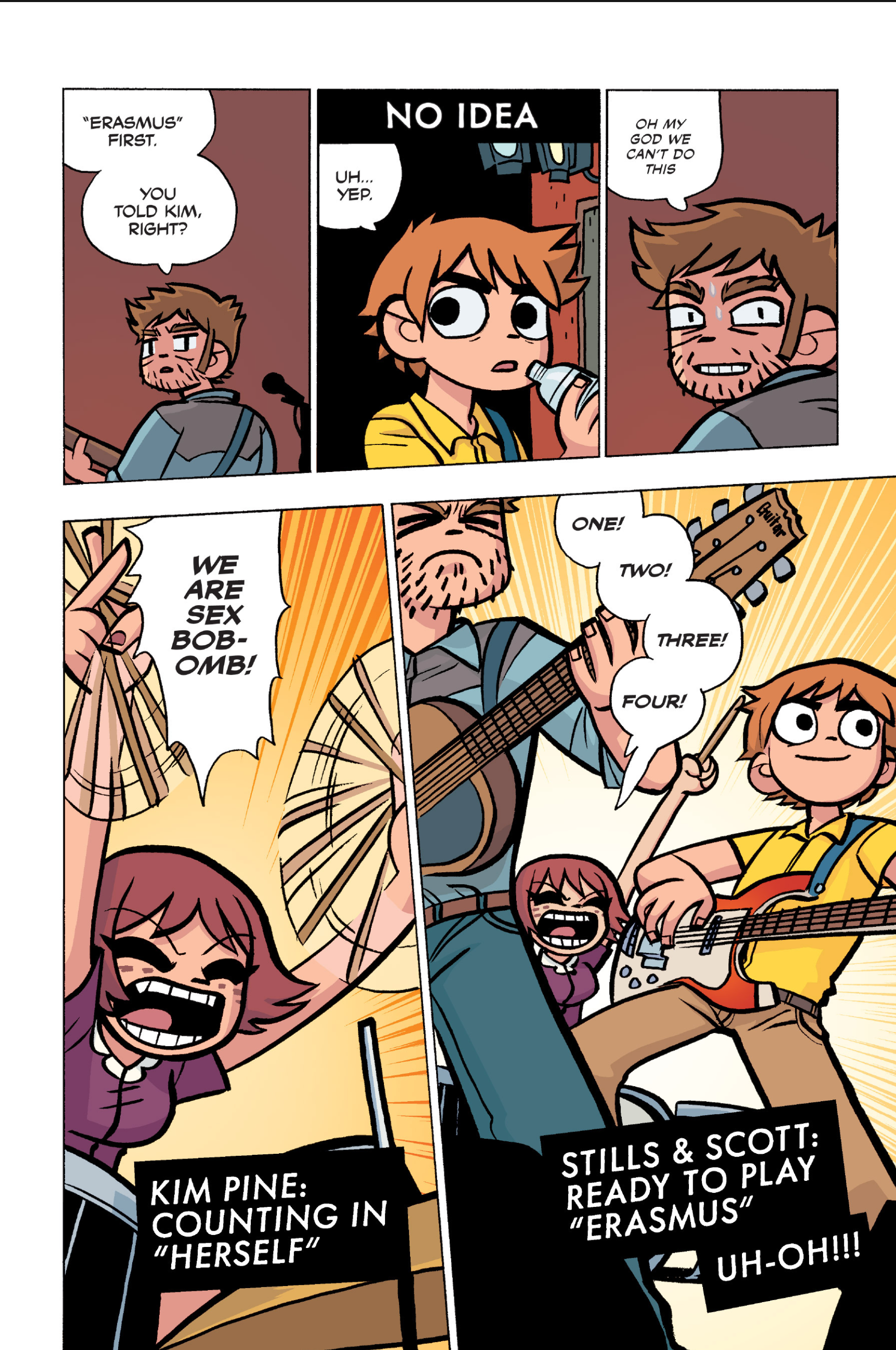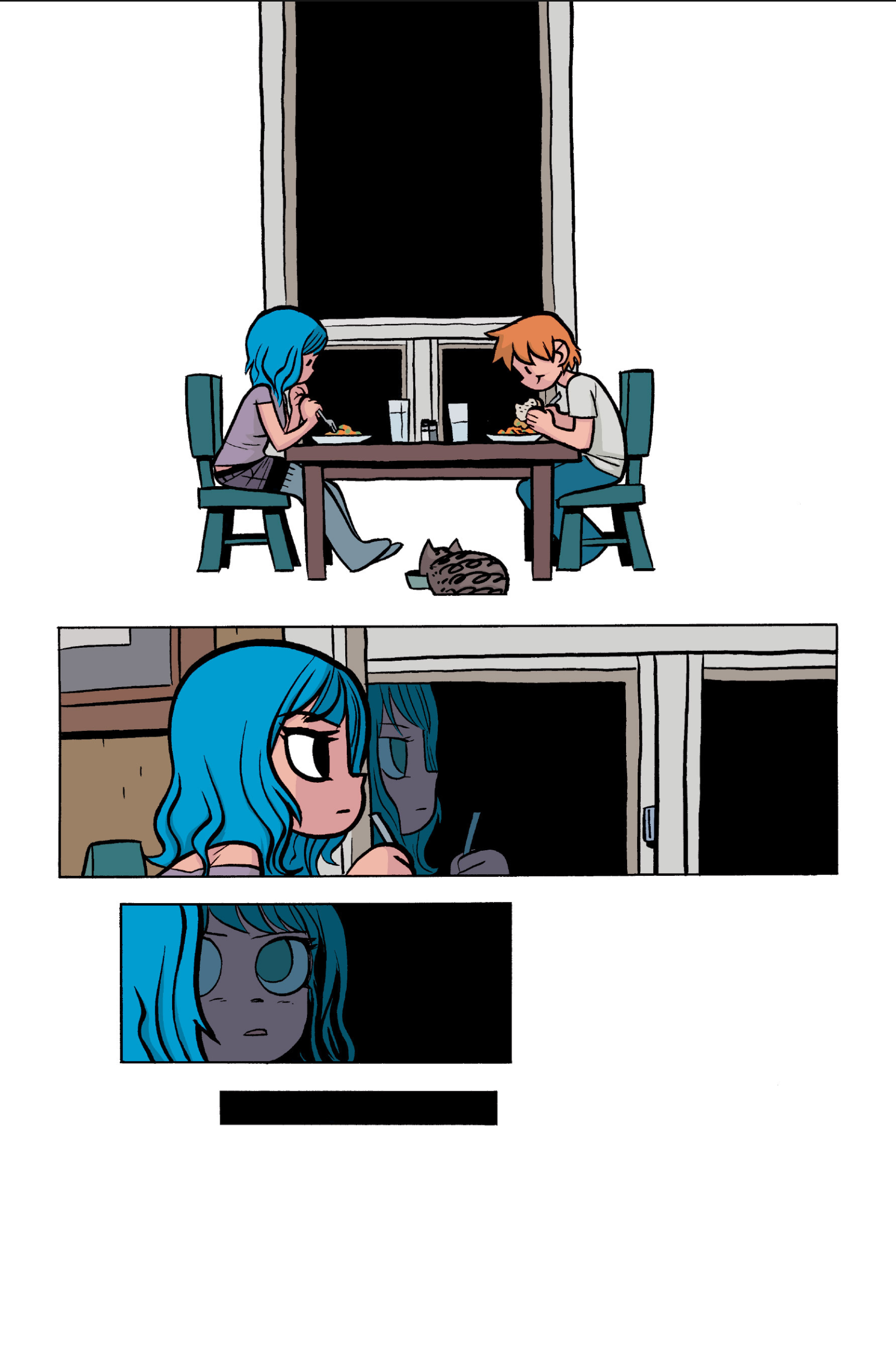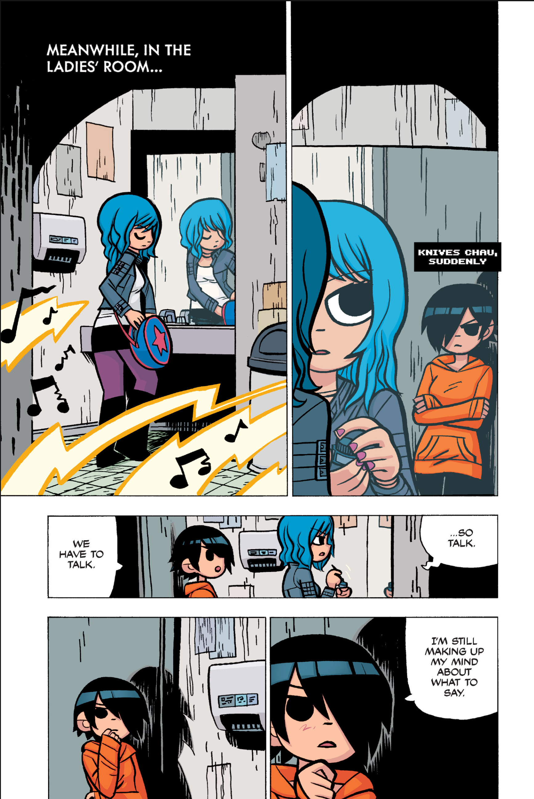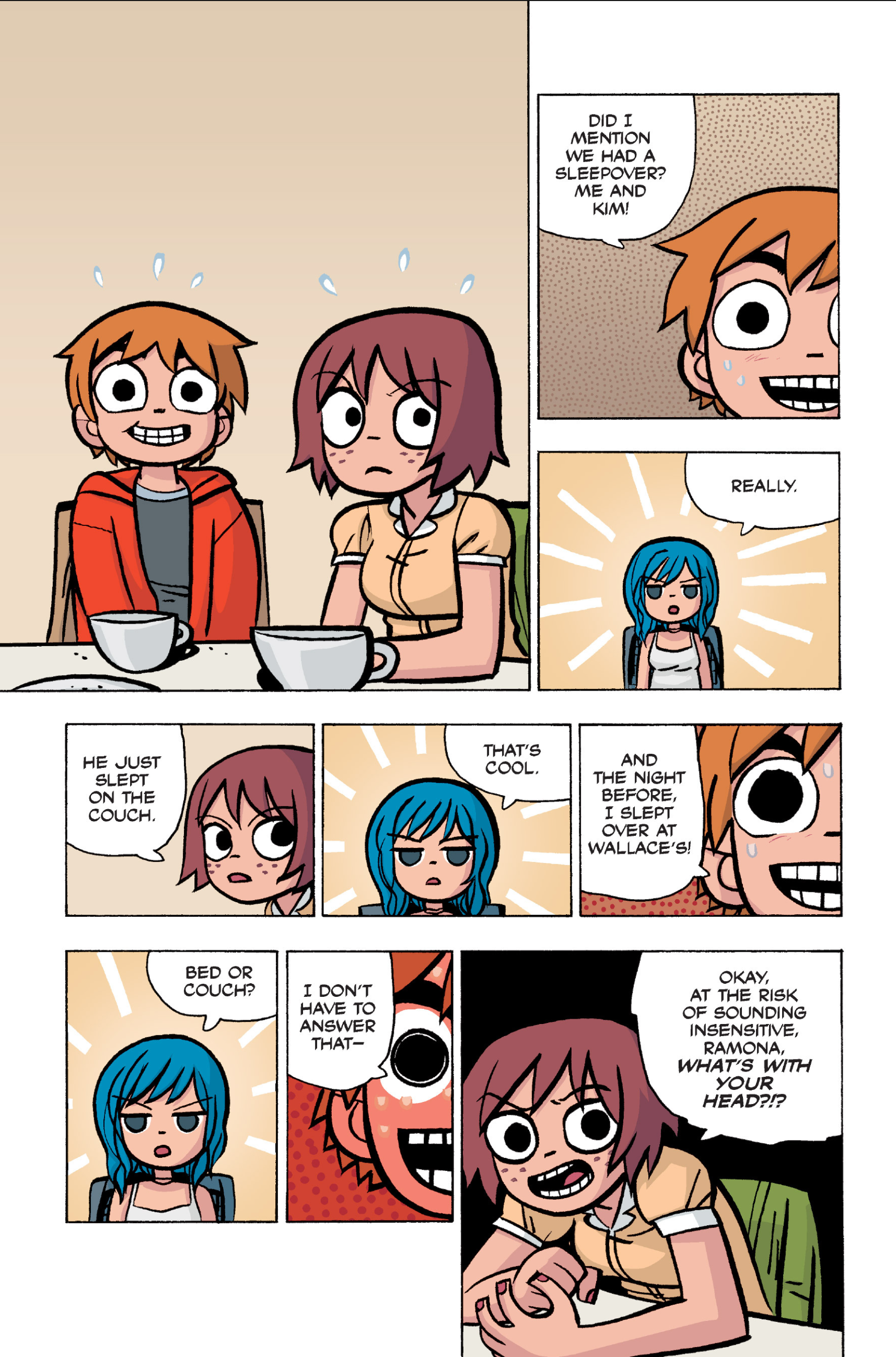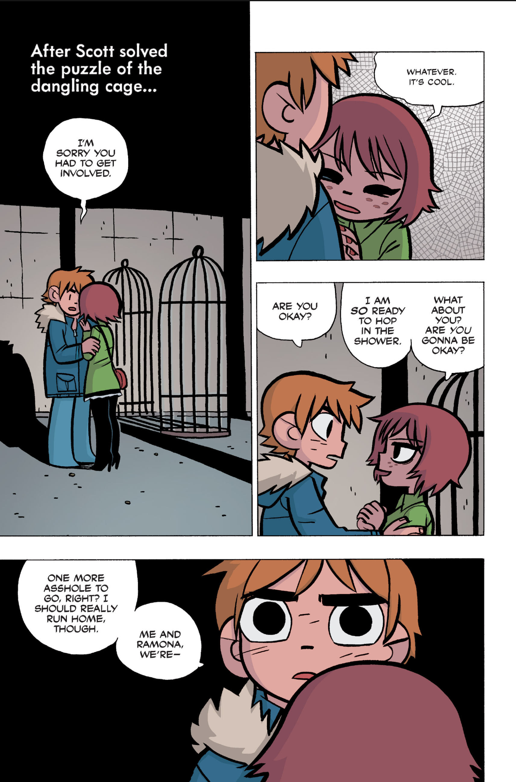 The comic never points this out but this is a particularly rough issue for Kim>No one givevs a shit about the band anymore due to their own issues, band left in limbo>Band performance cancelled because Scott is a disaster>Constant fights with her friends/roommates>Gets cheated on and has to live with the girl responsible>Kidnapped by two psycho's, when her ex shows up, has to lie to get him motivated because she's not enough on her own>Said ex then shows up on her doorstep, have to awkwardly share a bed with someone you clearly still have some level of buried affection for underneath all the pain he inflicted on youI don't blame her for moving