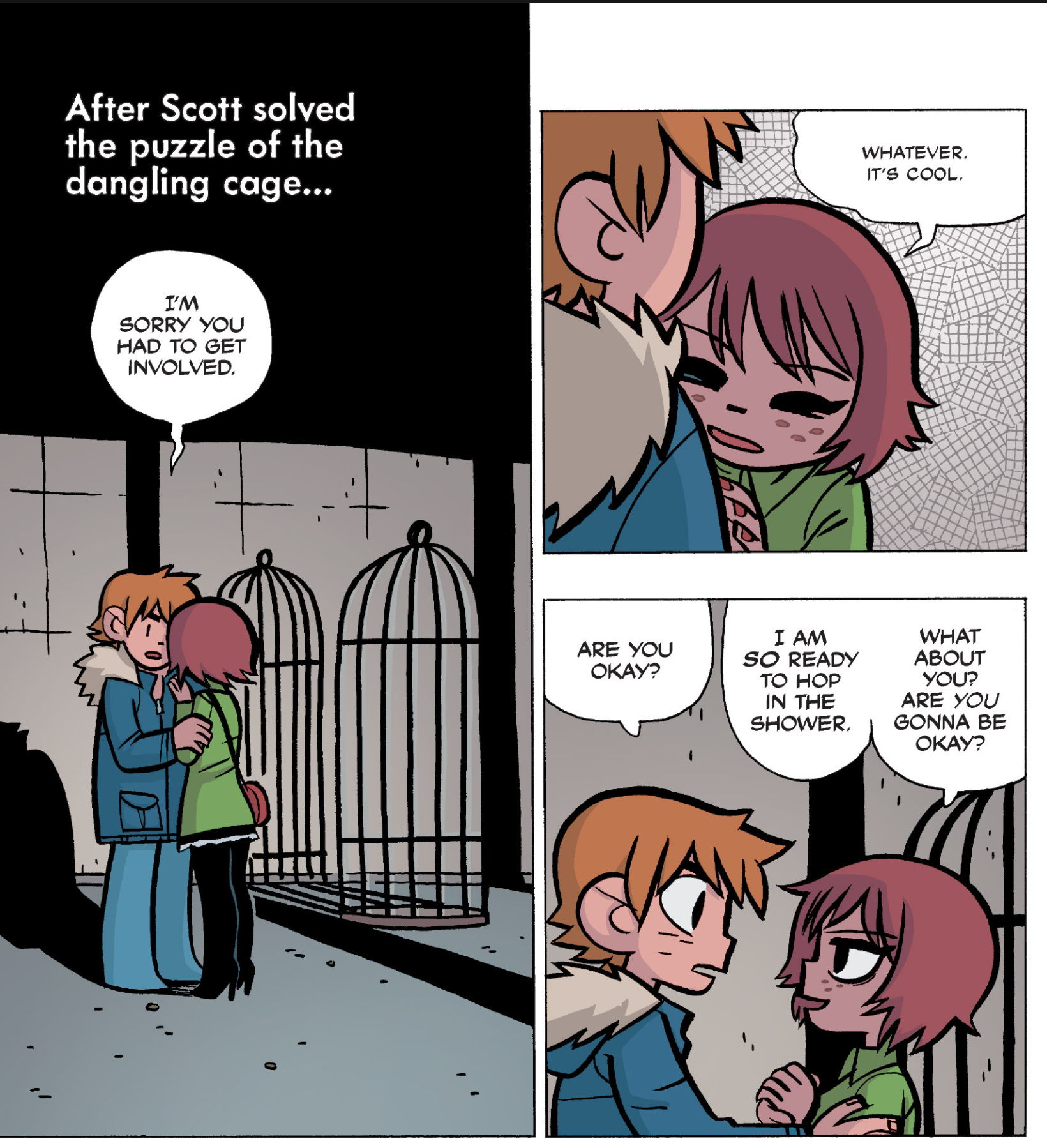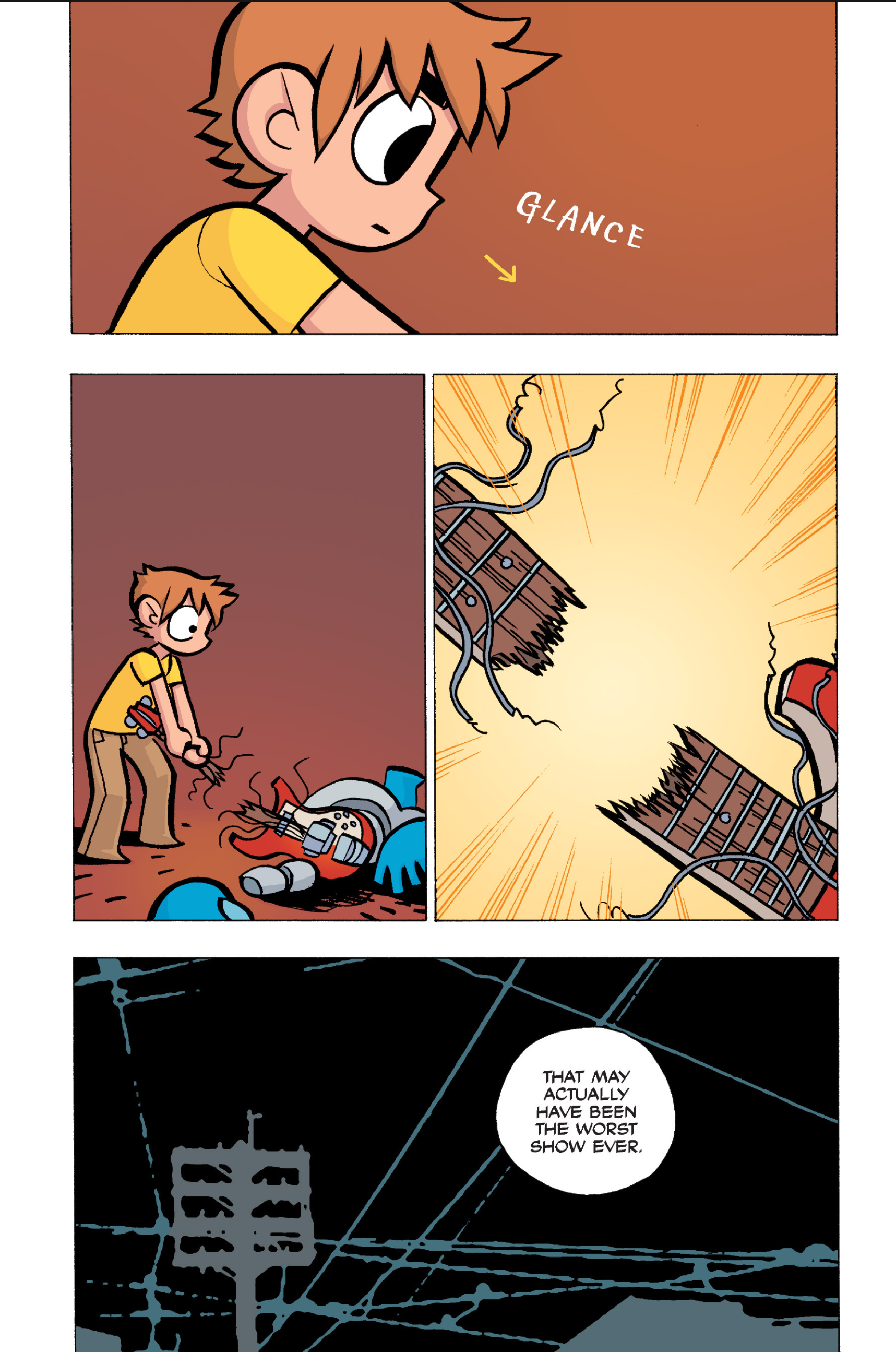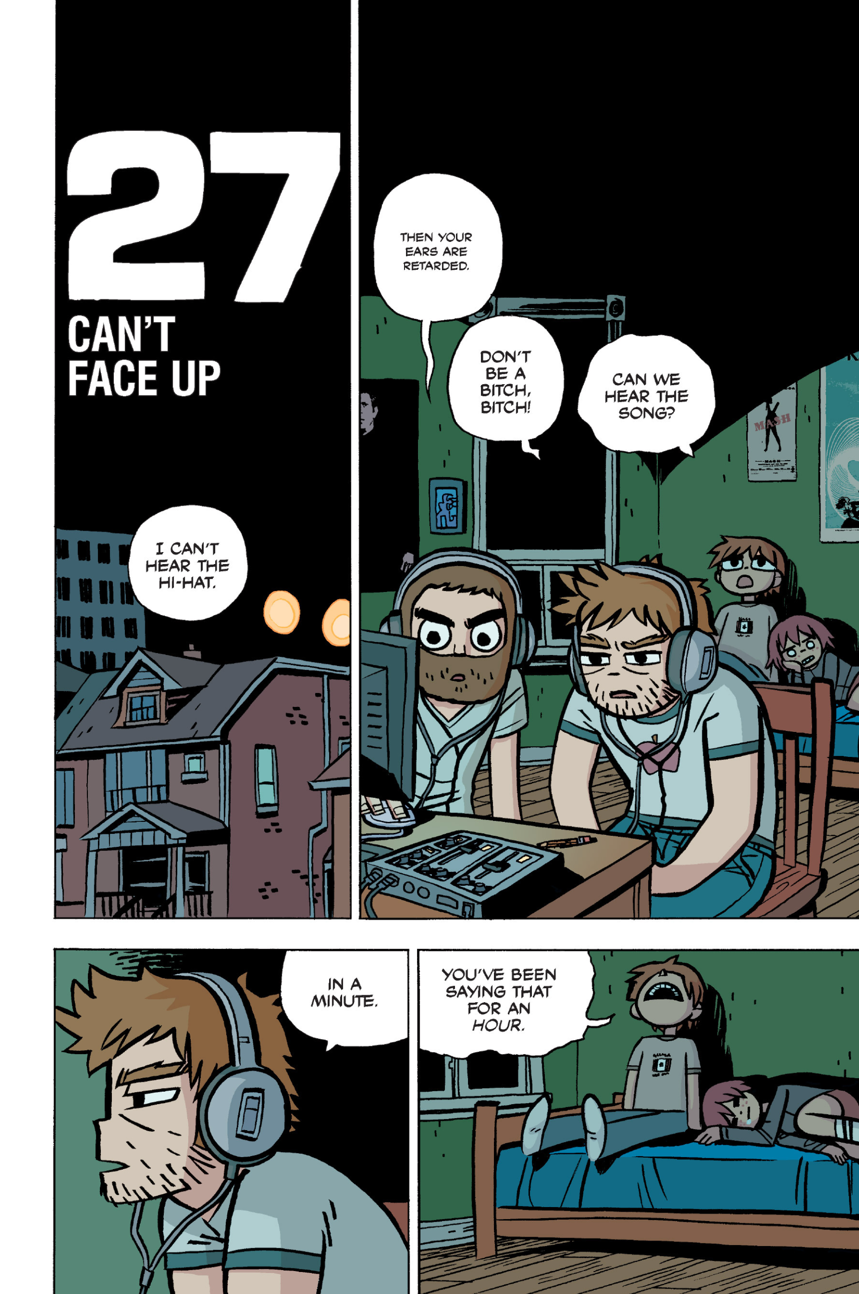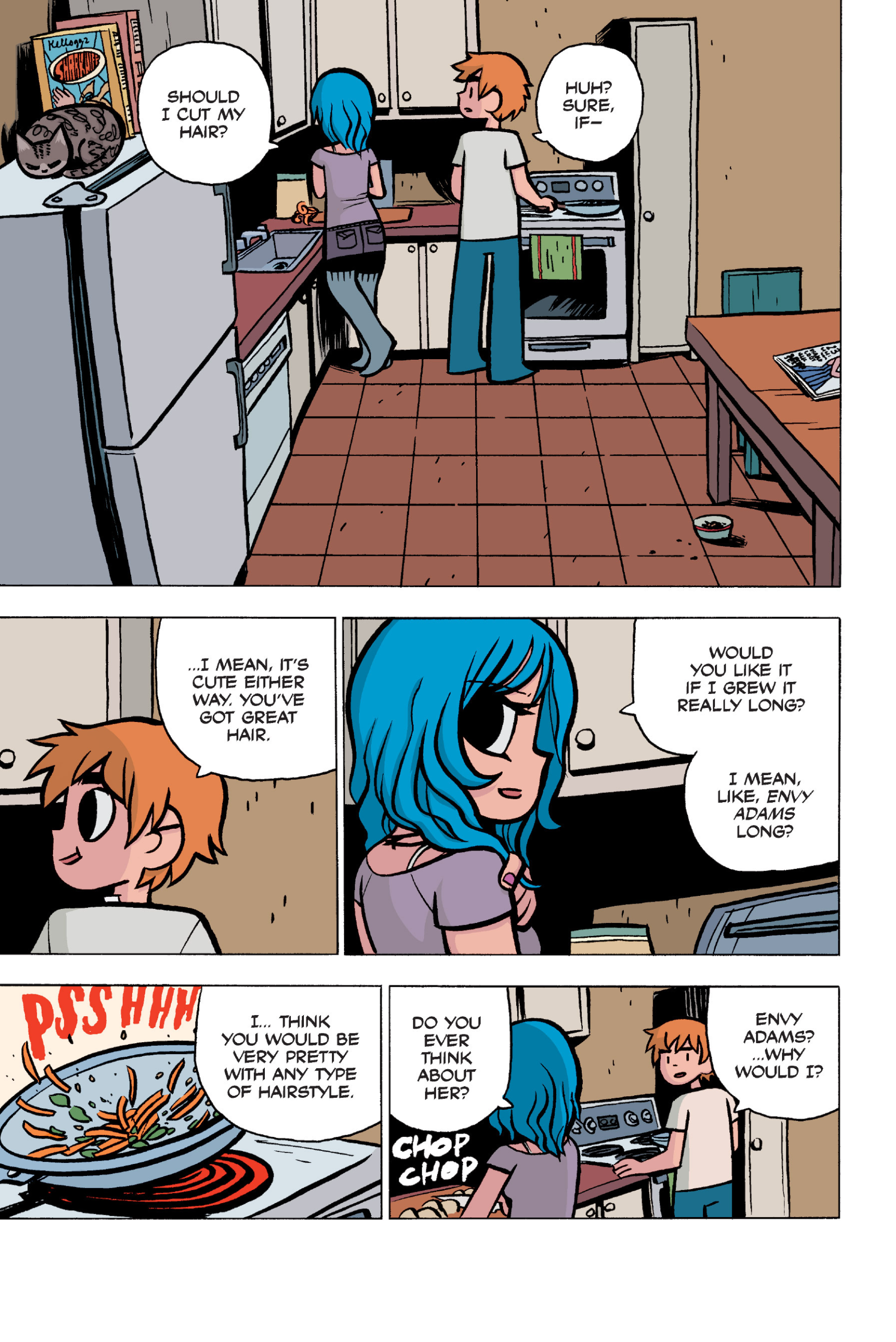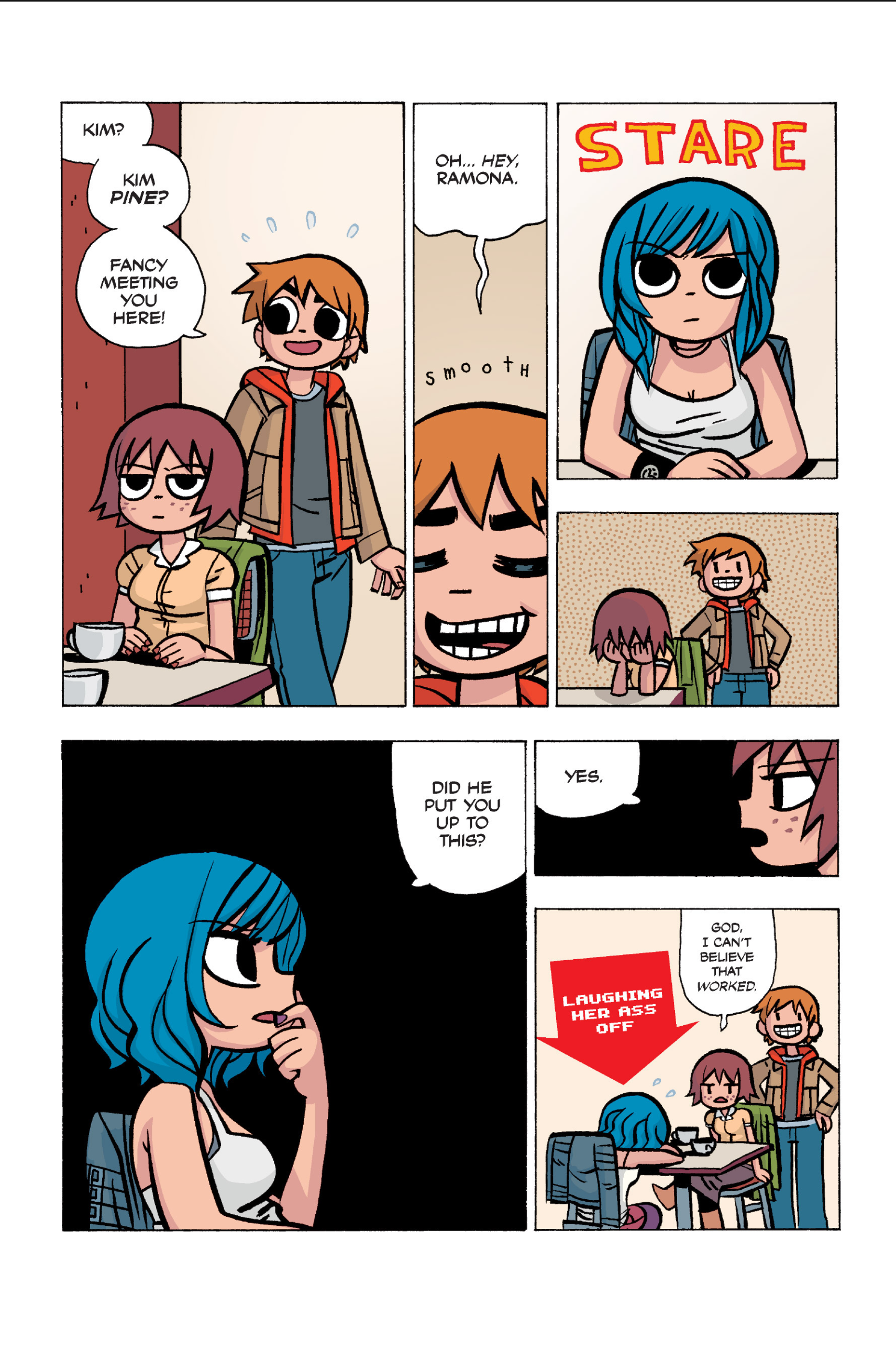 The comic never points this out but this is a particularly rough issue for Kim>No one givevs a shit about the band anymore due to their own issues, band left in limbo>Band performance cancelled because Scott is a disaster>Constant fights with her friends/roommates>Gets cheated on and has to live with the girl responsible>Kidnapped by two psycho's, when her ex shows up, has to lie to get him motivated because she's not enough on her own>Said ex then shows up on her doorstep, have to awkwardly share a bed with someone you clearly still have some level of buried affection for underneath all the pain he inflicted on youI don't blame her for moving