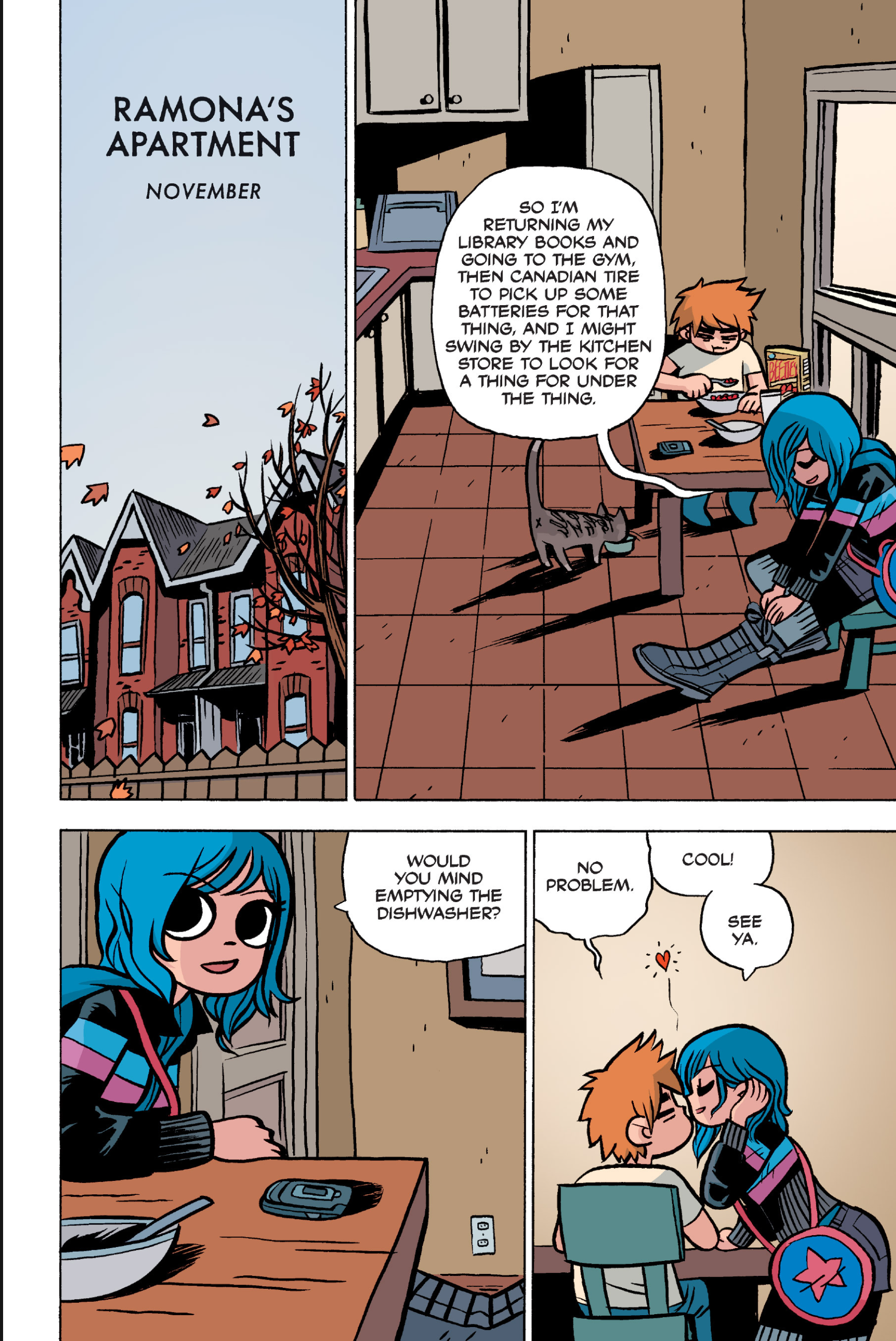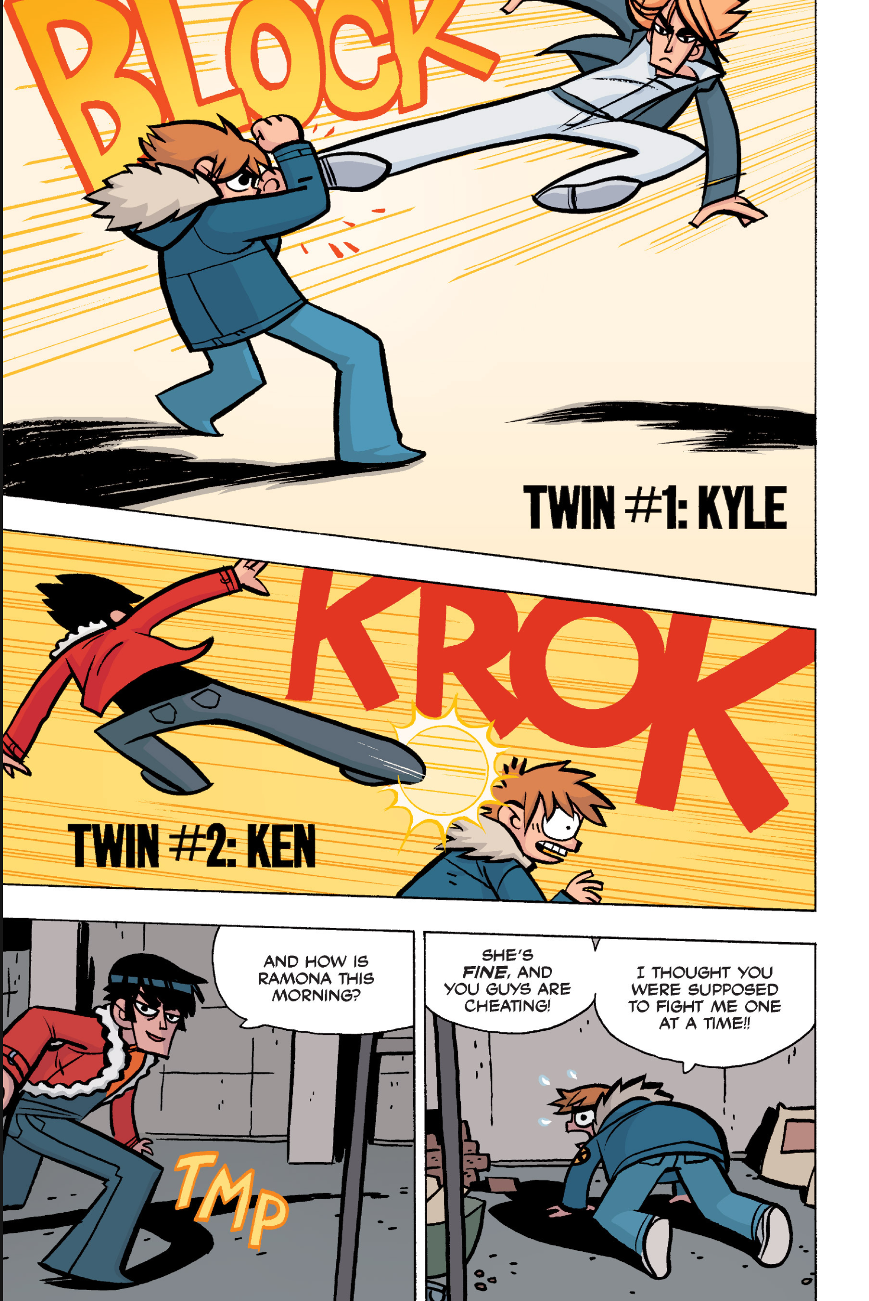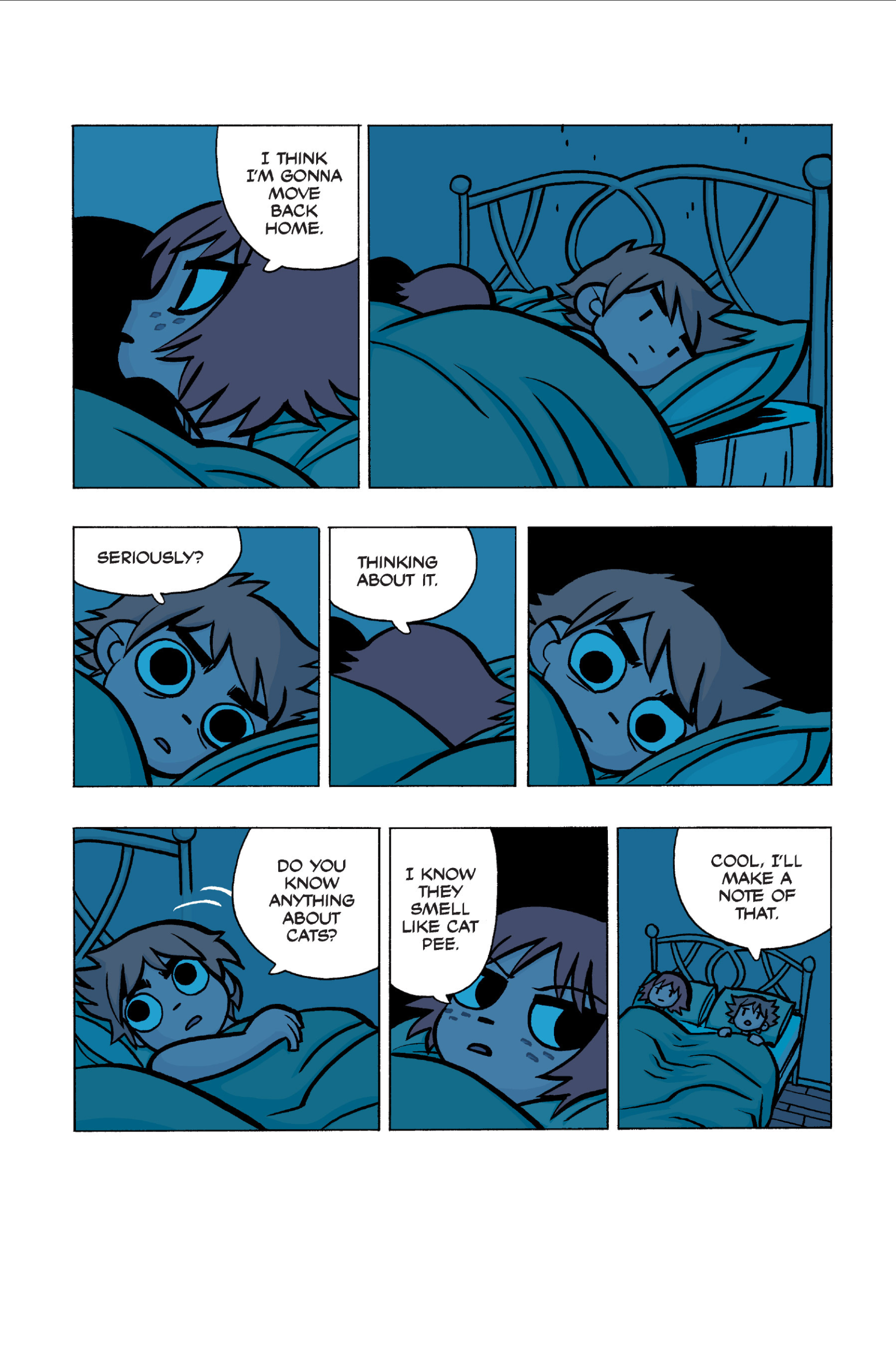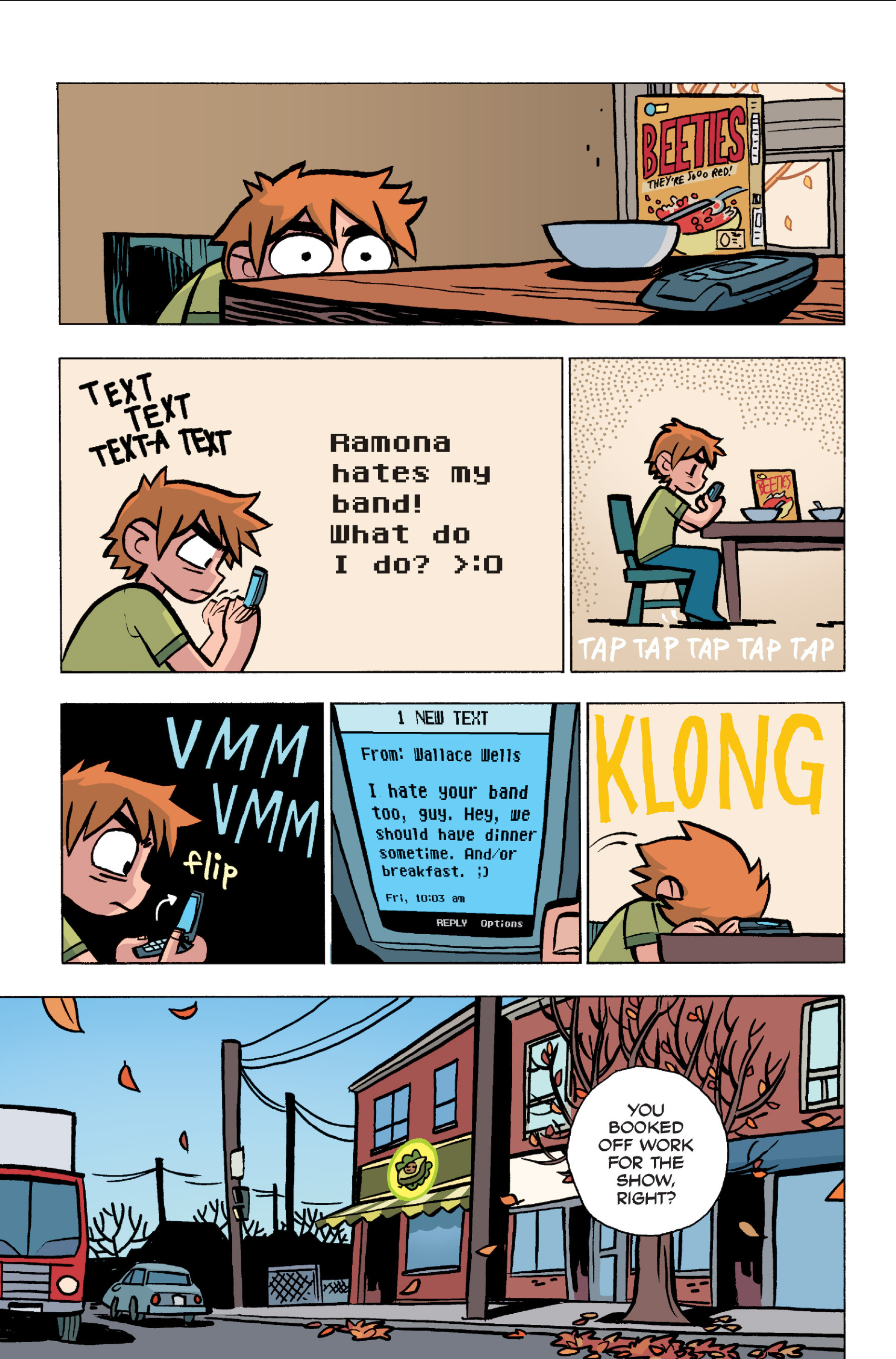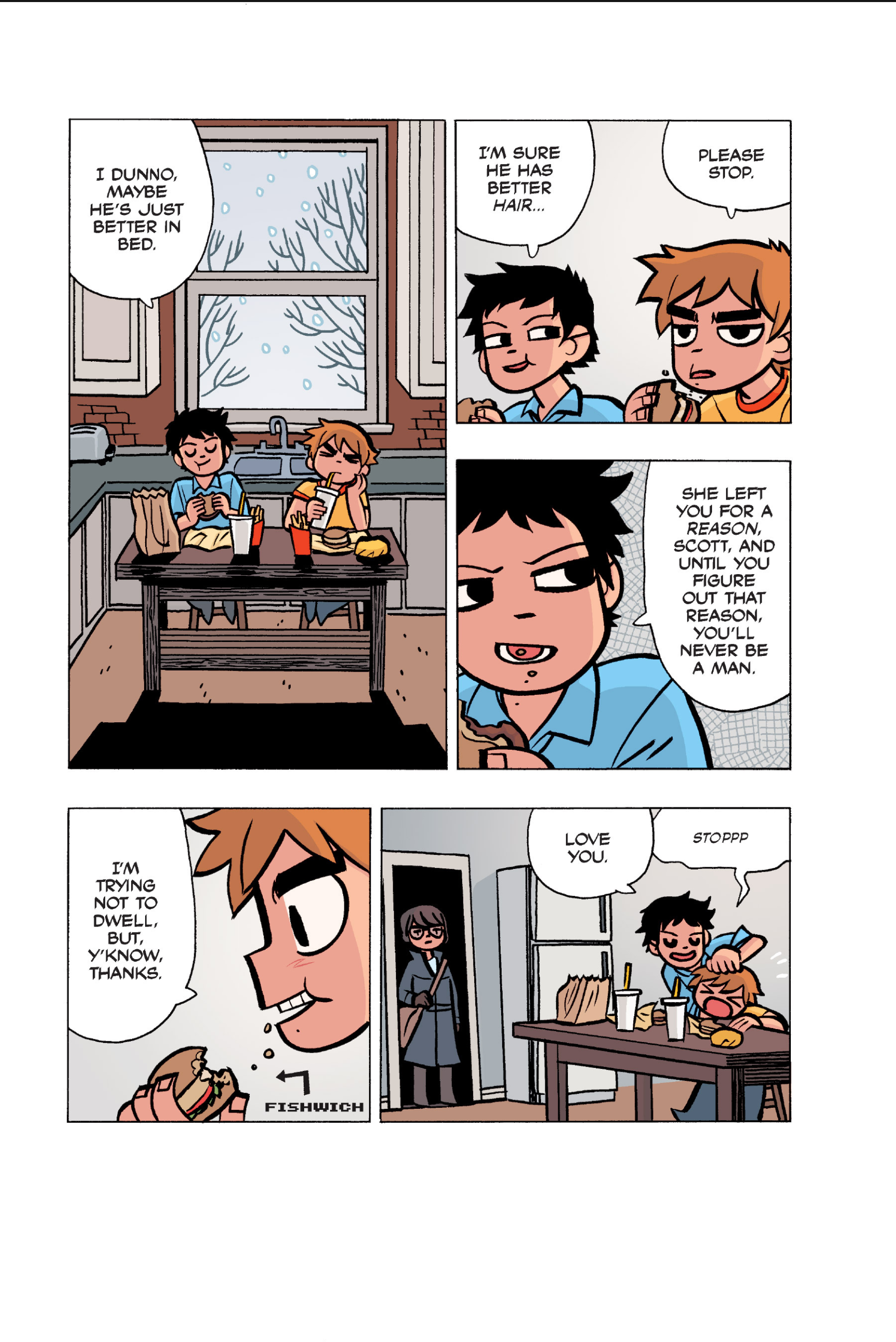 The comic never points this out but this is a particularly rough issue for Kim>No one givevs a shit about the band anymore due to their own issues, band left in limbo>Band performance cancelled because Scott is a disaster>Constant fights with her friends/roommates>Gets cheated on and has to live with the girl responsible>Kidnapped by two psycho's, when her ex shows up, has to lie to get him motivated because she's not enough on her own>Said ex then shows up on her doorstep, have to awkwardly share a bed with someone you clearly still have some level of buried affection for underneath all the pain he inflicted on youI don't blame her for moving