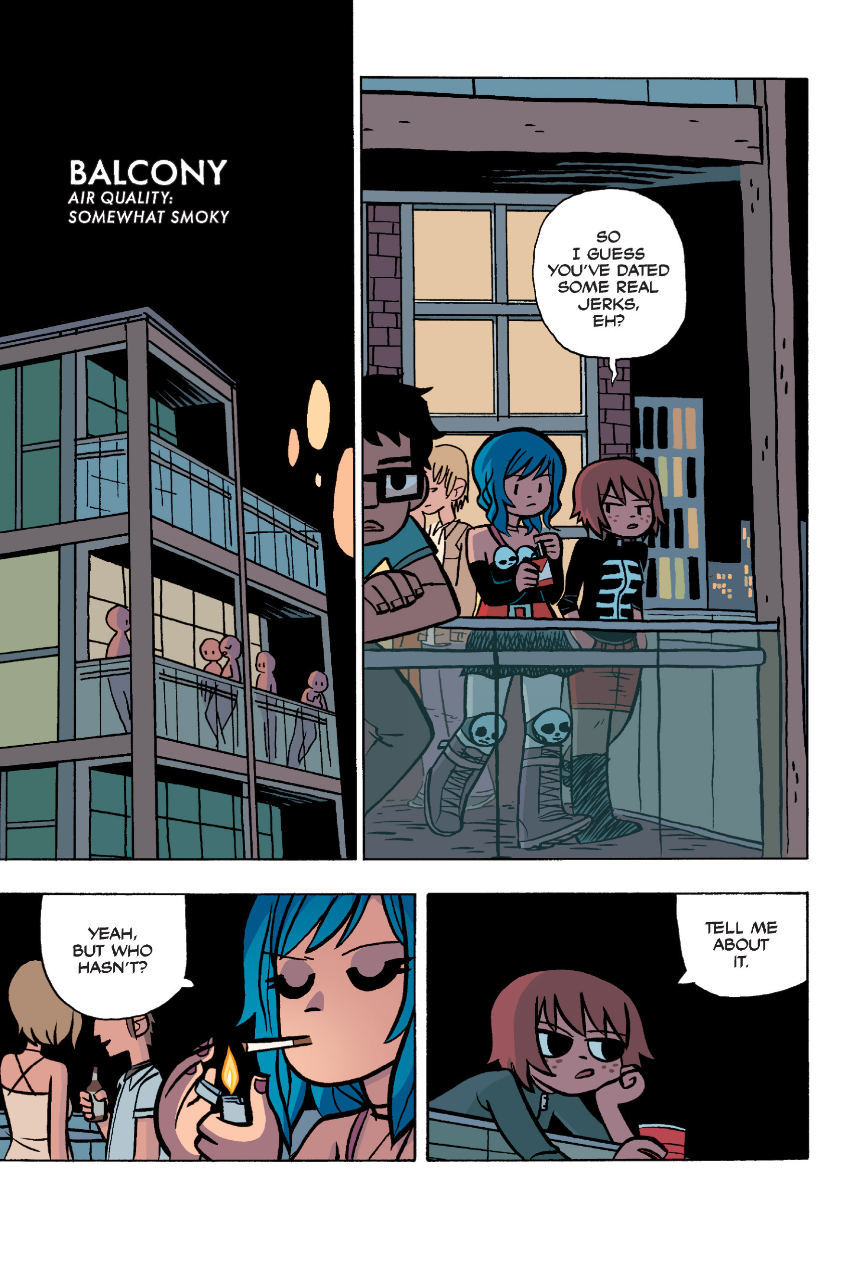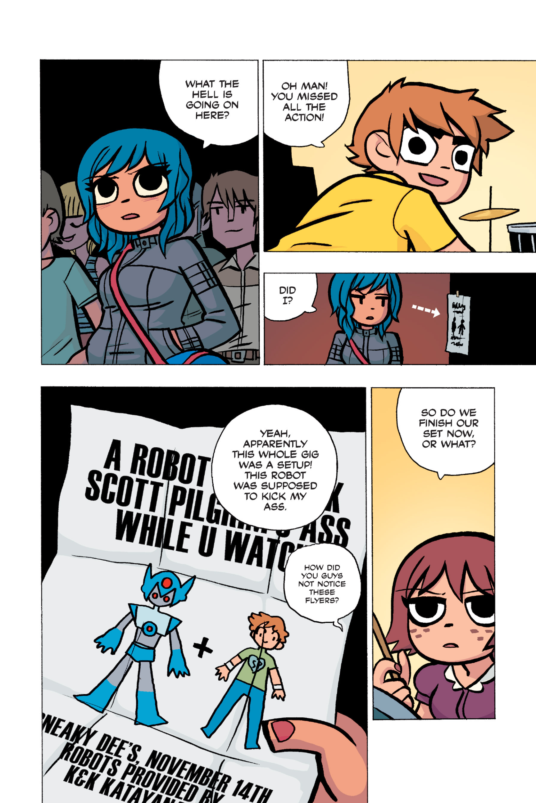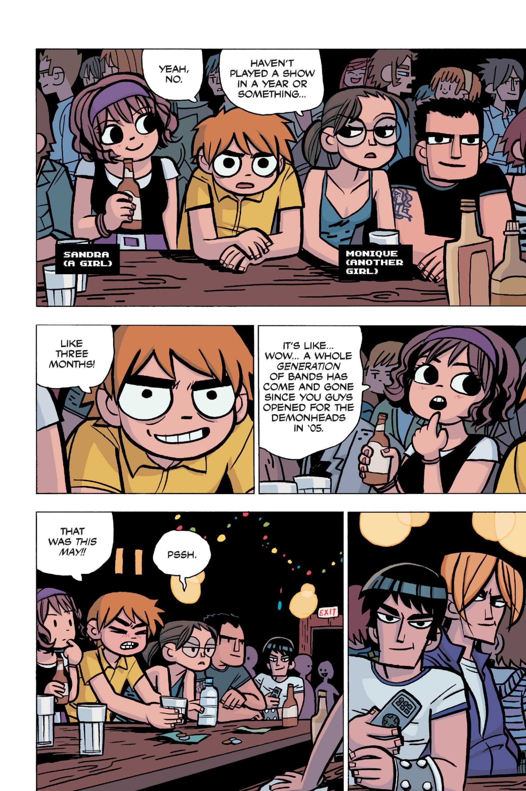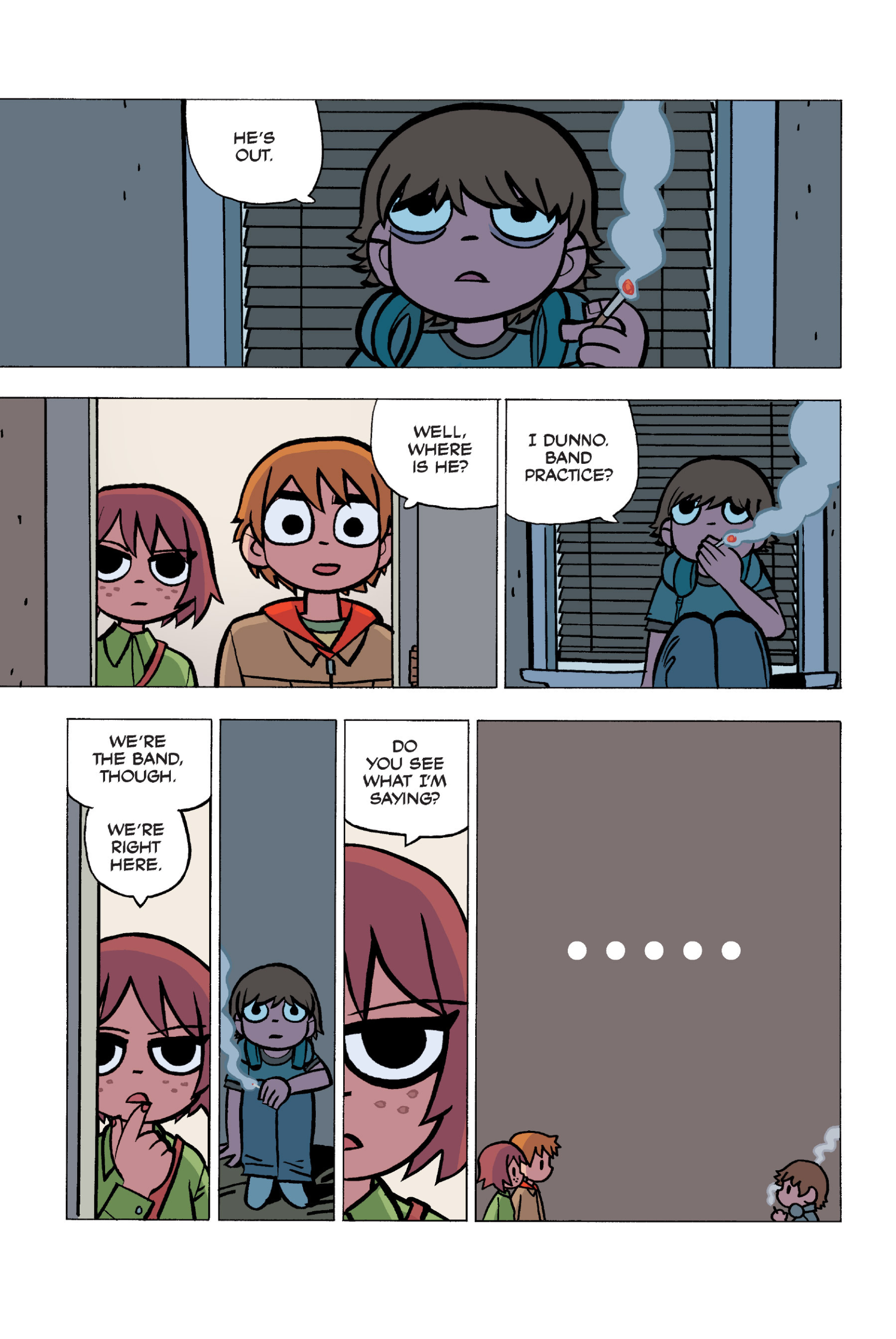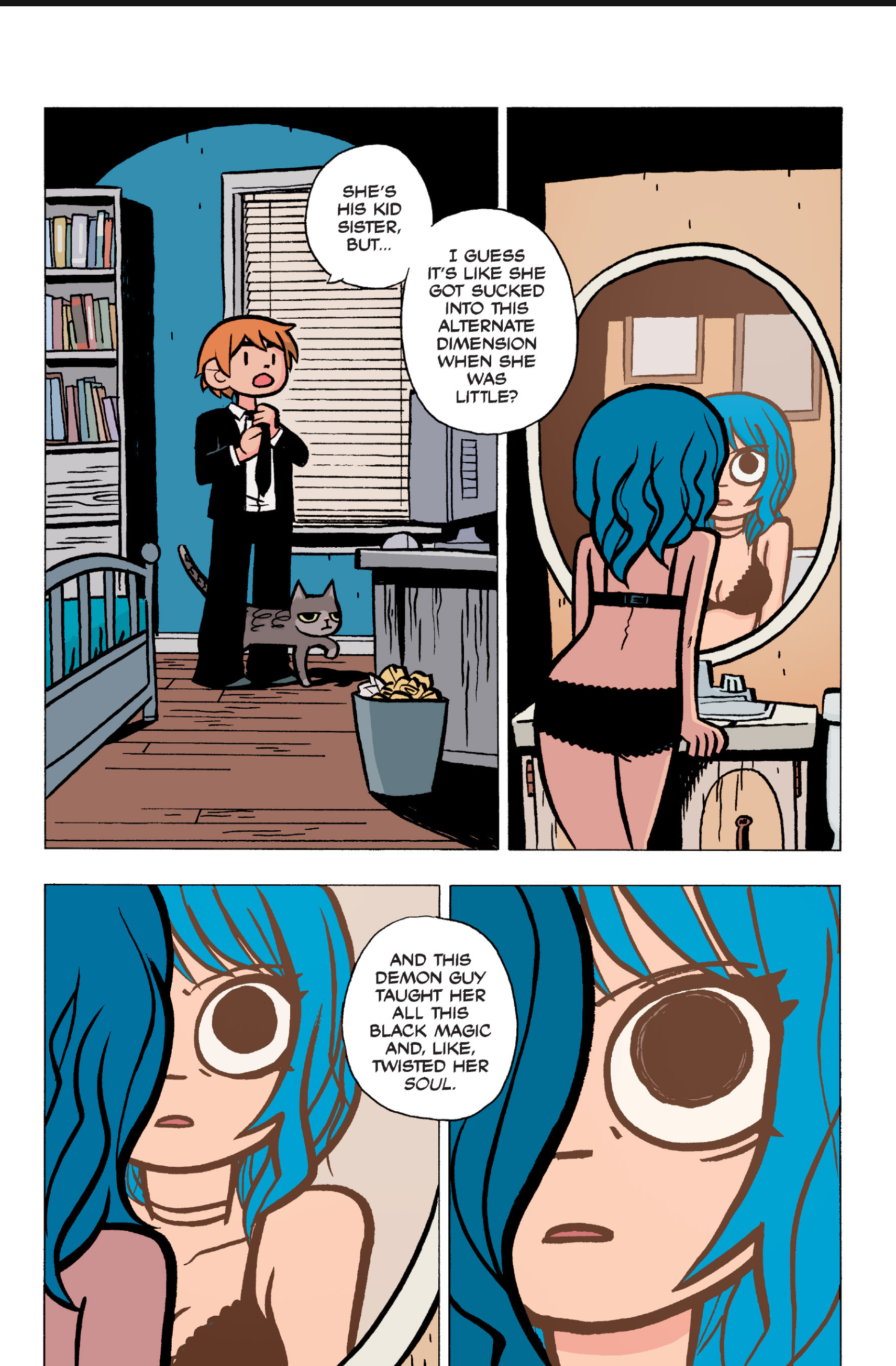 The comic never points this out but this is a particularly rough issue for Kim>No one givevs a shit about the band anymore due to their own issues, band left in limbo>Band performance cancelled because Scott is a disaster>Constant fights with her friends/roommates>Gets cheated on and has to live with the girl responsible>Kidnapped by two psycho's, when her ex shows up, has to lie to get him motivated because she's not enough on her own>Said ex then shows up on her doorstep, have to awkwardly share a bed with someone you clearly still have some level of buried affection for underneath all the pain he inflicted on youI don't blame her for moving