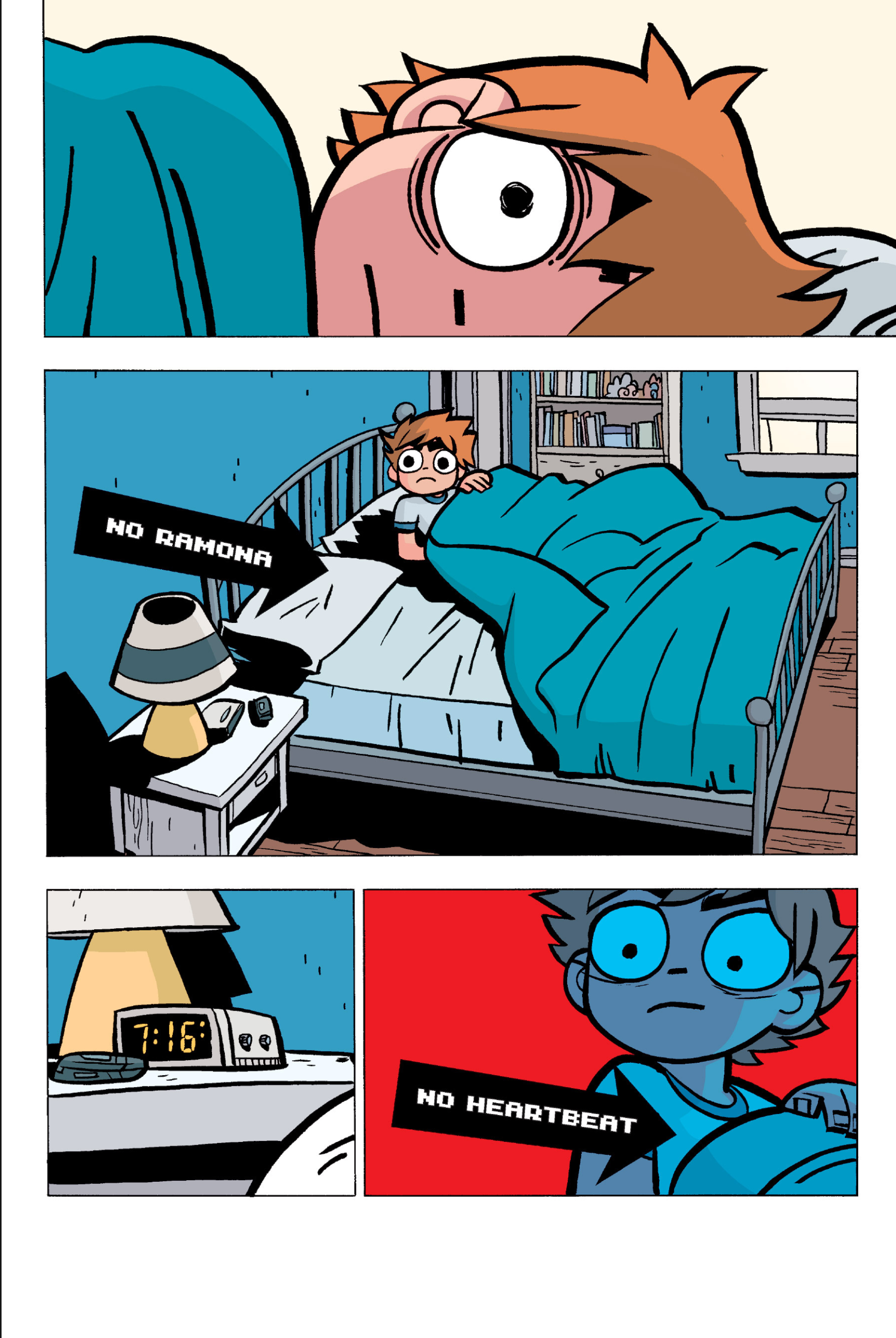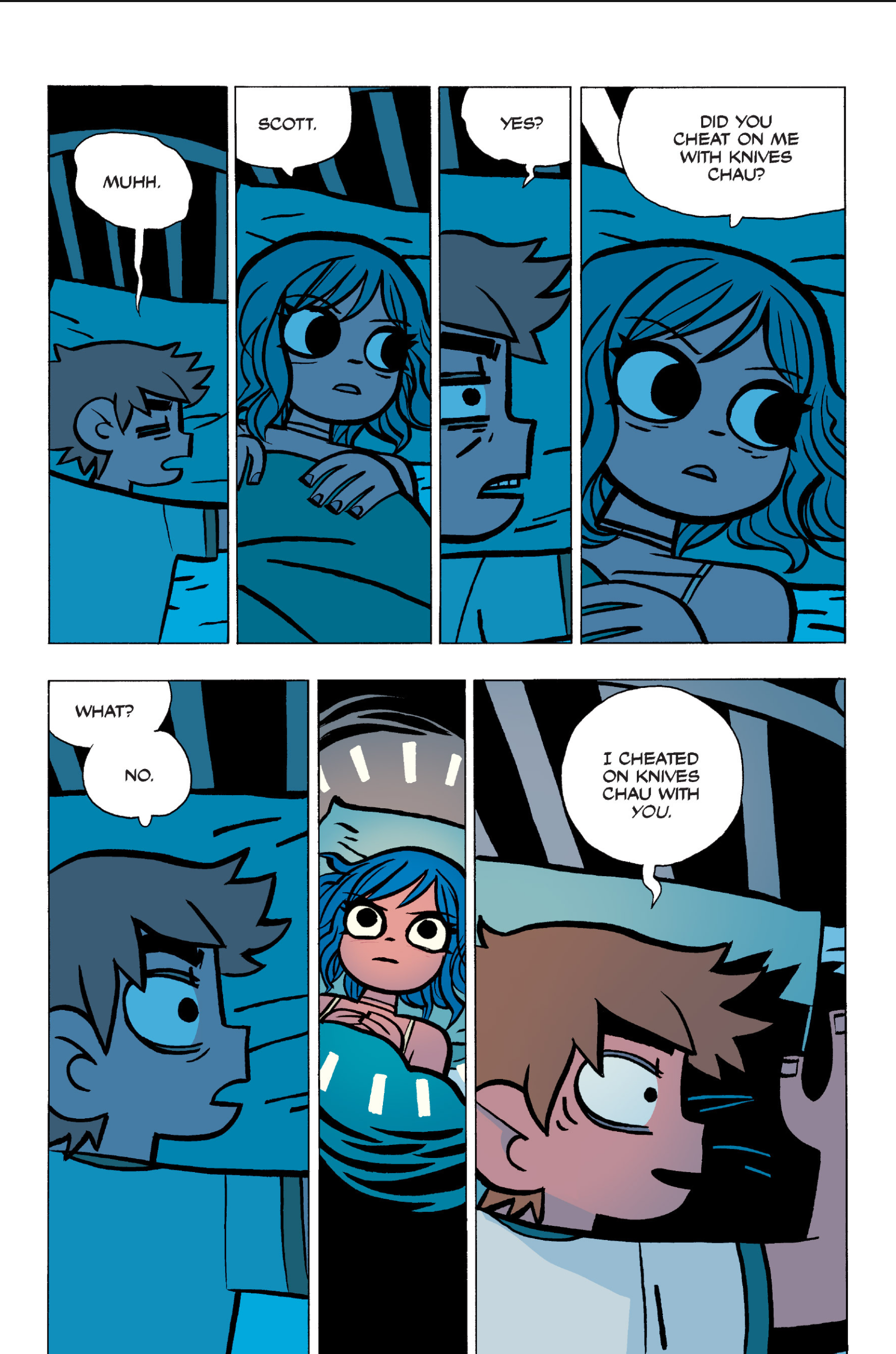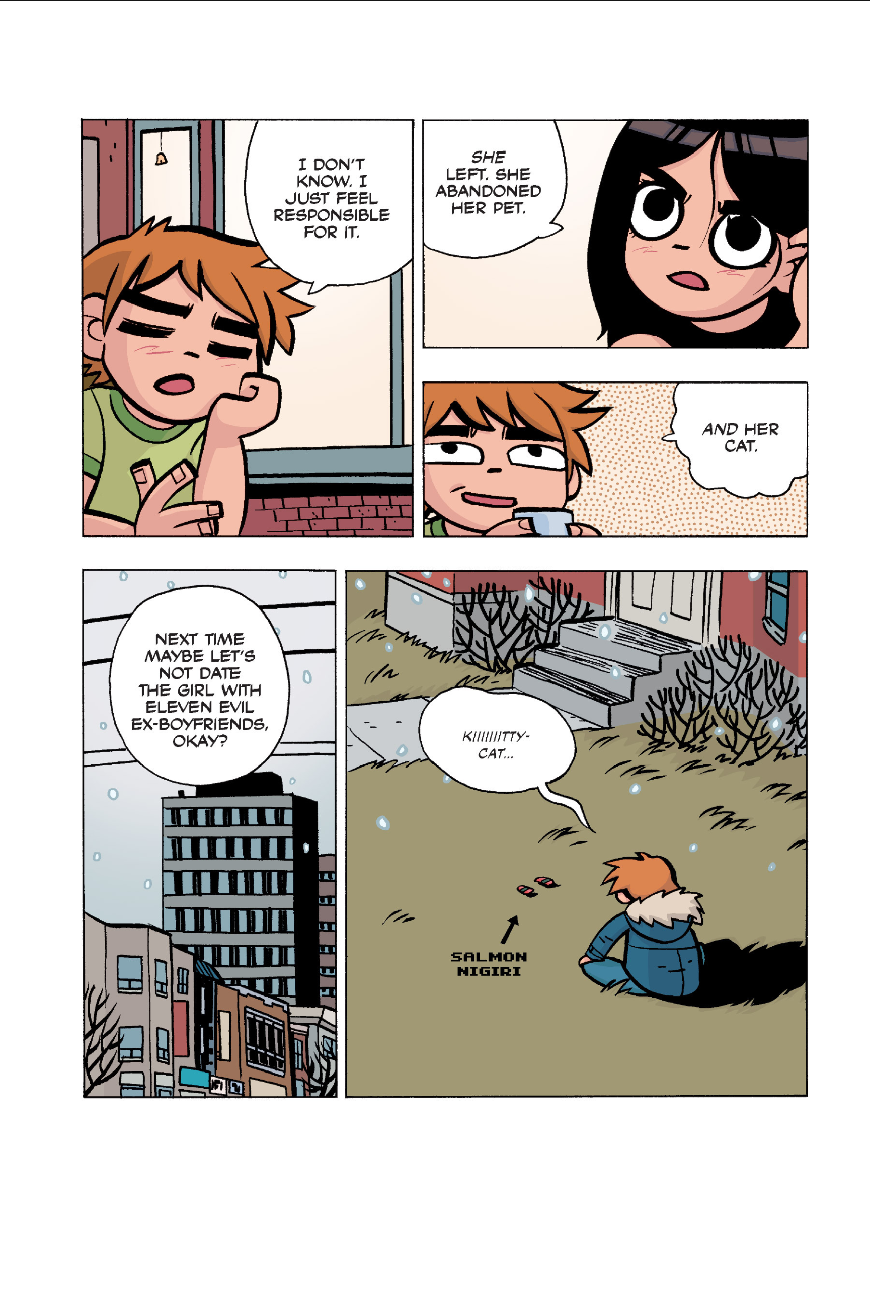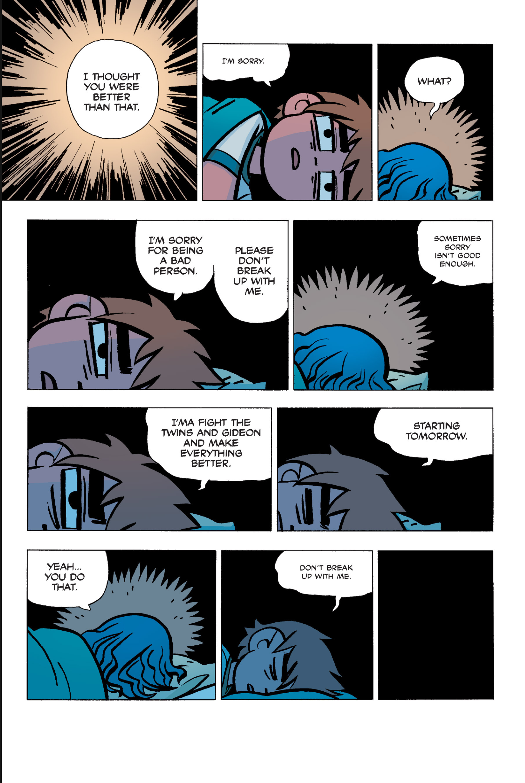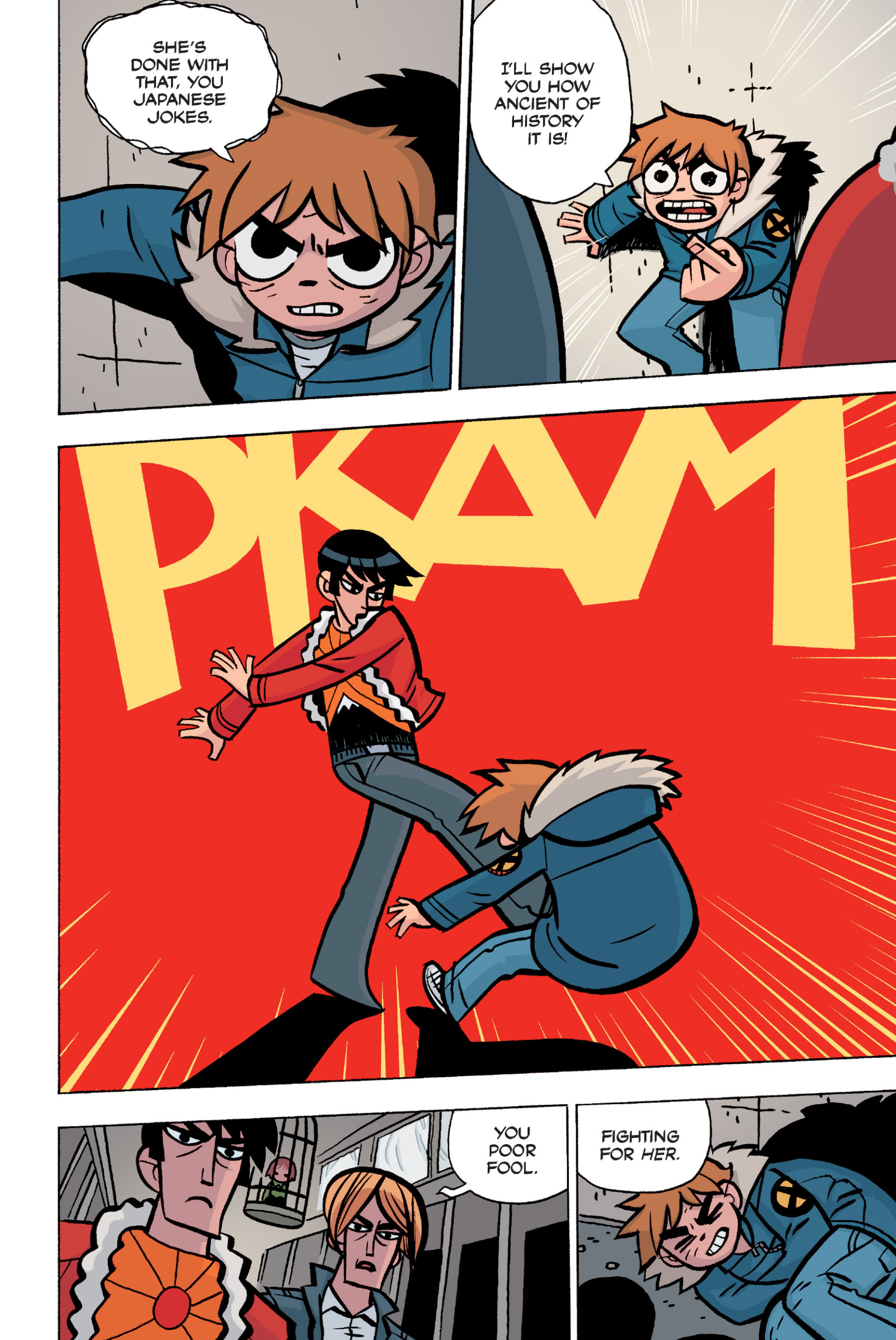 The comic never points this out but this is a particularly rough issue for Kim>No one givevs a shit about the band anymore due to their own issues, band left in limbo>Band performance cancelled because Scott is a disaster>Constant fights with her friends/roommates>Gets cheated on and has to live with the girl responsible>Kidnapped by two psycho's, when her ex shows up, has to lie to get him motivated because she's not enough on her own>Said ex then shows up on her doorstep, have to awkwardly share a bed with someone you clearly still have some level of buried affection for underneath all the pain he inflicted on youI don't blame her for moving
