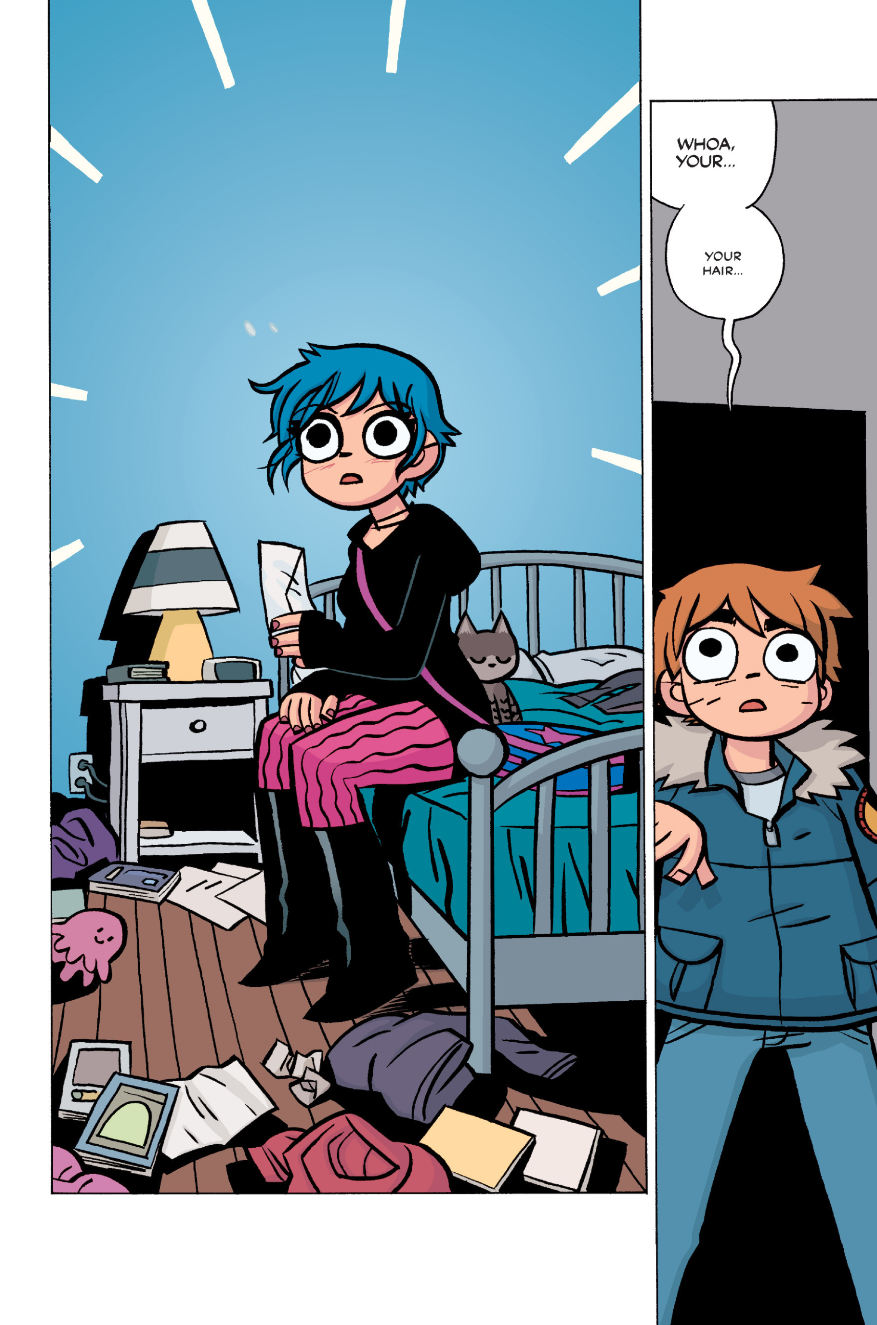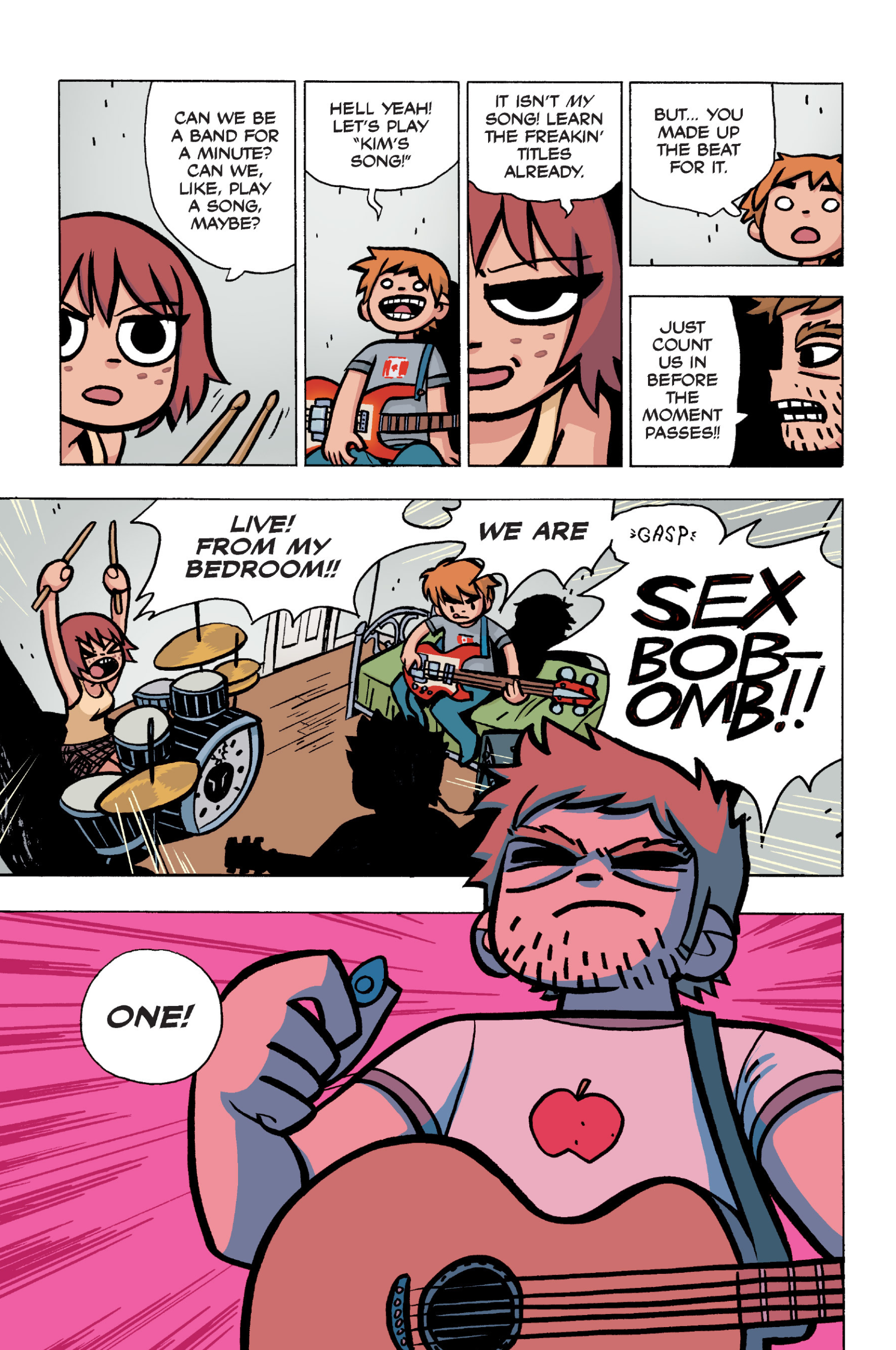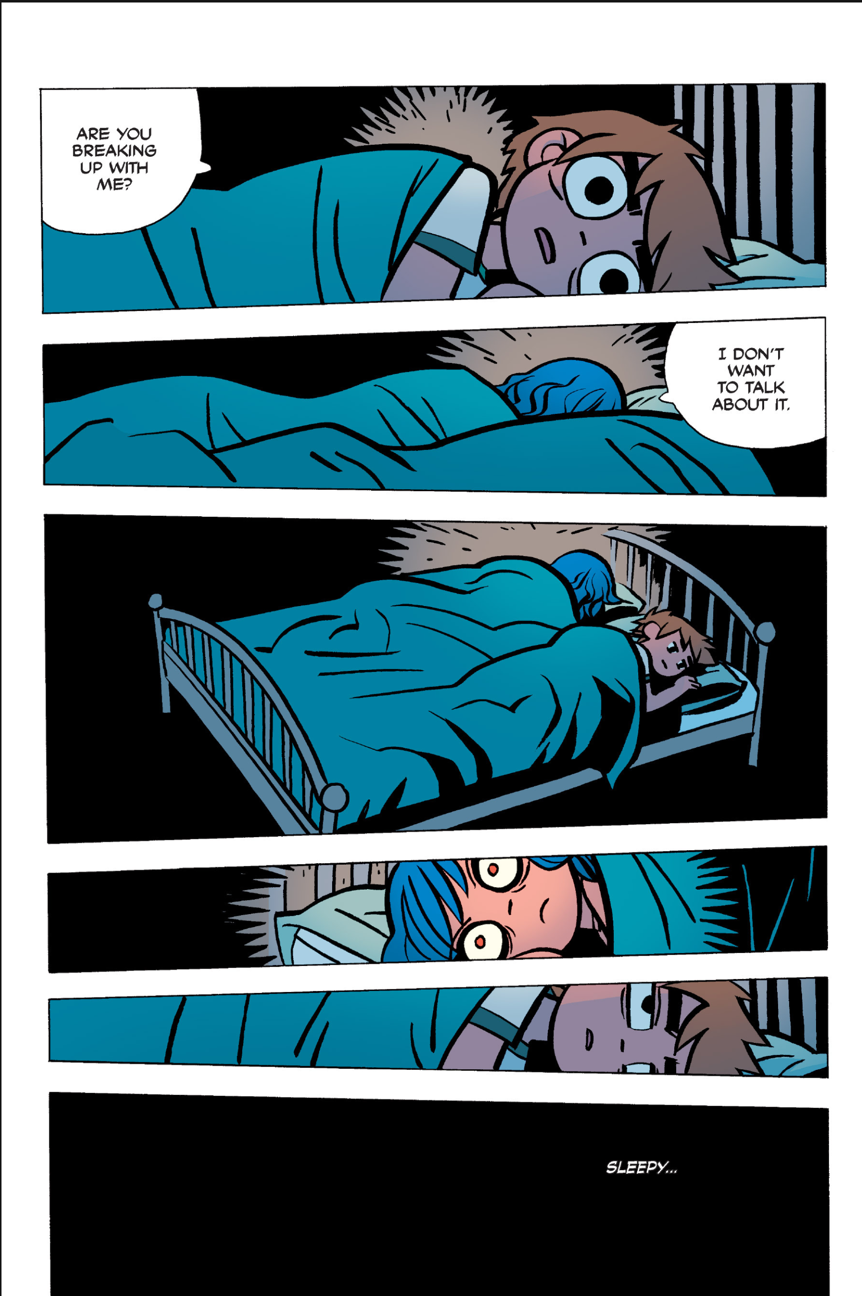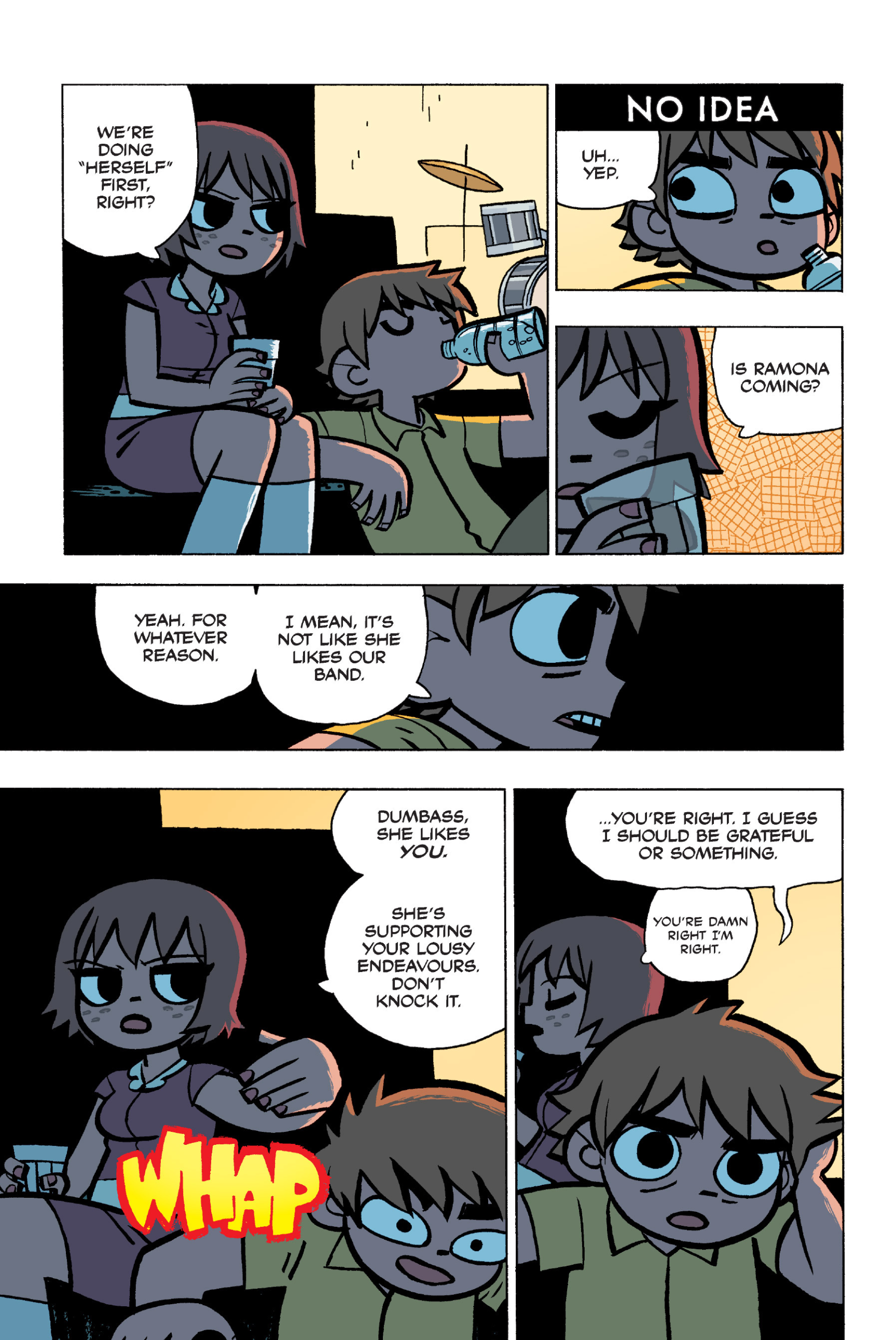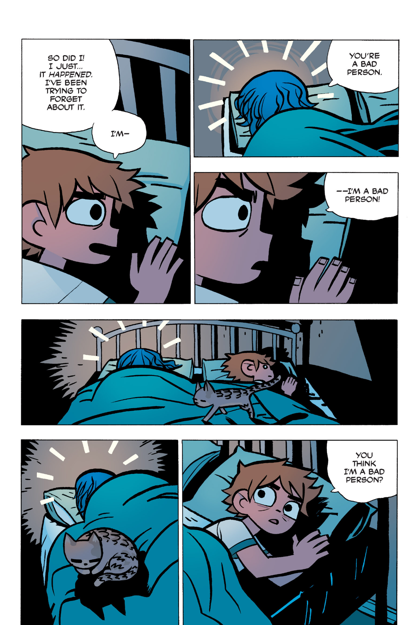 The comic never points this out but this is a particularly rough issue for Kim>No one givevs a shit about the band anymore due to their own issues, band left in limbo>Band performance cancelled because Scott is a disaster>Constant fights with her friends/roommates>Gets cheated on and has to live with the girl responsible>Kidnapped by two psycho's, when her ex shows up, has to lie to get him motivated because she's not enough on her own>Said ex then shows up on her doorstep, have to awkwardly share a bed with someone you clearly still have some level of buried affection for underneath all the pain he inflicted on youI don't blame her for moving