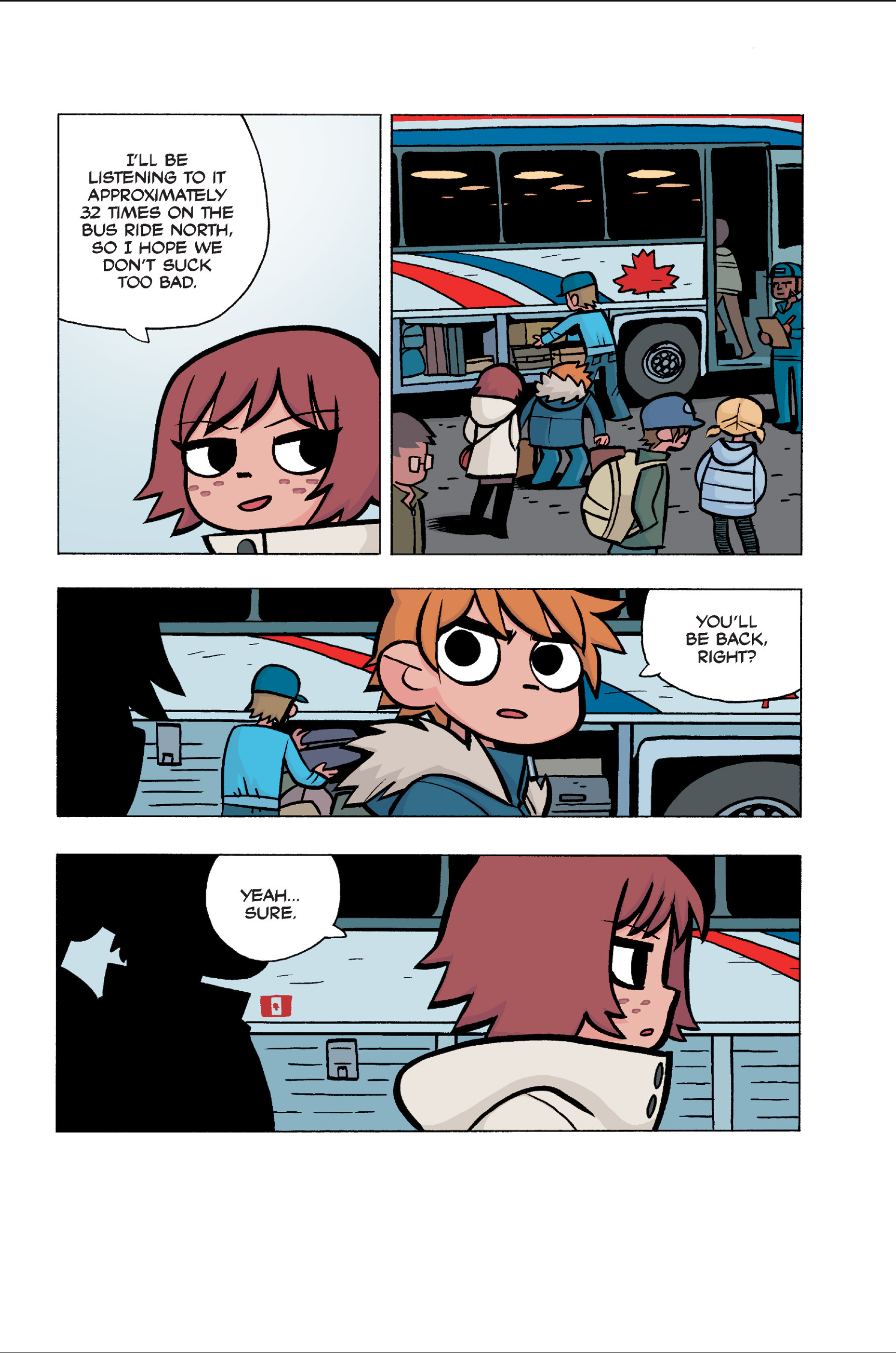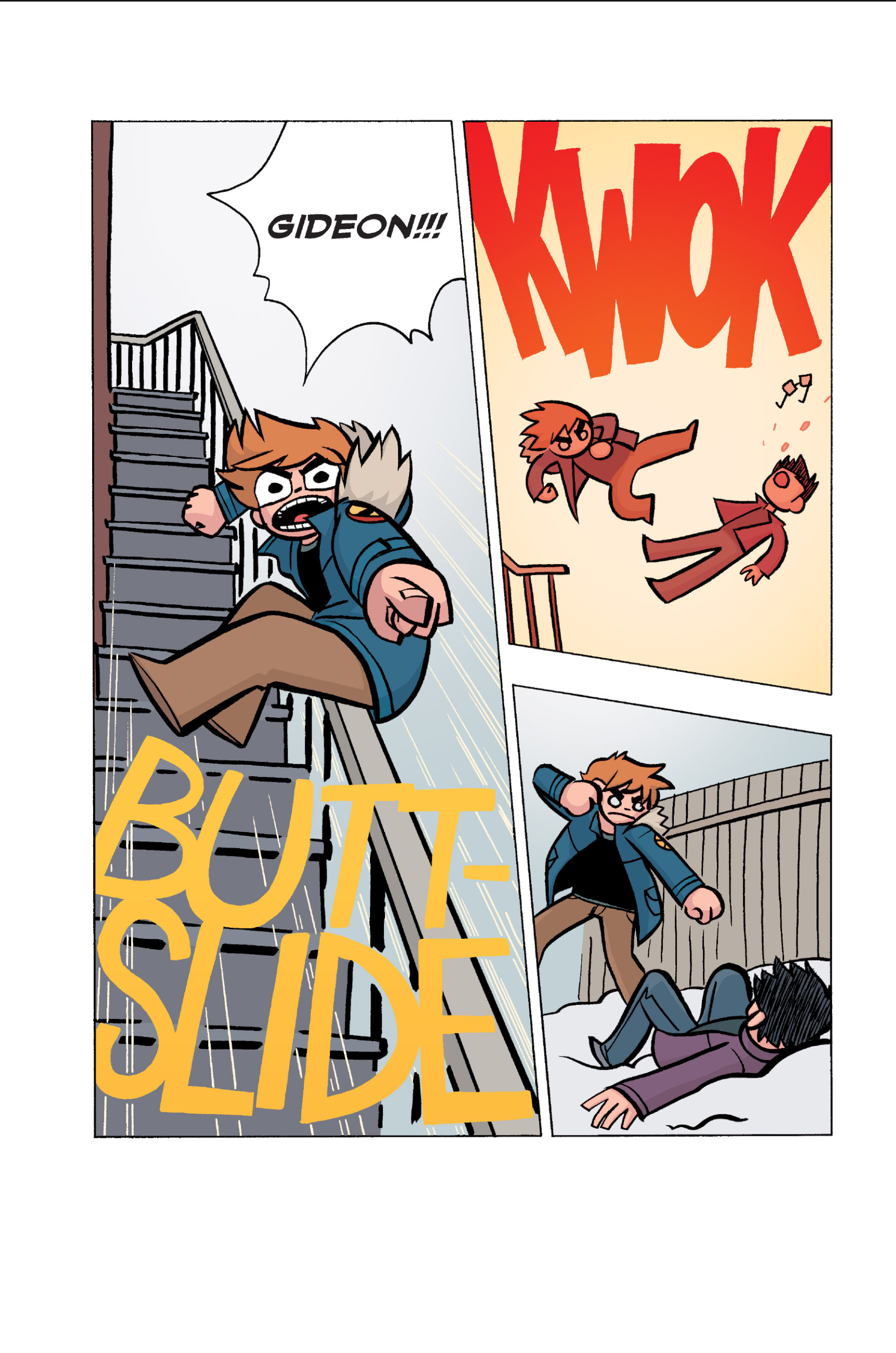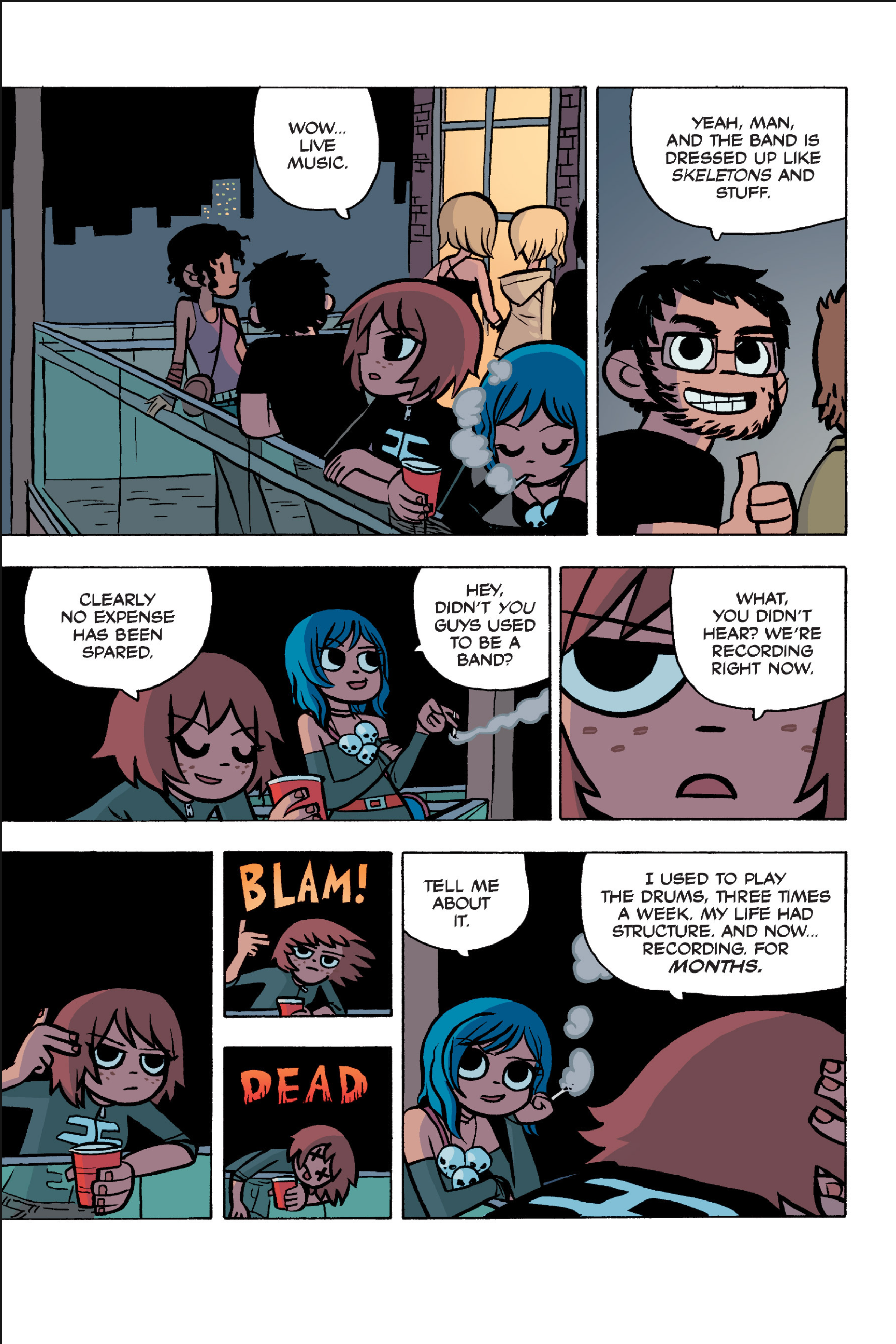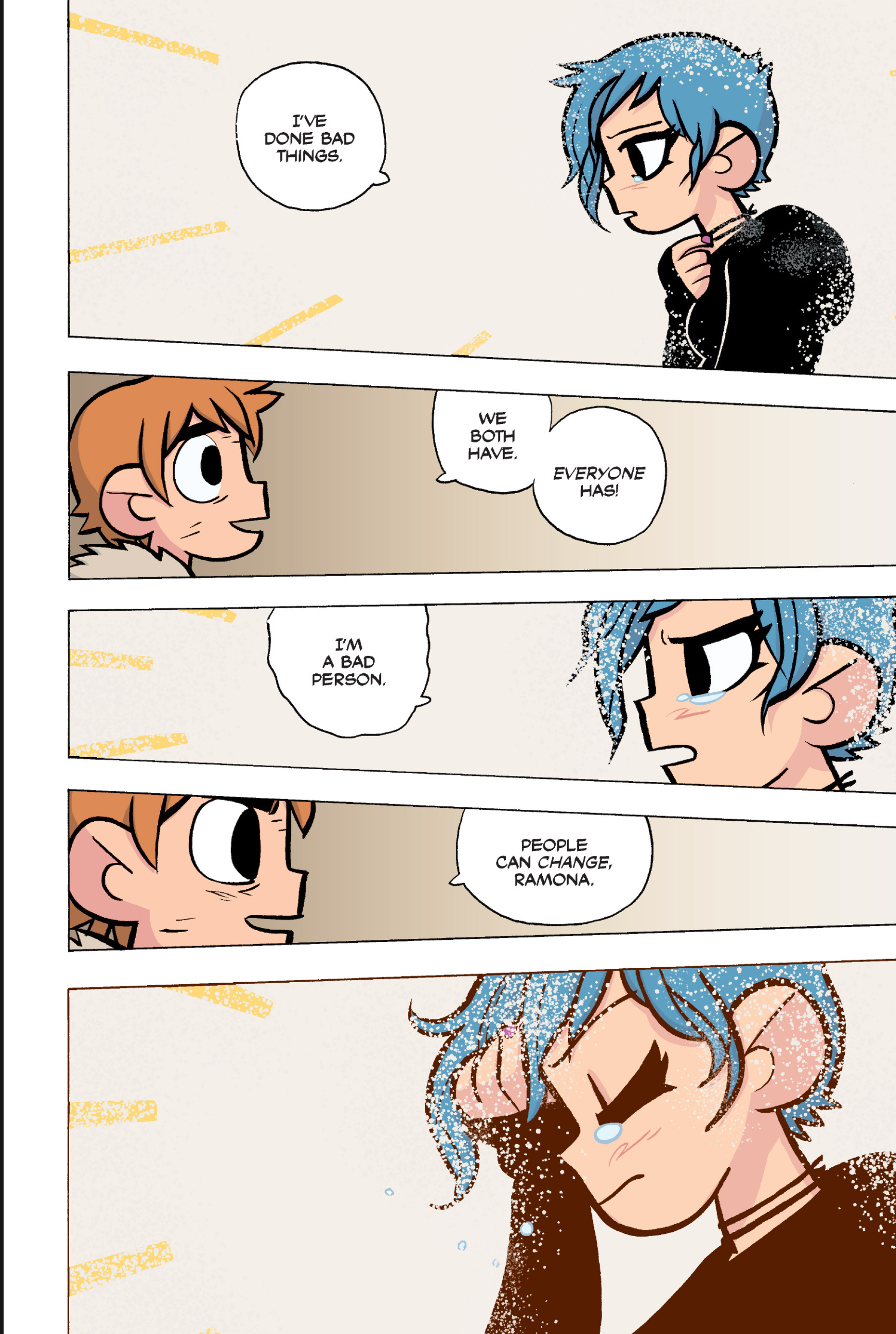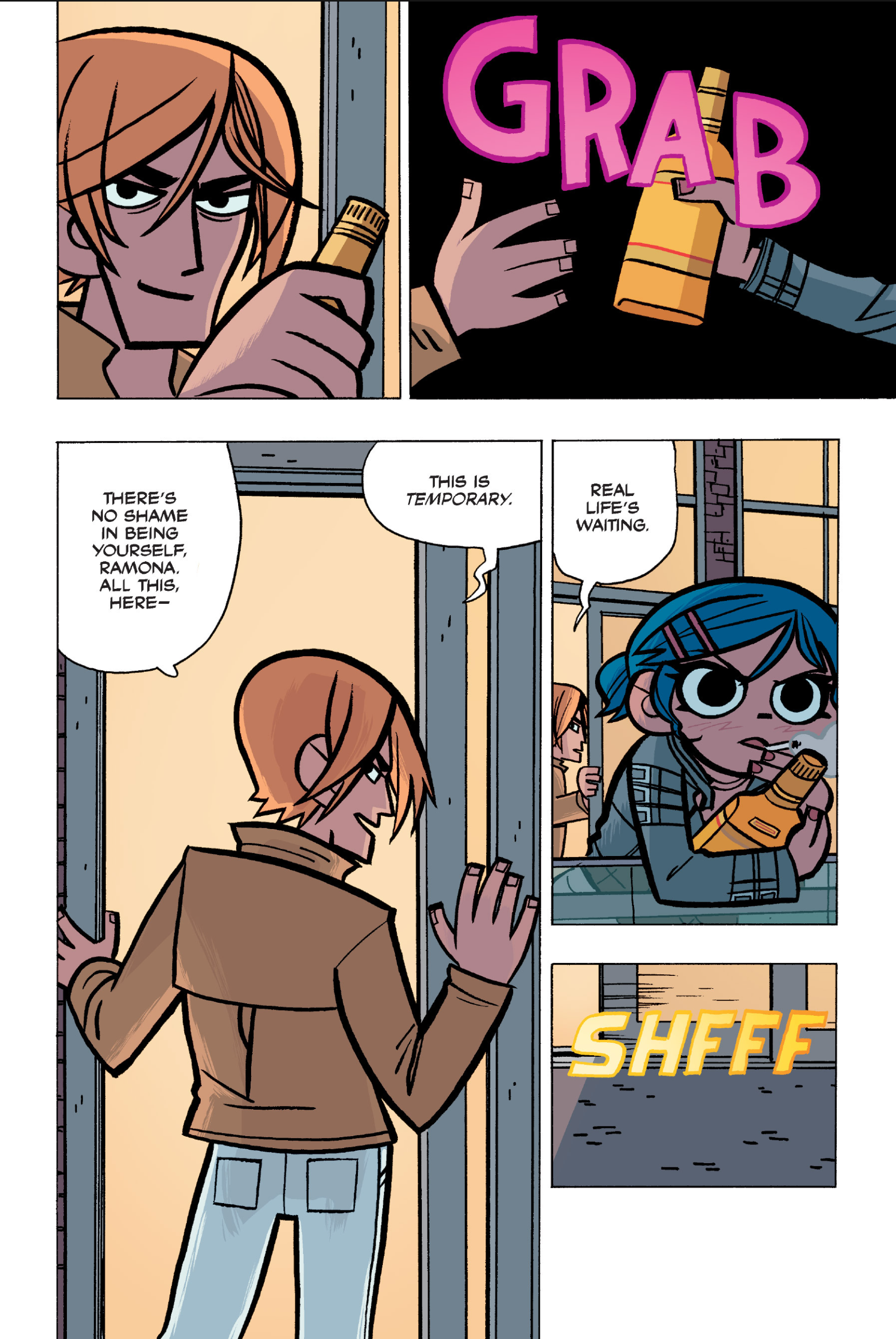 The comic never points this out but this is a particularly rough issue for Kim>No one givevs a shit about the band anymore due to their own issues, band left in limbo>Band performance cancelled because Scott is a disaster>Constant fights with her friends/roommates>Gets cheated on and has to live with the girl responsible>Kidnapped by two psycho's, when her ex shows up, has to lie to get him motivated because she's not enough on her own>Said ex then shows up on her doorstep, have to awkwardly share a bed with someone you clearly still have some level of buried affection for underneath all the pain he inflicted on youI don't blame her for moving