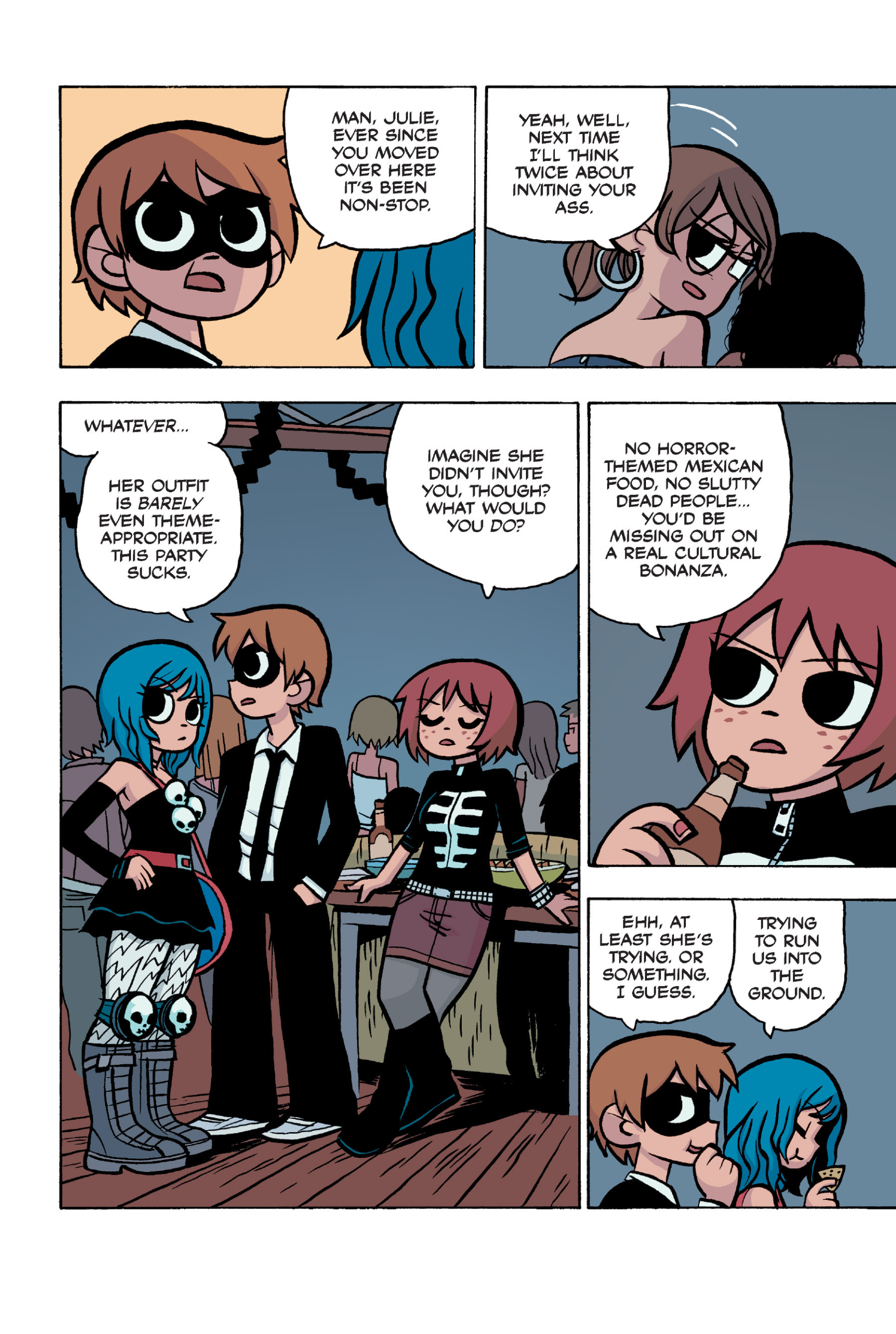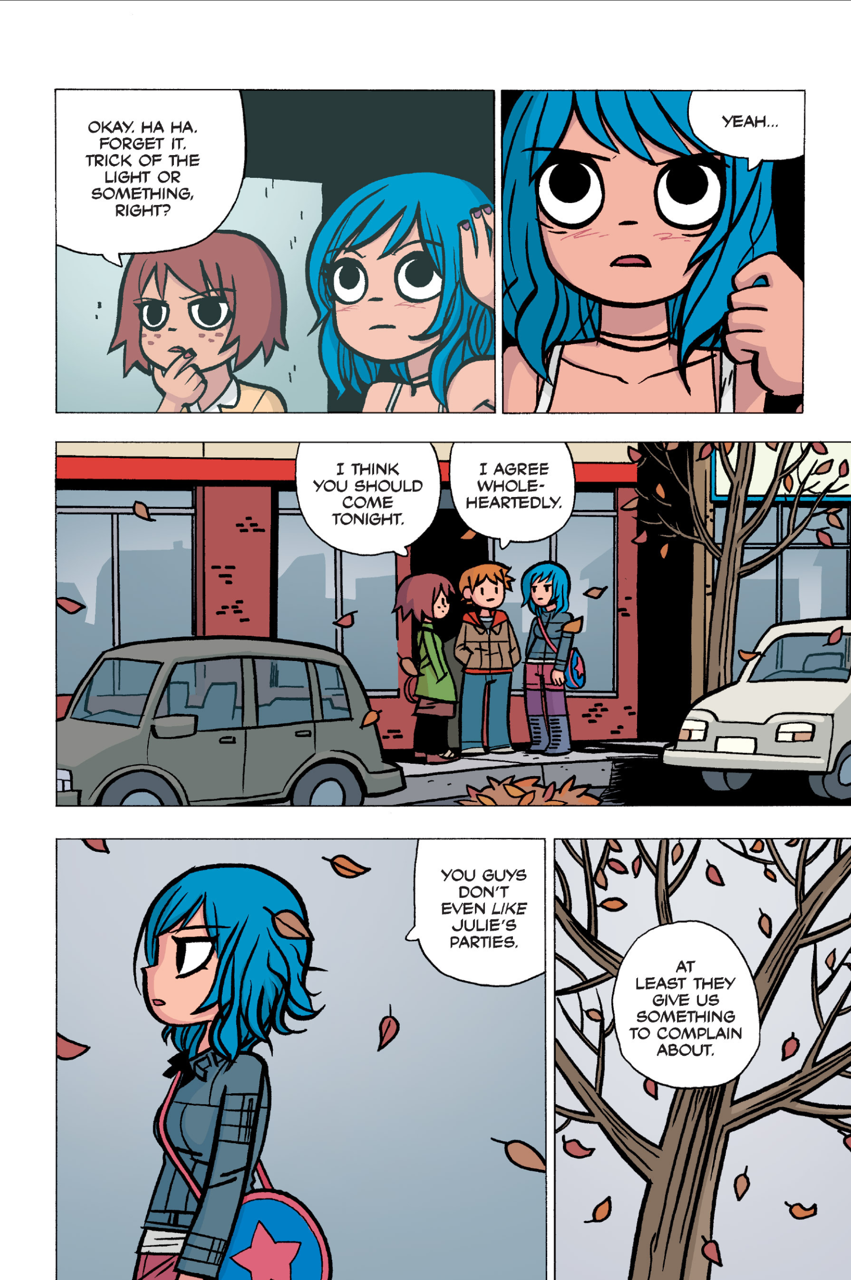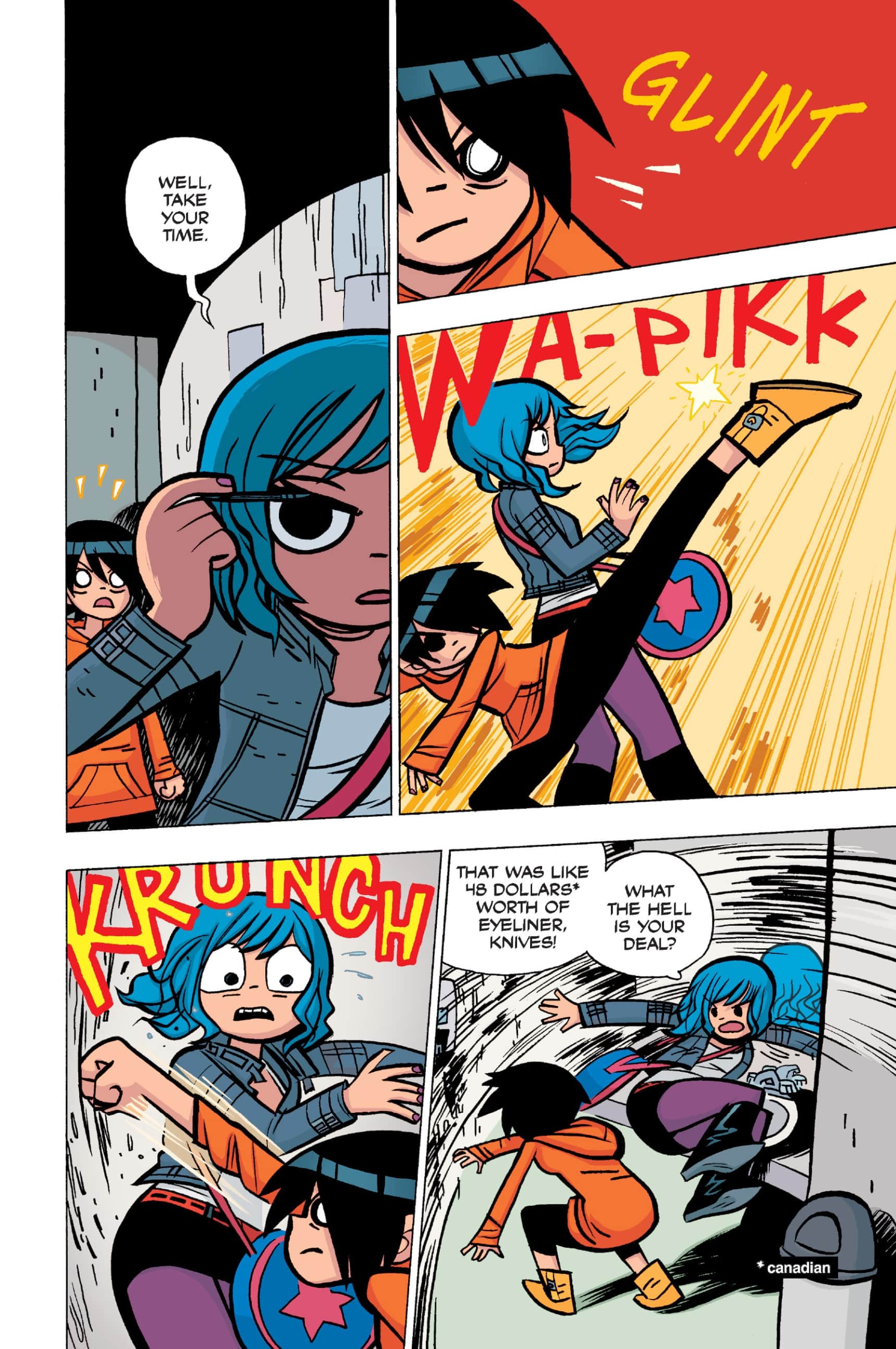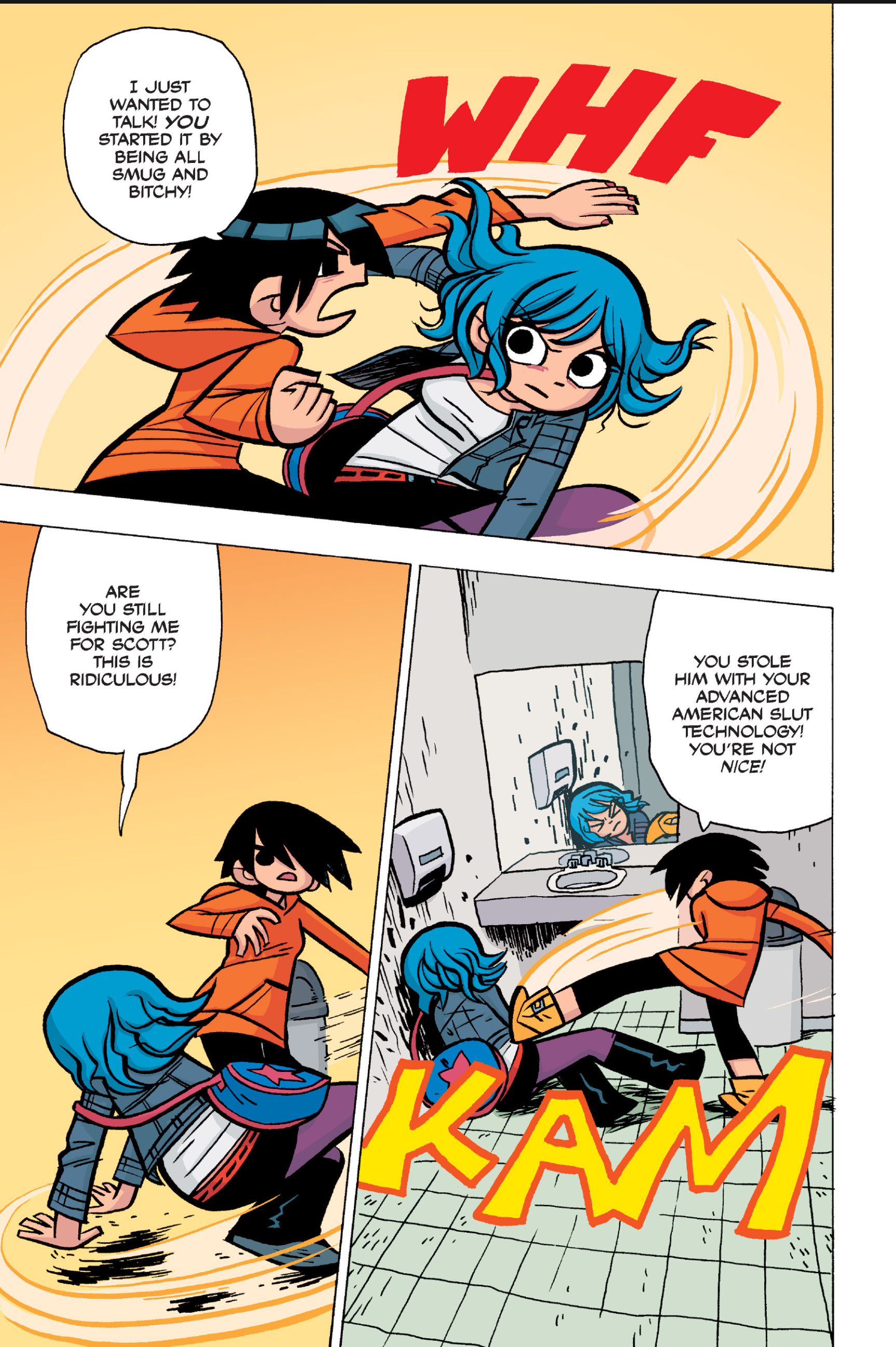 >>152907640I somewhat agree, I think the point I was trying to make was more about a pattern of repeating douche-ish behaviour from Scott over the whole comic. I don't think Scott is a bad friend, he's probably doing what he believes is his best and like you I don't think he is to blame for Kim being miserable.I do however think he should have made more of an effort at that precise moment to make sure Kim was OK, maybe walk her home or to a friend's at least, if he had brought her to Ramona's she would have understood since this is all kinda her fault in the first place. But yeah, even IRL we all sometimes get caught up in our own bullshit to notice that people we love are going through a bad time. Imo it's a bit difficult to judge Scott because the story always teeters between wacky comic logic and real-life 20s angst situations.