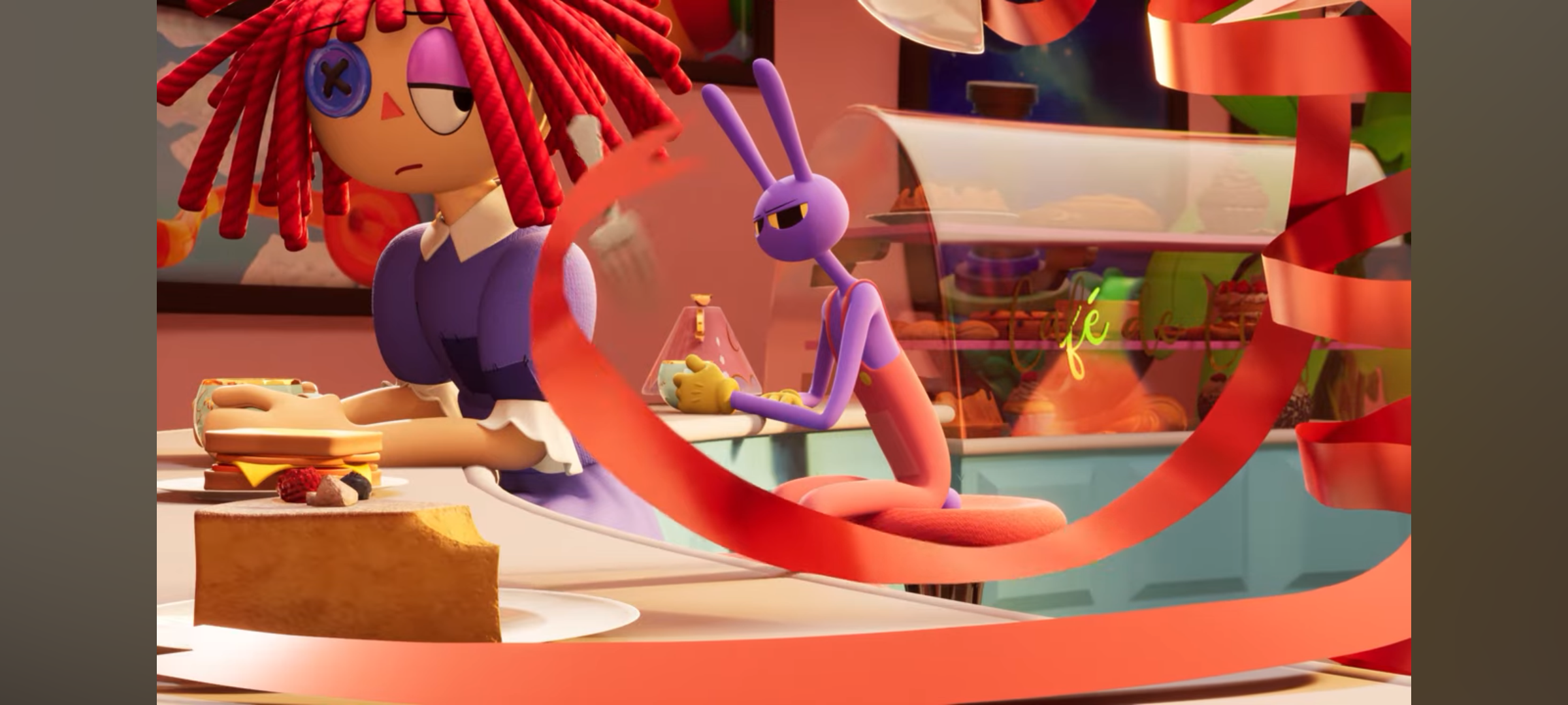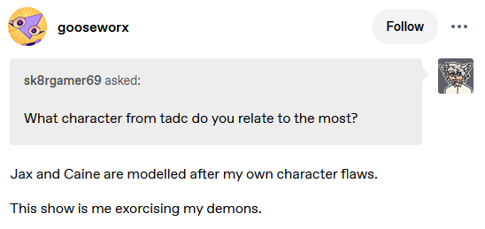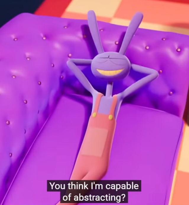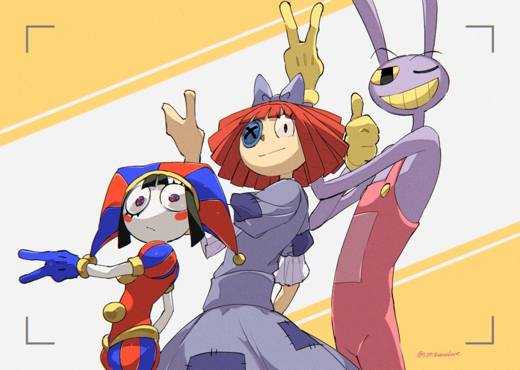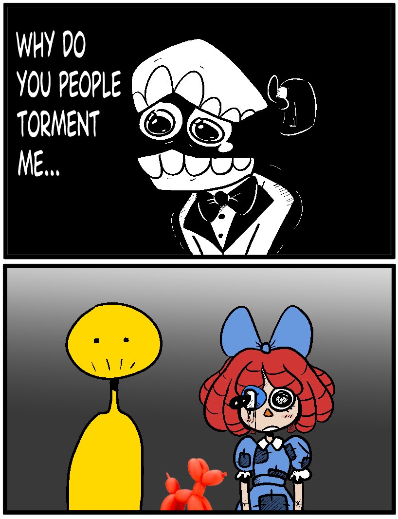 >pomni trauma with gummigoo included her fears of jump scares, horror themes and being touched>Jax trauma involving ribbit and kaufmo was that they would laugh at him and not that they died.Hmm