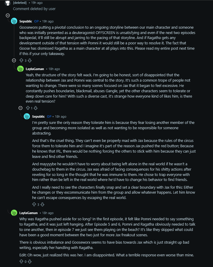 The previous Jax meltdown in episode 6 felt natural, but now they're forcing it.>This is LE Real??? Is Jax a retard? Hasn't he been in the digital circus for years already?