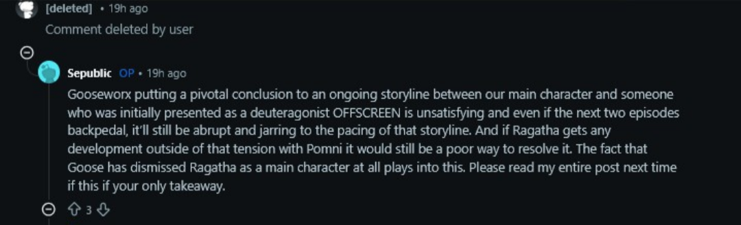 >>152903095Jax is getting really annoying. I know he’s Goose’s self-insert and loves him.But I find him annoying and his constant panic attacks are annoyingly repetitive.