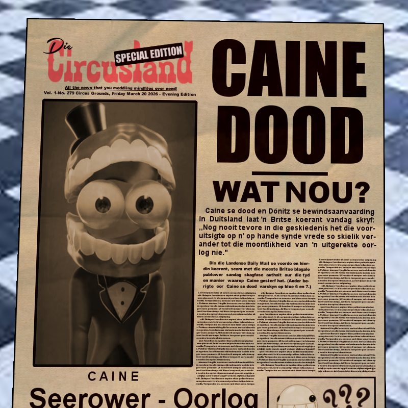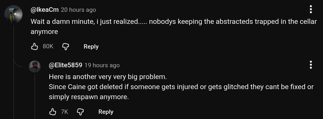 >>152903686Now that Caine is gone, there is nothing that holds the Abstractions back from escaping the cellarUnless Caine being deleted also deleted all the mind editing that Caine did to them and reverting them back to normal