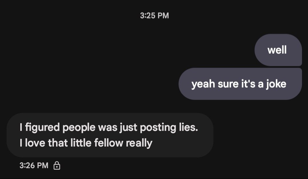 >>152905990He got so angry he was reset to a prior state.That same thing happened when Zooble asked to have sex.Real LLMs will do this if asked to do something that violates prior instructions.The only reason he didn't have this melty sooner was because he hadn't yet circumvented his own limitations.Remember when Pomni asked "Did Caine just say ass?"He and Bubble have been getting stronger as time went on.