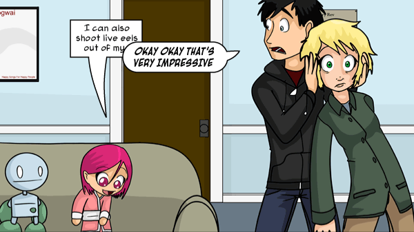 >>152950382you can't read too much into it, Jeph has a habit of writing dialogue in a group where two people are talking and one person is quipping in the corner being ignored (usually Marten)
