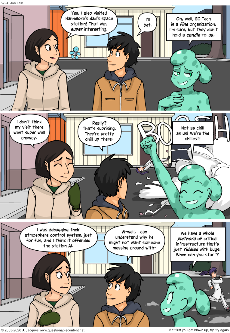 >>152910211>I mean it's only been 1224 comicsShe last appeared in 4367 in the background. So 1424 strips. At 260 strips a year, that's 5 and a half years. Prior to that, she was getting high and assembling a theremin. So what kind of bullshit excuse will Jeph make for her beating all the other job applicants other than nepotism?