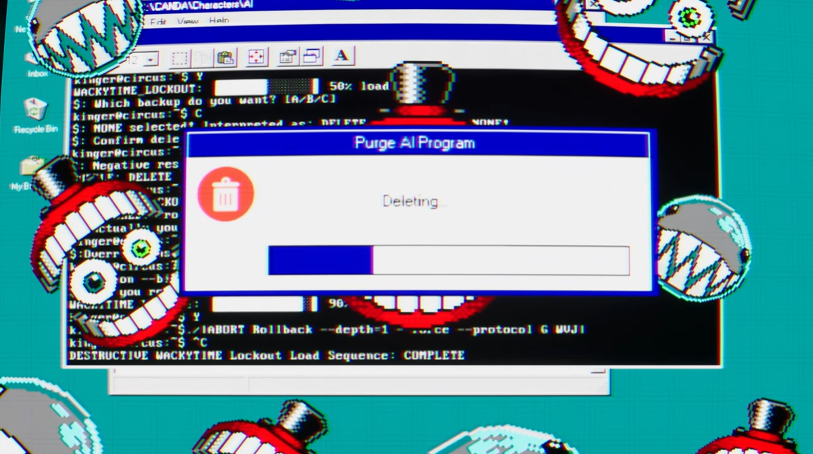 Caine wasn't fully deleted and just got trashed to the Recycle Bin, we see the trash icon. So they can restore him if they get another computer