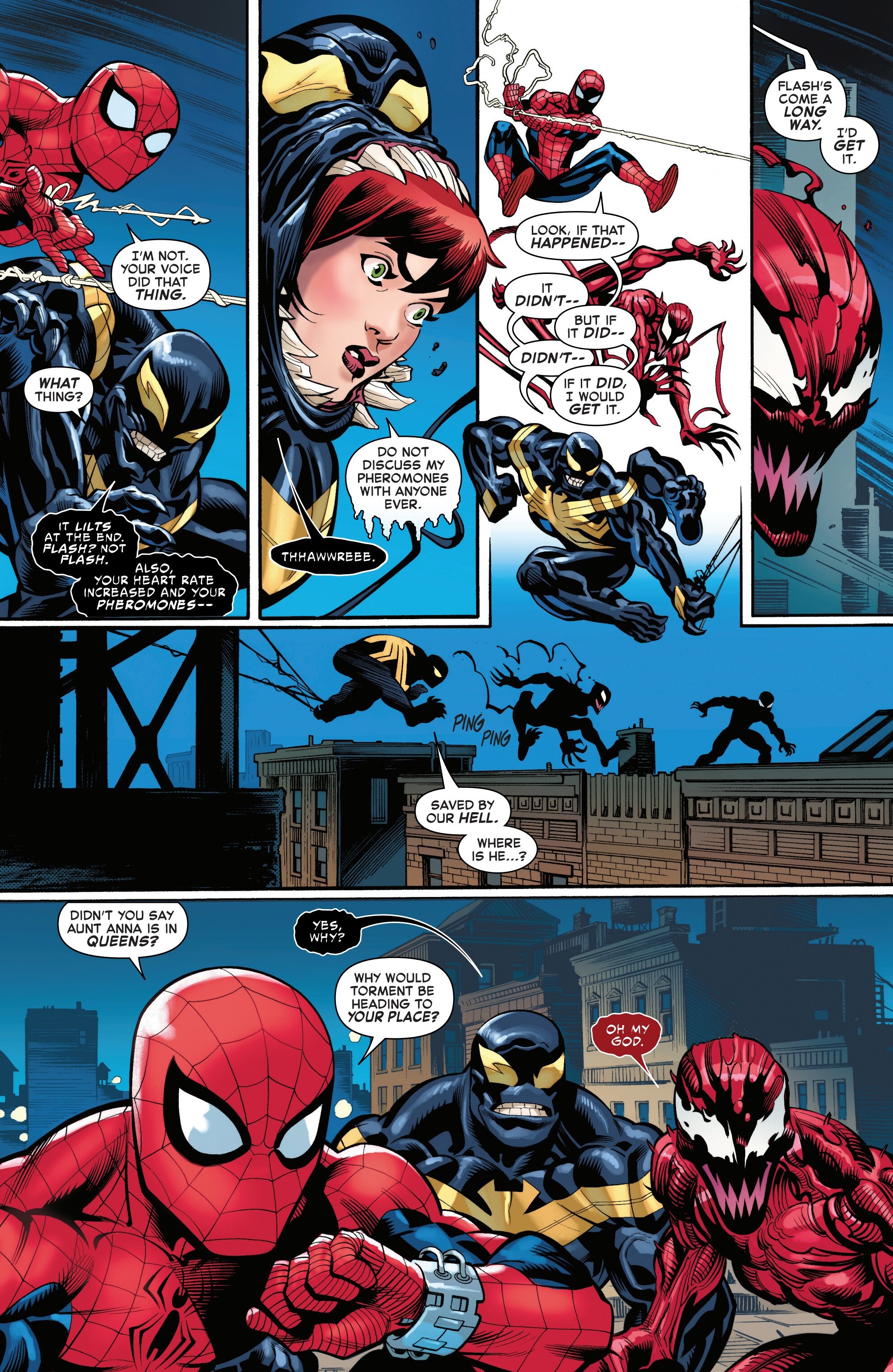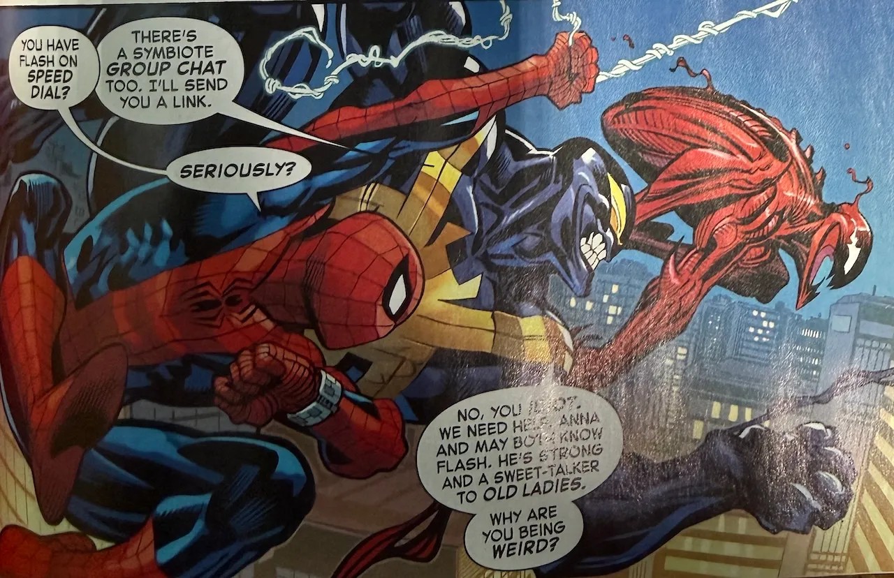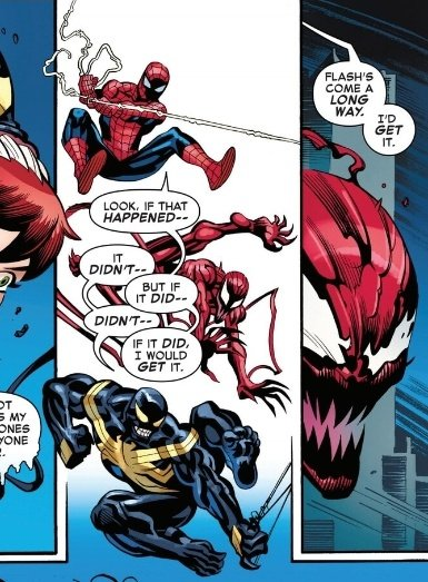 Making my bet now (i have been decetnly accurate so far so), mj or ana will be really hurt, which will cause peter to bond with the carnage symbiote, and mj will have a heart to heart that will break him out of it, either as a spider-island like moemnt so just a tease, or them actually getting toegher. And the flash stuff is just a misdirection>>152951149For a kill.>>152951152That is fair.>>152951203Given the fact that spider-carnage is the last thing before the convo that the petermj shipper keeps hyping up (and that he keeps saying flash/mj isnt happening), nah.>>152951308This too.