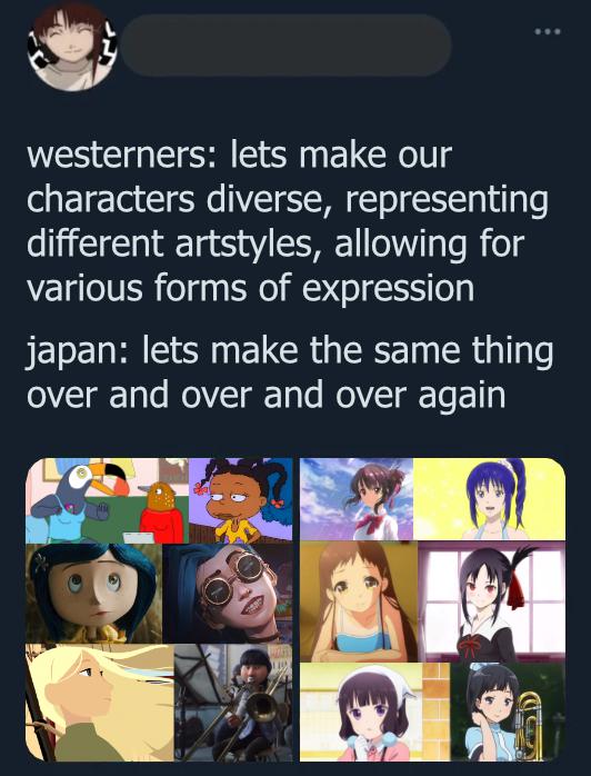 >>152950670If you want to talk about anime, go to /a/. I think blatant east vs west threads like these should be considered off topic, all they exist for is leeching anime into /co/ like with that shitty toonami general that comes up sometimes. Get rid of that too. Anyways, it depends. I like cartoons more by a country mile, but if you want to be free of western trappings you can go with anime. I don't want to just shit on it, but it is different, and I don't think the Japanese really make much animation worth seeing these days compared to years ago. All the anime people care about are old. Same with cartoons a lot of the time. Me, I prefer my animation with some humor, but I can't deny that some of the girls are cute, in a sterile, alien kind of way, usually. Another thing I like about cartoons more is they are less afraid to NOT be sterile. Anime tries to compensate for this by being edgier but really these are the fart jokes of eastern animation. Wow, another character died, whoopee.