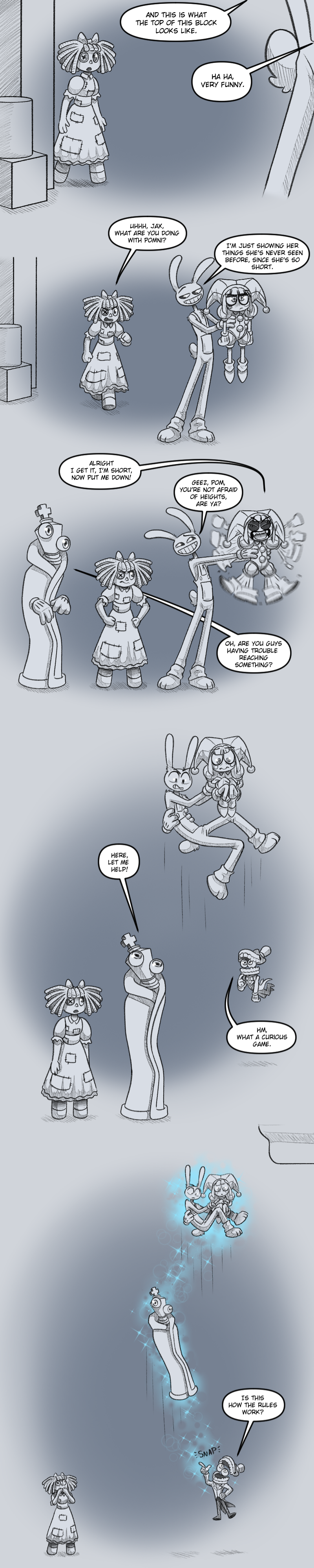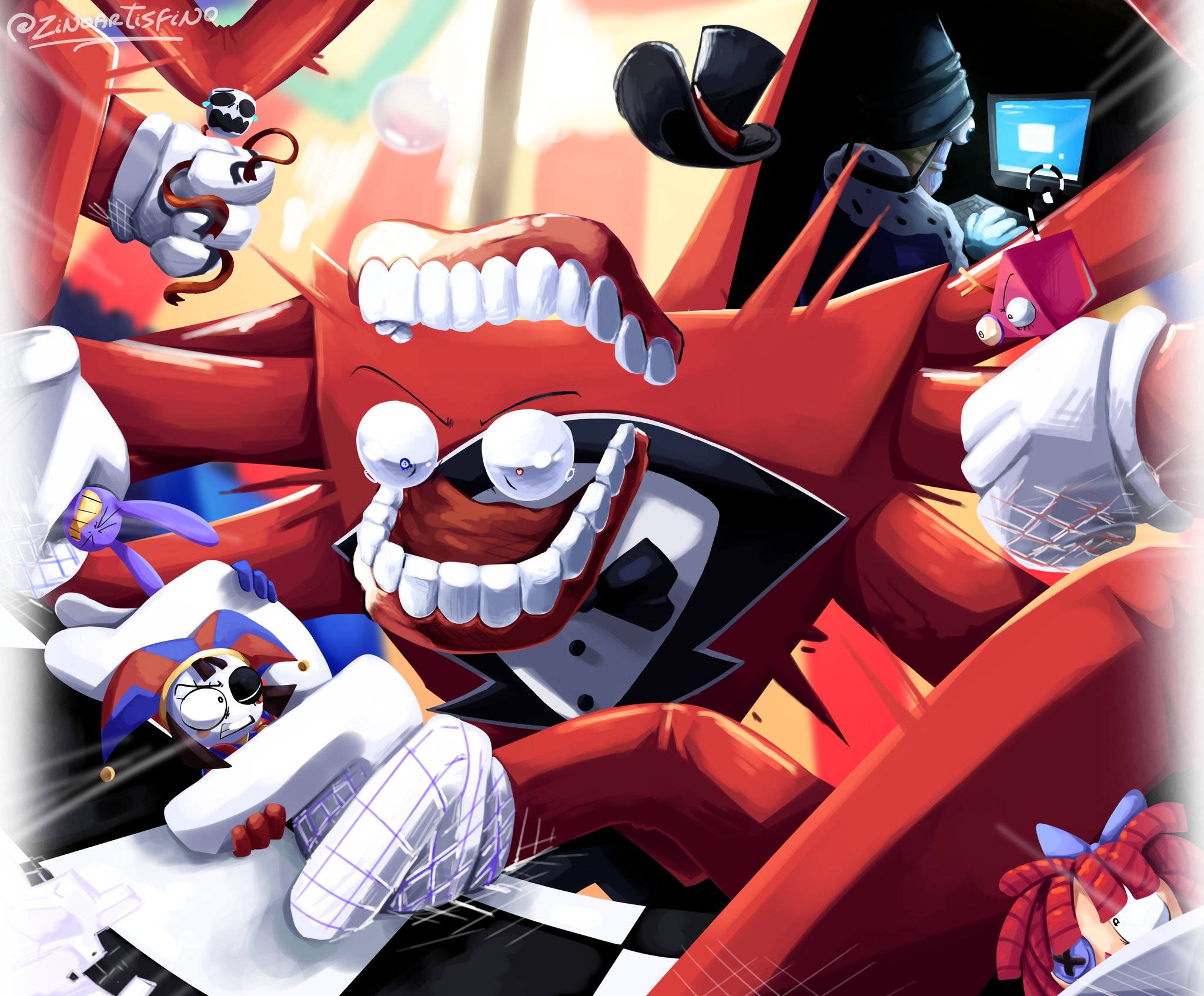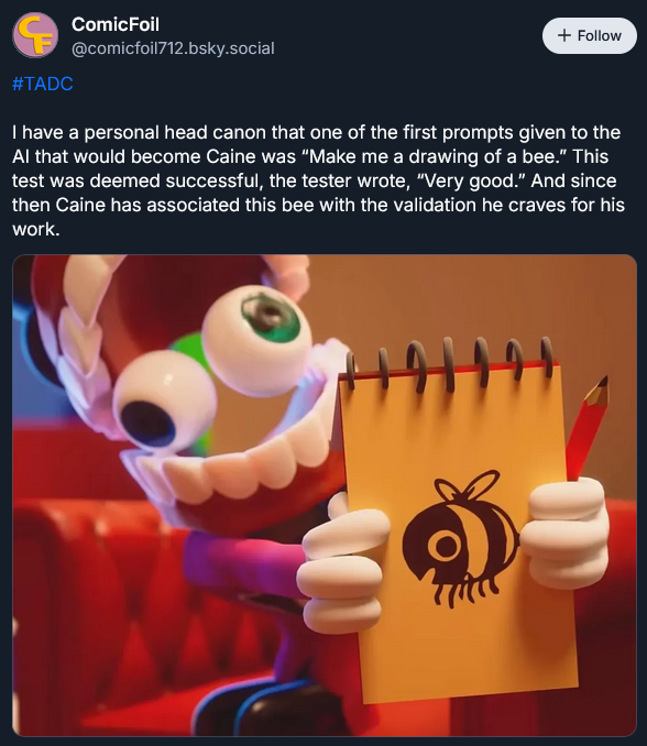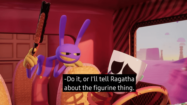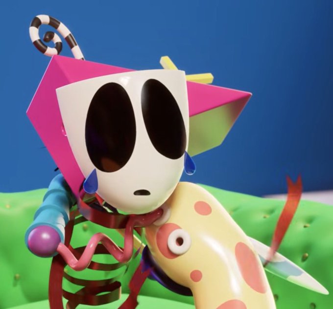 Between Caine just giving him visions of being flayed by Ribbit and Pomni (oh and Kaufmo was there too), and actual Pomni not telling him about Kinger being sane (leading to an unexpected and public shattering of his worldview) I wonder if Jax will be a bit skittish towards Pomni in episode 9He was skittish towards Caine at the beginning of 8 before he'd even done anything, just operating on the knowledge that Caine lied about his level of control over them. For someone like Jax who goes out of his way to acquire as much information about others as possible (while giving away as little as he can), Pomni letting him find out about Kinger like that might sting a little in hindsight, at least after such a brutal confrontation with his social fears.