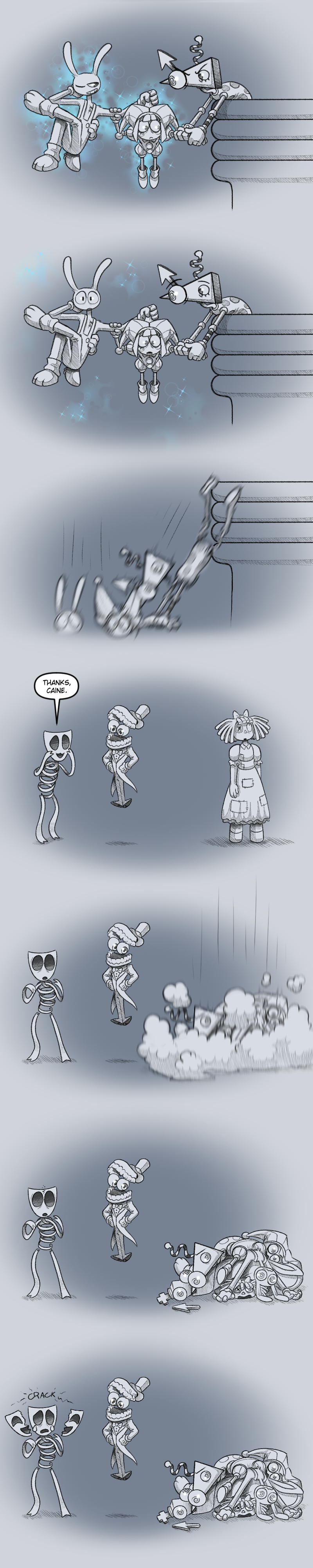 >>152956600Jax hit the button because he was scared of Caine, he was pretty freaked out by Caine’s trick and questioning everything, then Pomni and Kinger suddenly have a plan. He might be wondering who else is an AI made by Caine and assume Caine being deleted is another fake out if something weird happens.>Congratulations, my little cattywampus cucumbers! You picked the good ending, where you realize you'd rather stay with me than go back to that pesky old macroverse, or whatever we decide to call it! I knew you'd make the right choice!If everyone else decides to bring Caine back out of the goodness of their hearts, Jax might turn on them because he was proven right last time.
