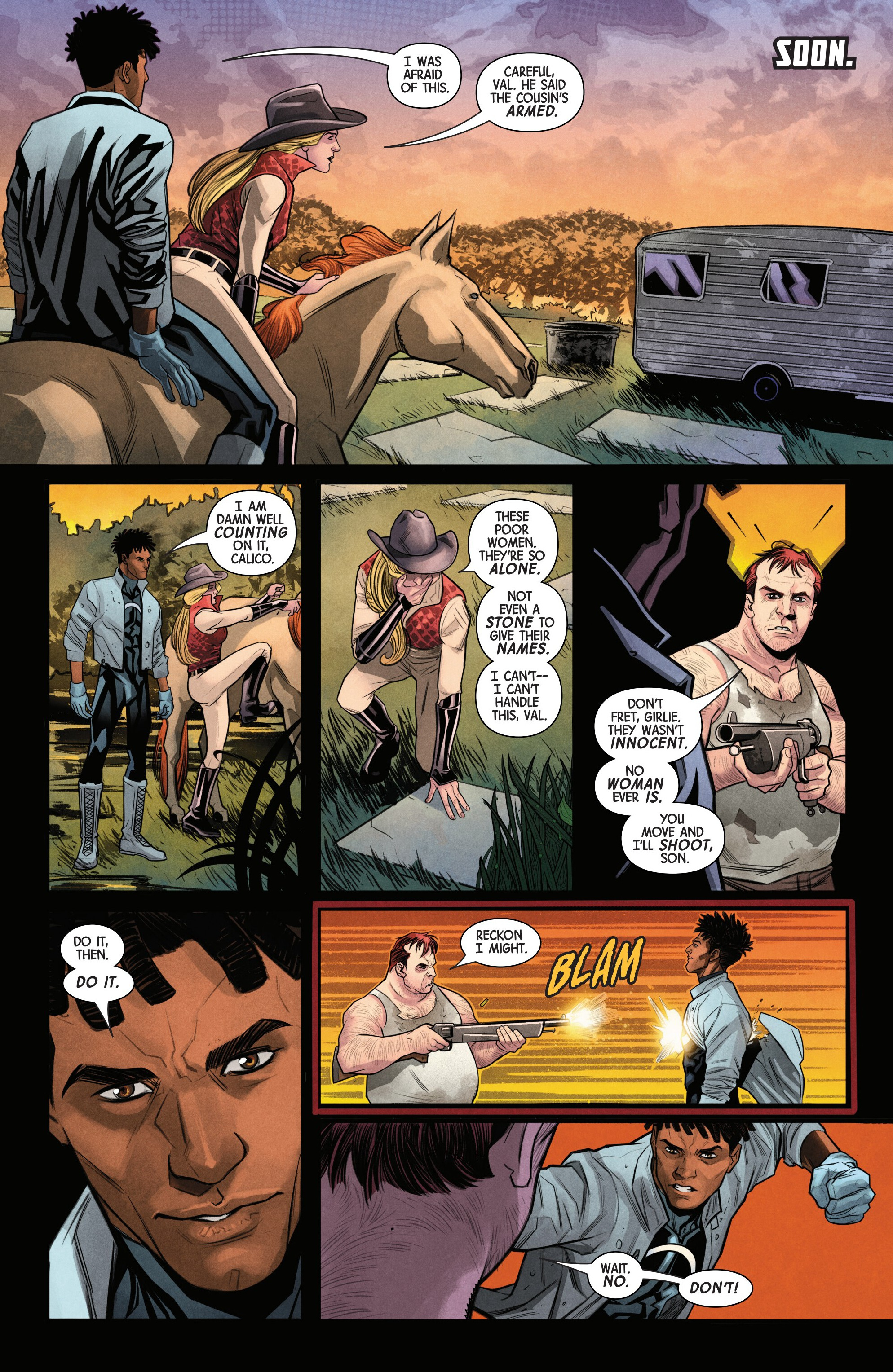 Last time, X-Force went on a mission to defeat Barberry Boone, a man from the Blasphemy Cartel who had kidnapped the Ephemera Angel Anielle (an obscure character from Gambit’s second mini) so that he could torture her to hunt for mutants. When Cable freed her, he asked her if Akihiro was Kamala’s potential killer to which she denied, meaning that it was down to Boom-Boom or Angel.Meanwhile, Domino is continuing to spy on Cable, and notices that he had secretly stolen the SHIELD data that Boone was keeping…