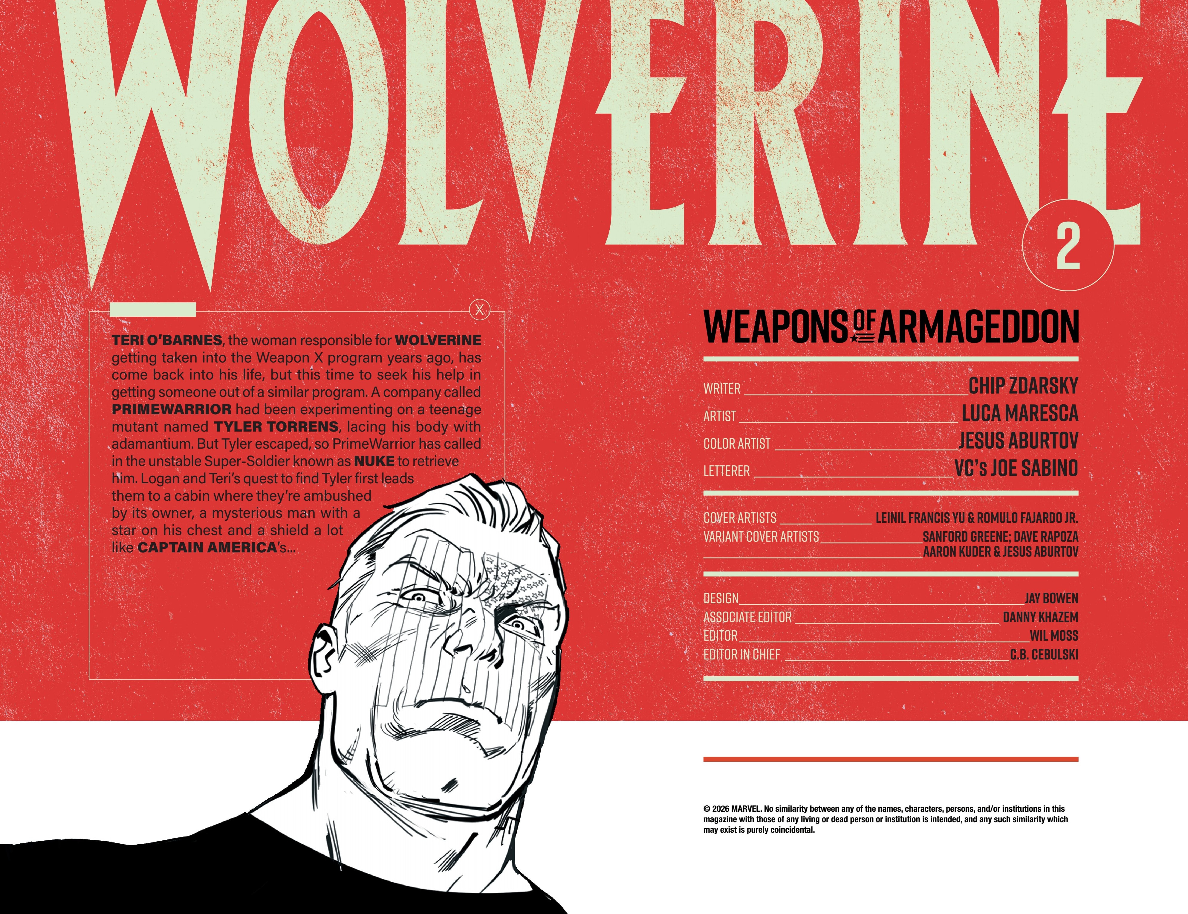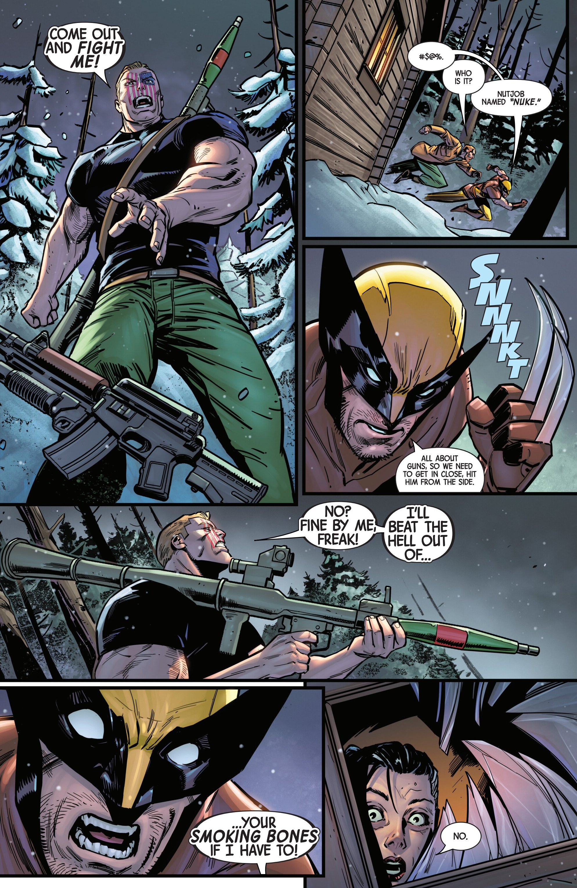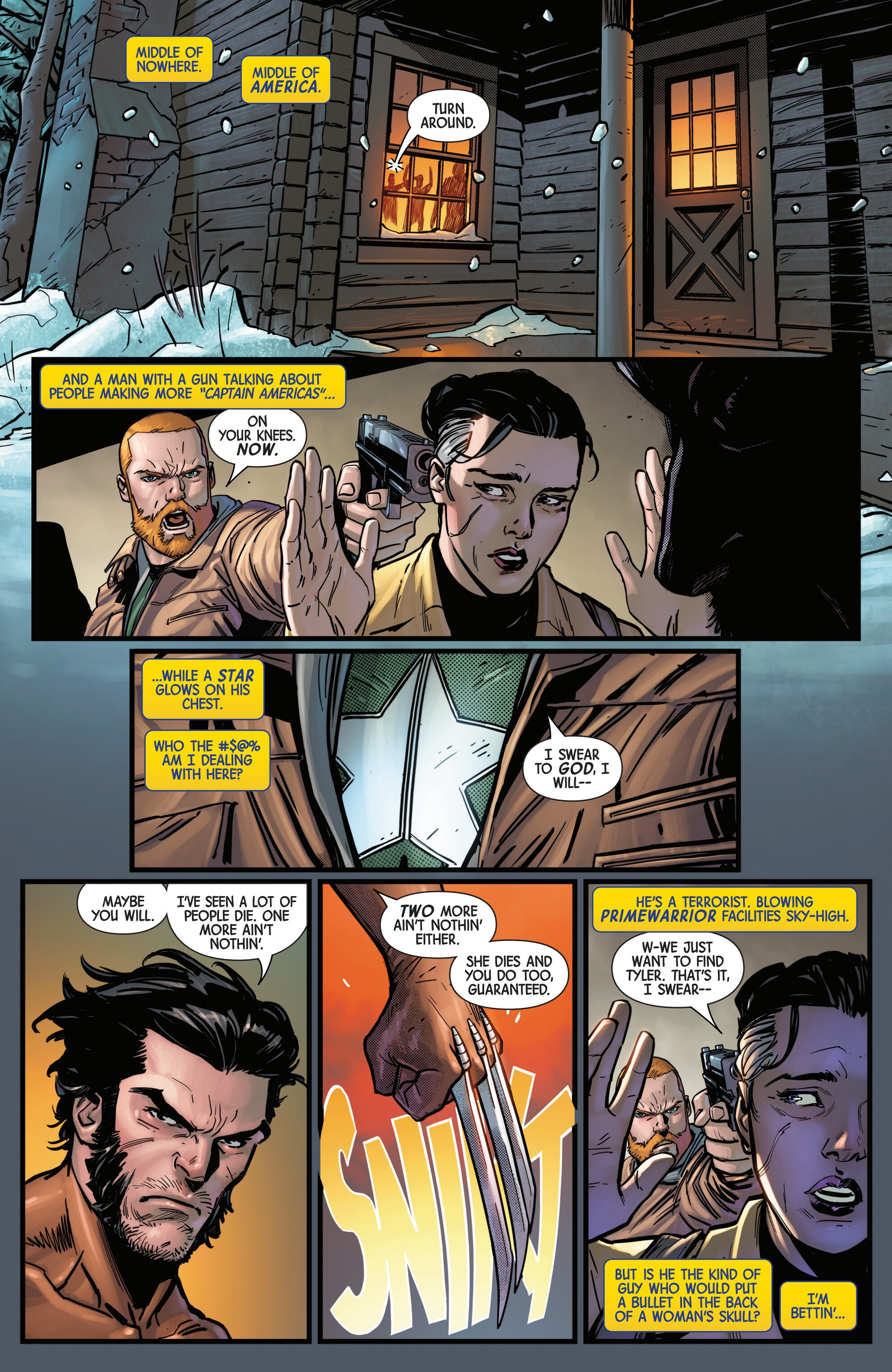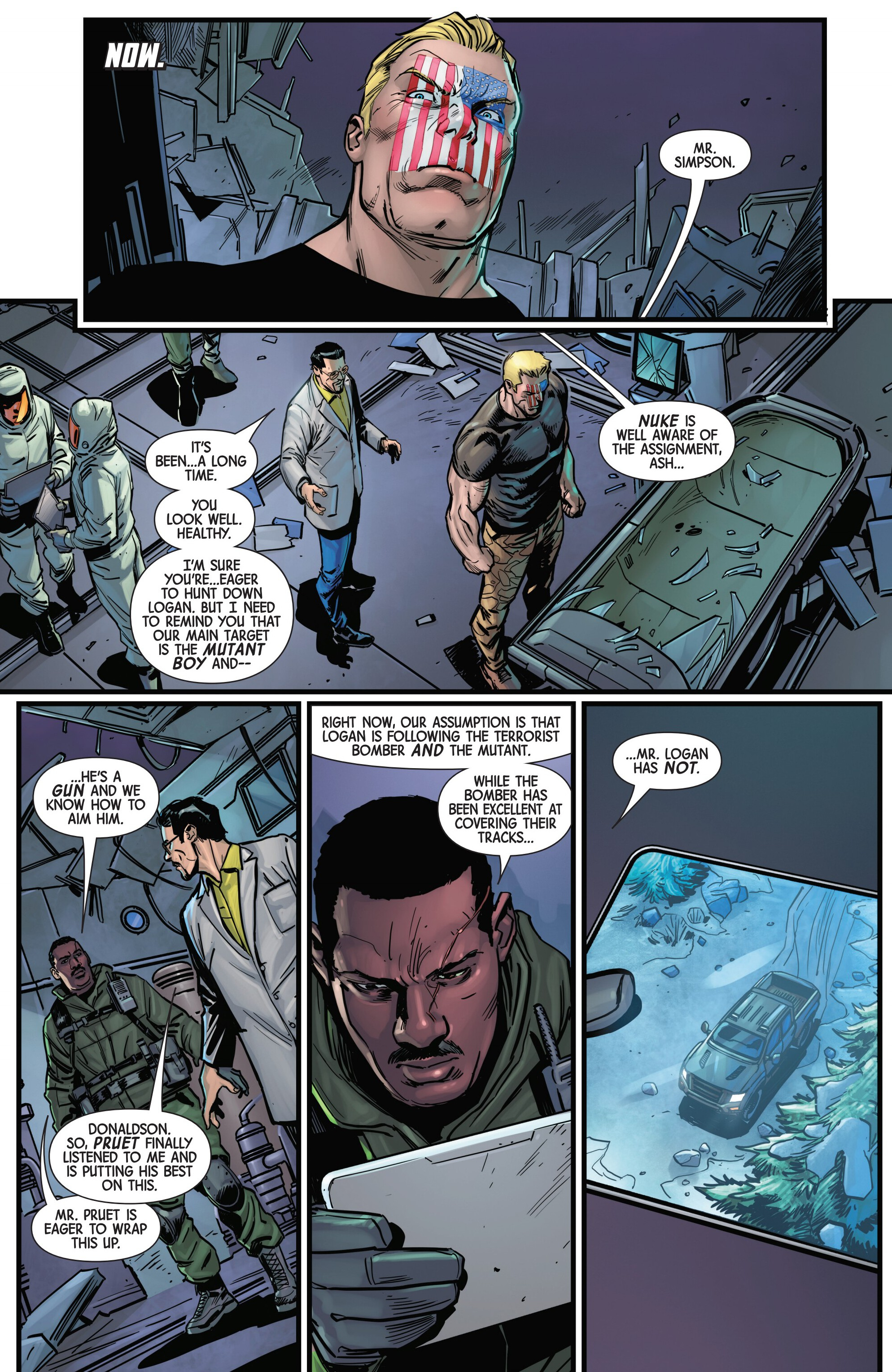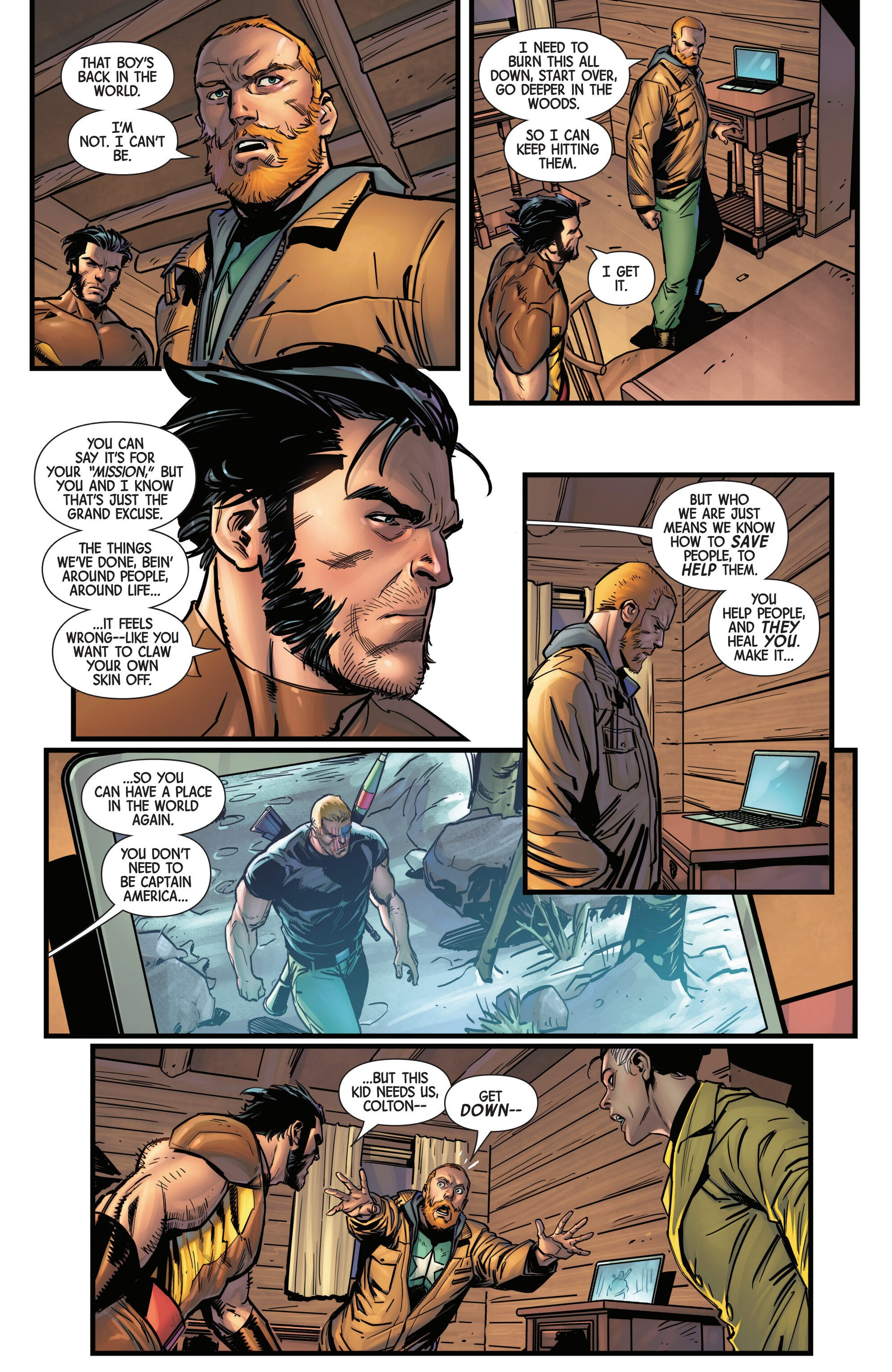 Previously on our journey towards Armageddon, Logan met up with the mutant tracker Teri O'Barnes, who was responsible for assisting the Weapon X program to kidnap him back during the original Weapon X storyline (don’t worry, she apologized for it). Teri told Logan about PrimeWarrior, a private military company that has been hosting their own super-soldier project and replicating the methods used by Weapon X: they’re kidnapping mutants with healing factors and putting them through the same experience that Logan once went through. While Teri has been able to stay a step ahead of PrimeWarrior and save many mutants by relocating them and fixing them new identities, PrimeWarrior was still able to kidnap a man named Tyler Torrens and place him in their facility in the Ozarks, and Teri needed Logan's help to save him.Traveling to the Ozarks, they were surprised to see that the facility had already been blown apart by a bomber who had been targeting PrimeWarrior facilities, with Tyler nowhere to be found and an origin box also reported to be missing. Continuing their search, Logan ends up tracking Tyler's scent to a cabin surrounded with deadly booby traps. The cabin’s owner? The bomber of PrimeWarrior's facilities and former Captain America: Dave Colton!Meanwhile, PrimeWarrior's CEO Pruet got the info that Logan had been inside the Ozarks facility, and called in Nuke to go after him…