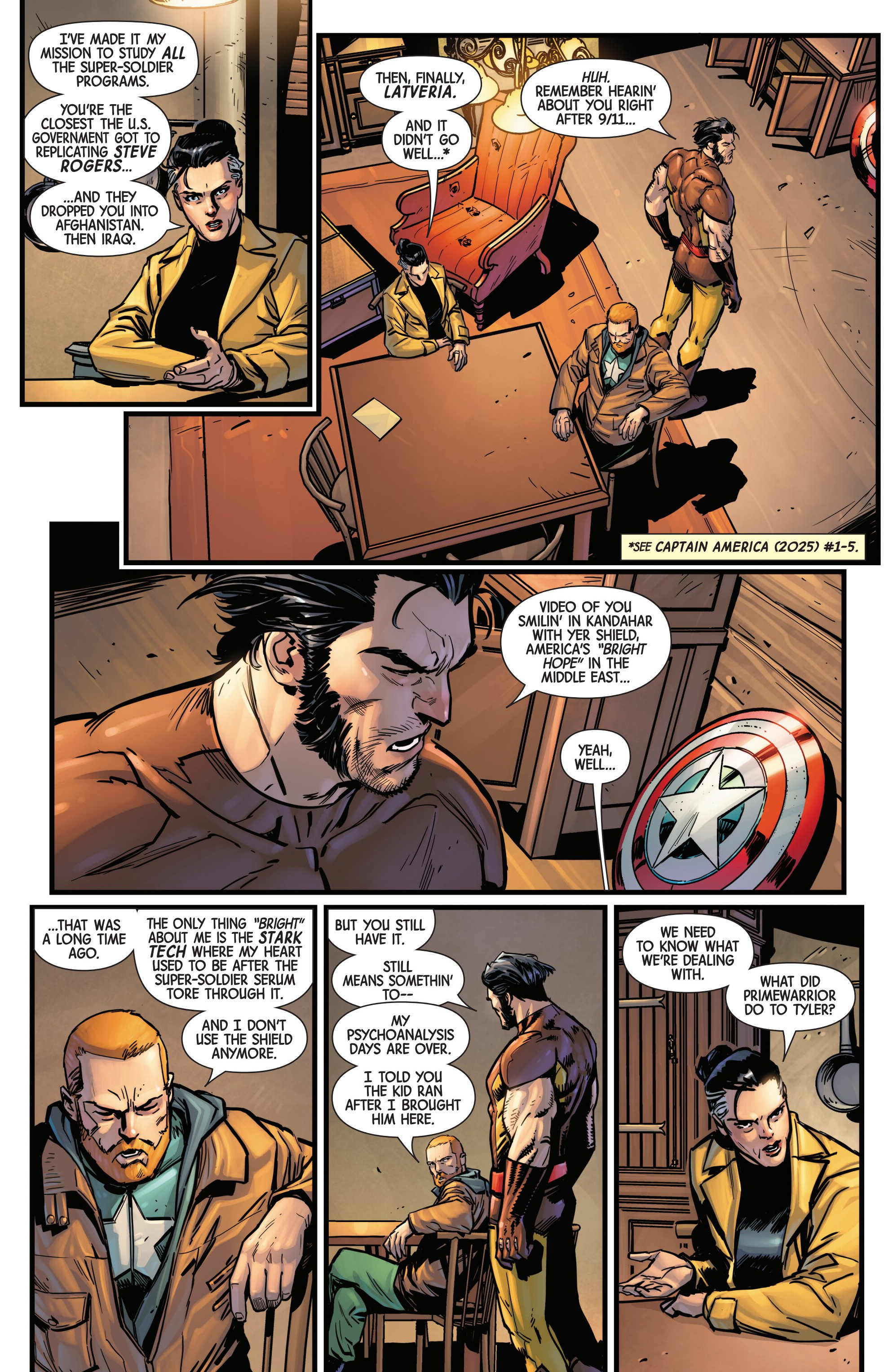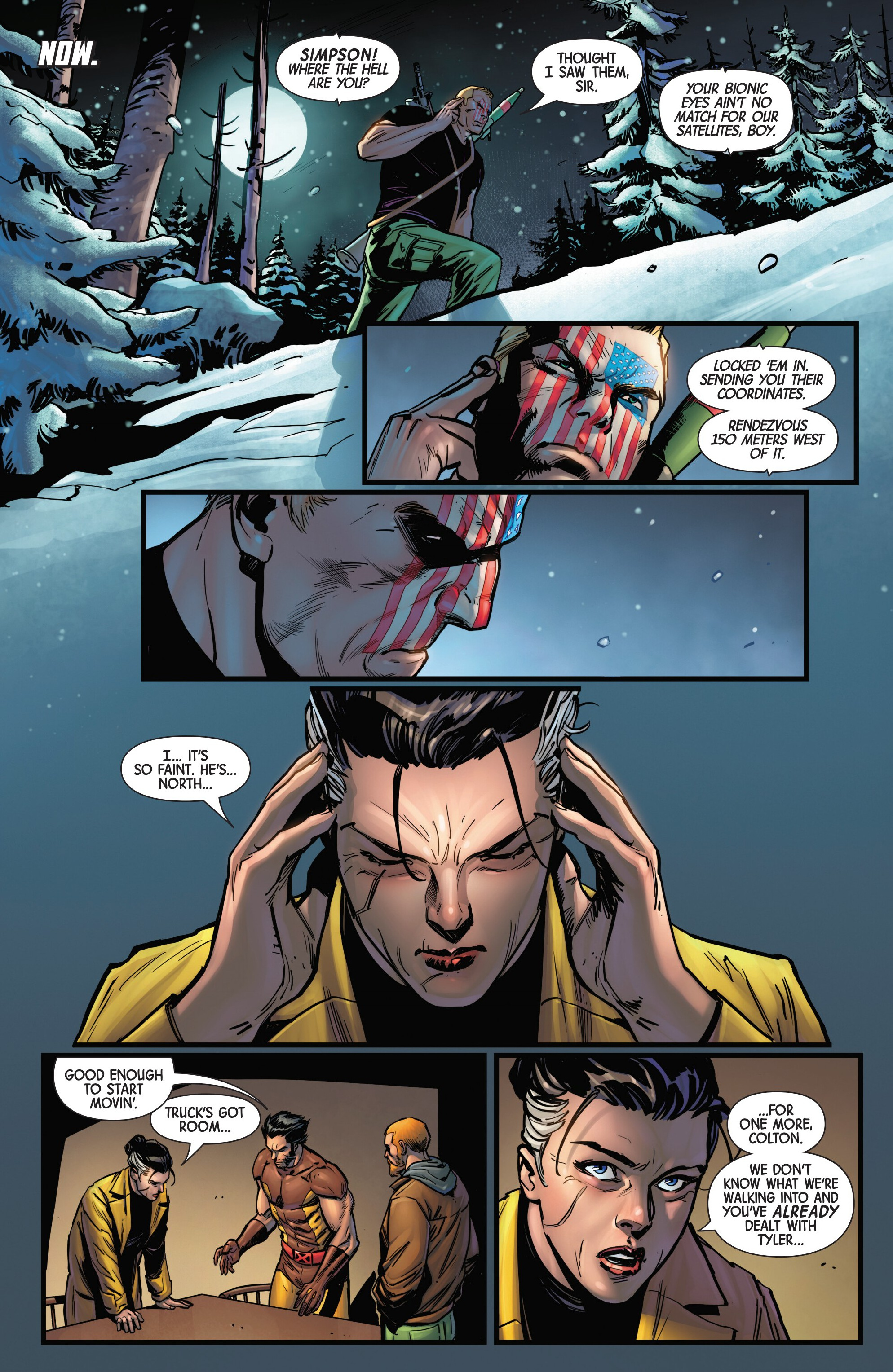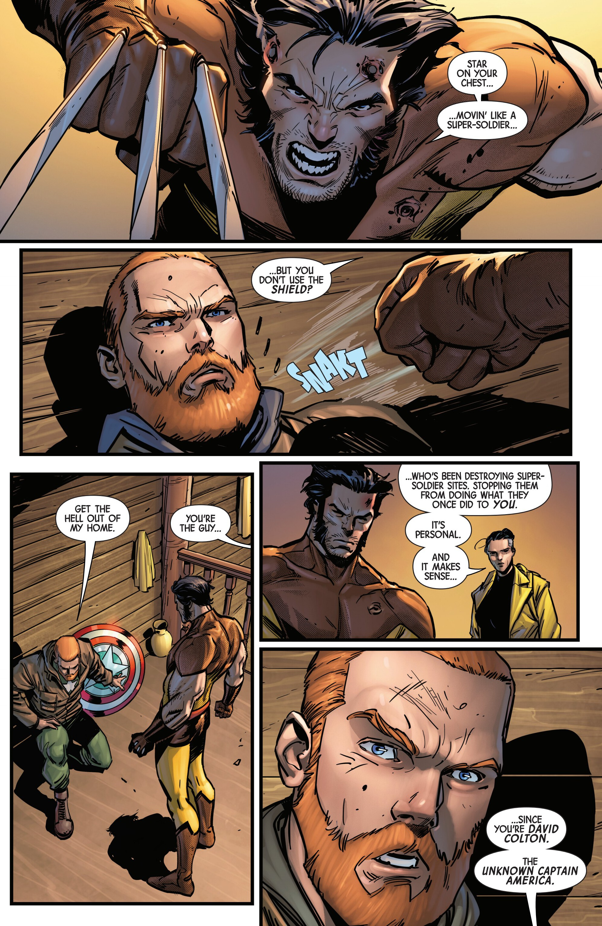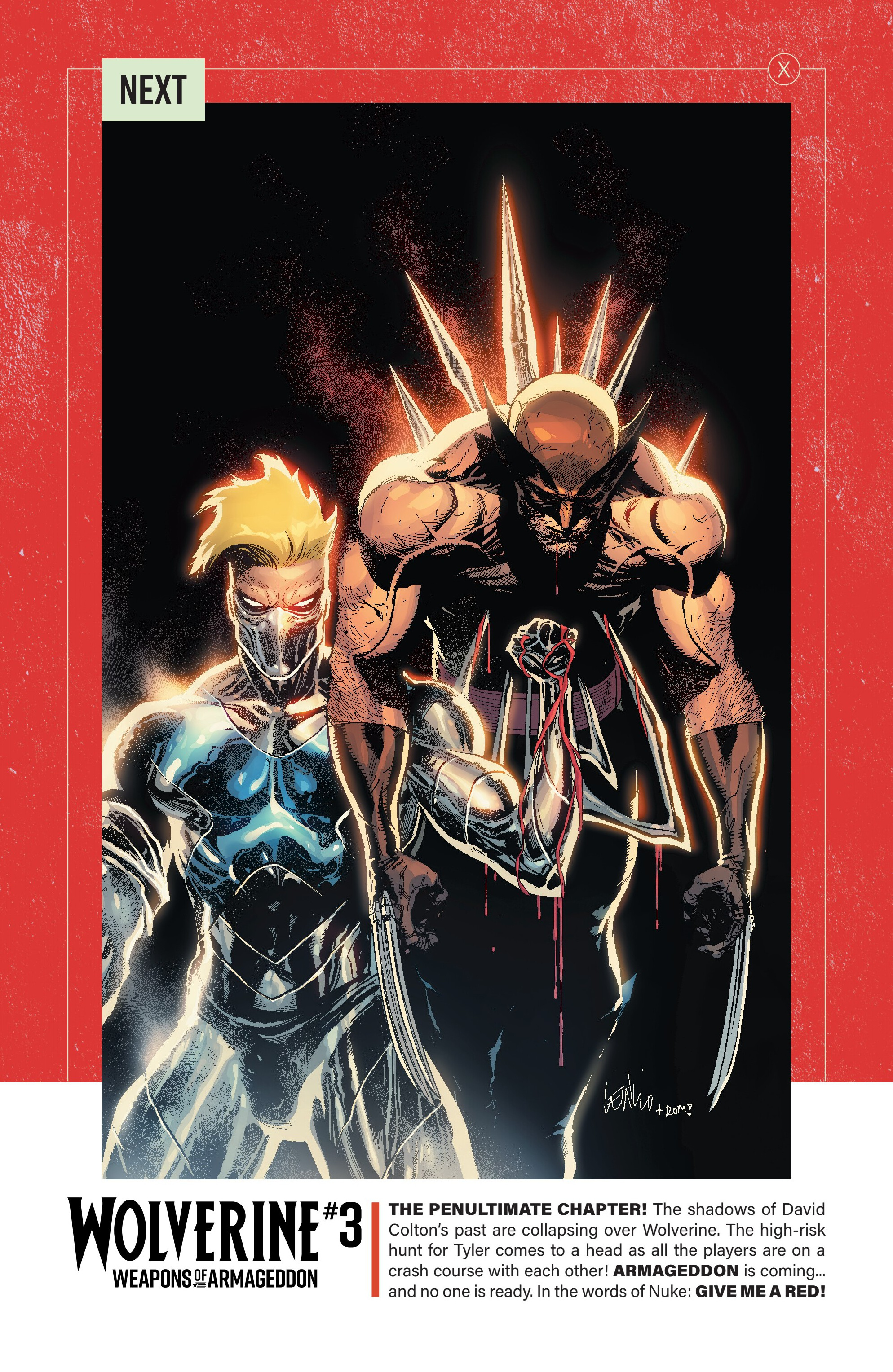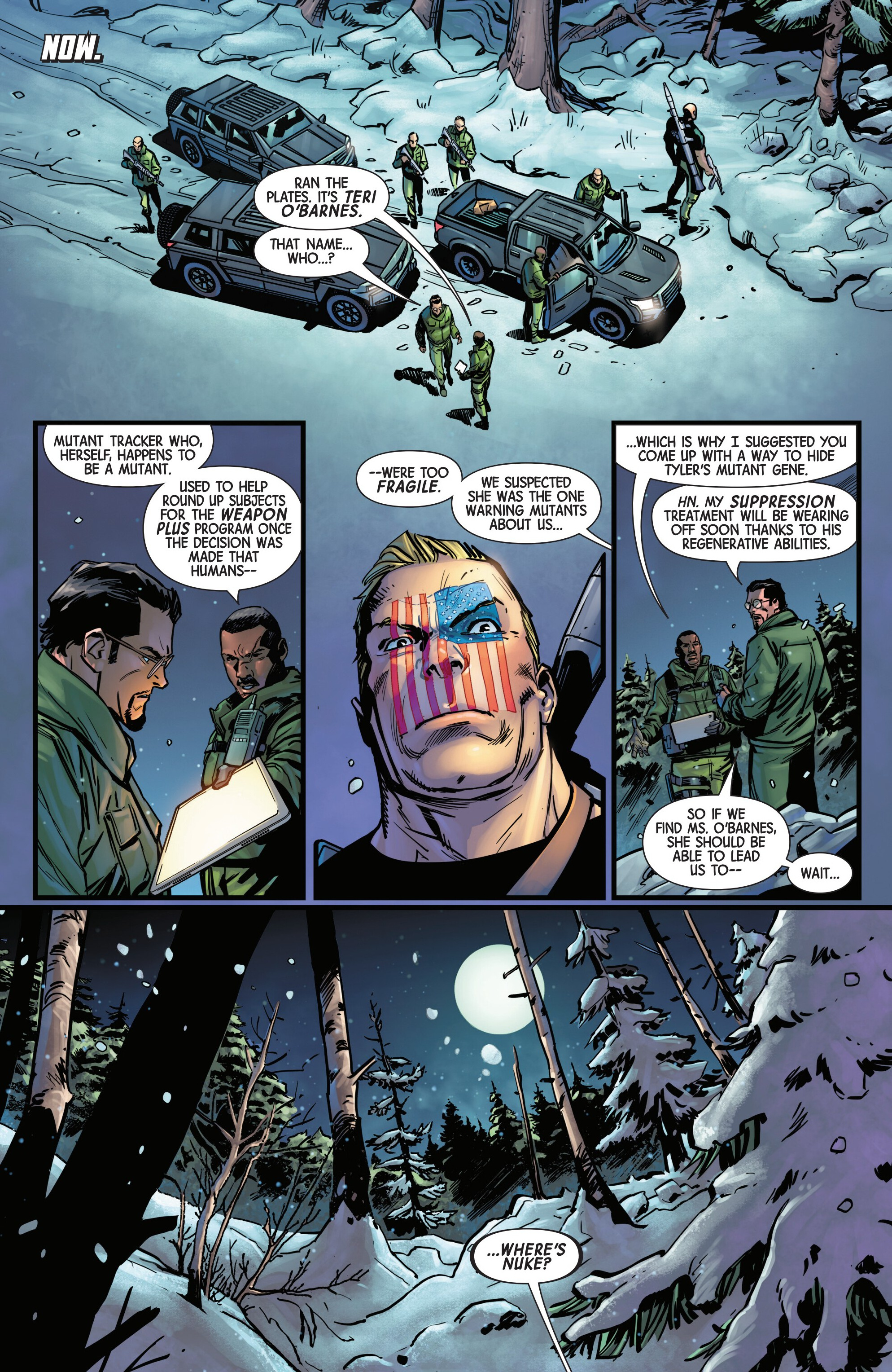 Previously on our journey towards Armageddon, Logan met up with the mutant tracker Teri O'Barnes, who was responsible for assisting the Weapon X program to kidnap him back during the original Weapon X storyline (don’t worry, she apologized for it). Teri told Logan about PrimeWarrior, a private military company that has been hosting their own super-soldier project and replicating the methods used by Weapon X: they’re kidnapping mutants with healing factors and putting them through the same experience that Logan once went through. While Teri has been able to stay a step ahead of PrimeWarrior and save many mutants by relocating them and fixing them new identities, PrimeWarrior was still able to kidnap a man named Tyler Torrens and place him in their facility in the Ozarks, and Teri needed Logan's help to save him.Traveling to the Ozarks, they were surprised to see that the facility had already been blown apart by a bomber who had been targeting PrimeWarrior facilities, with Tyler nowhere to be found and an origin box also reported to be missing. Continuing their search, Logan ends up tracking Tyler's scent to a cabin surrounded with deadly booby traps. The cabin’s owner? The bomber of PrimeWarrior's facilities and former Captain America: Dave Colton!Meanwhile, PrimeWarrior's CEO Pruet got the info that Logan had been inside the Ozarks facility, and called in Nuke to go after him…