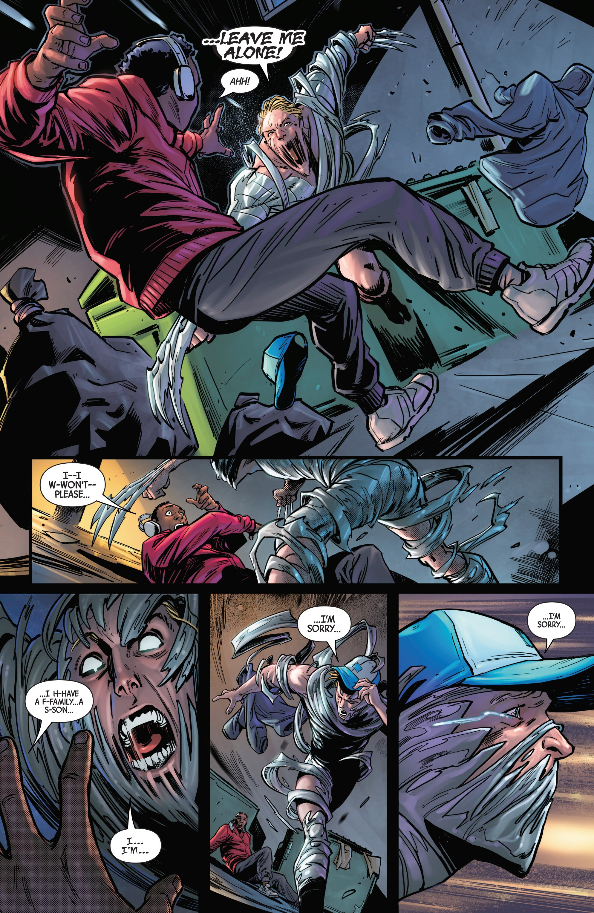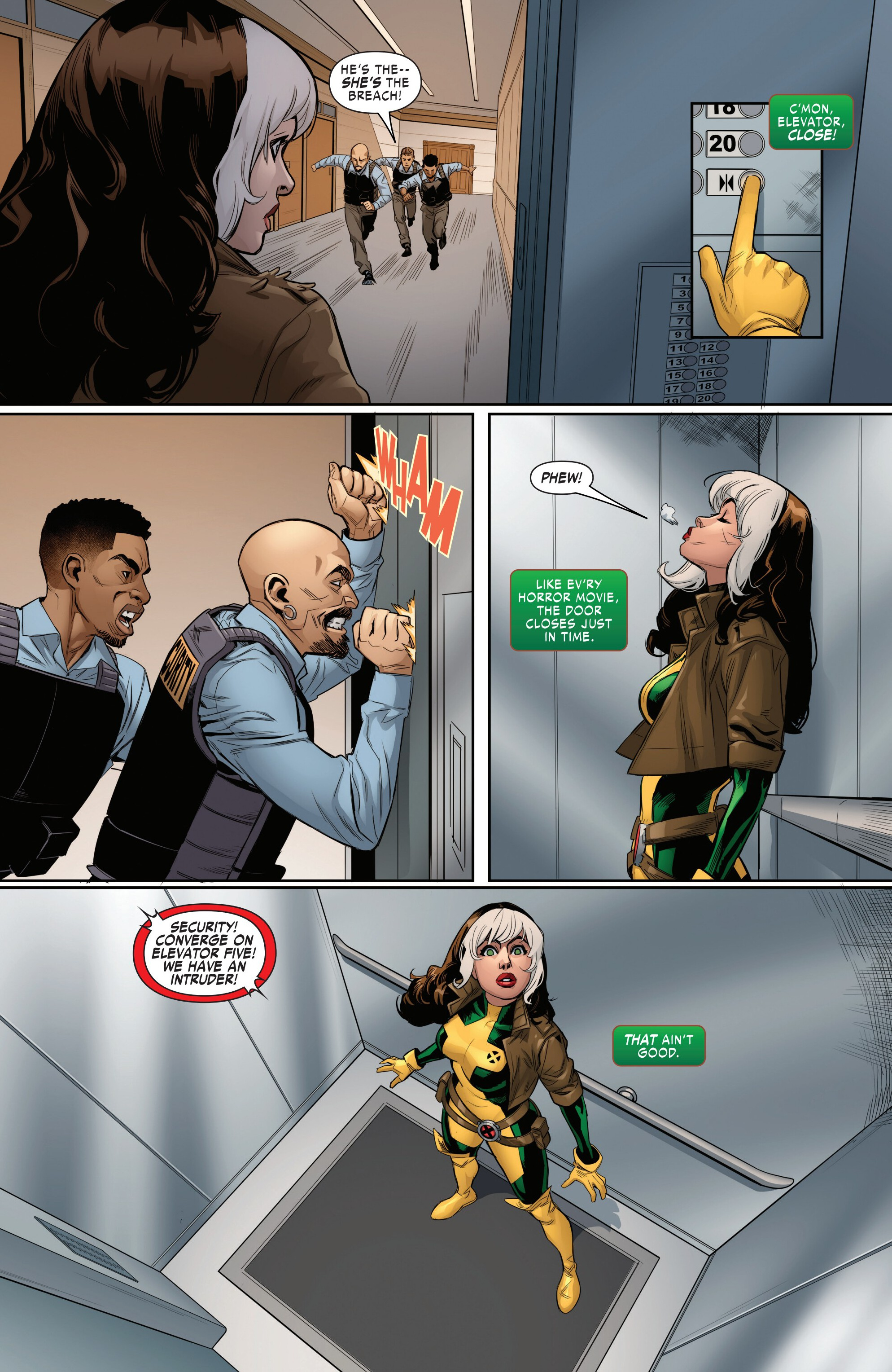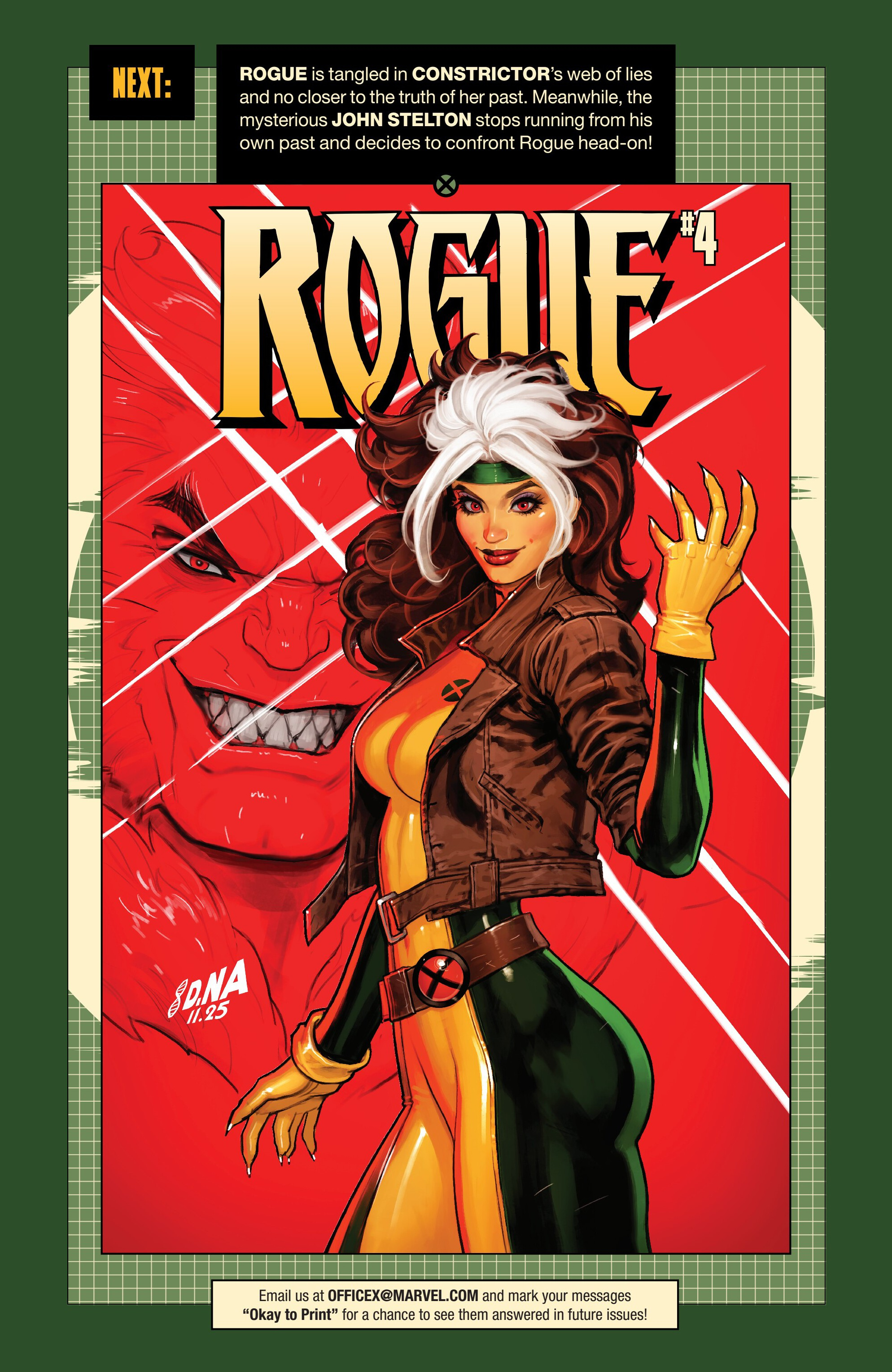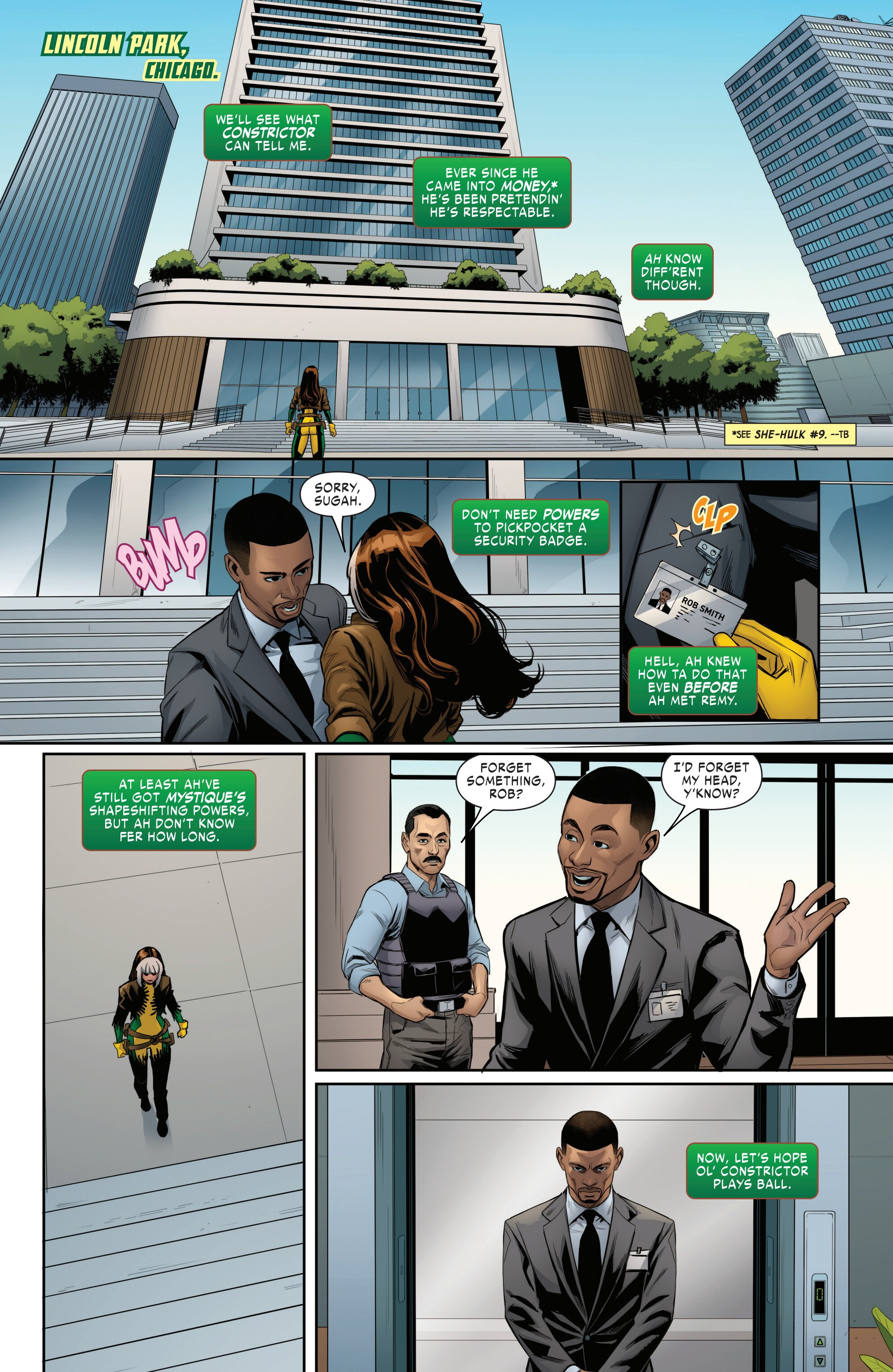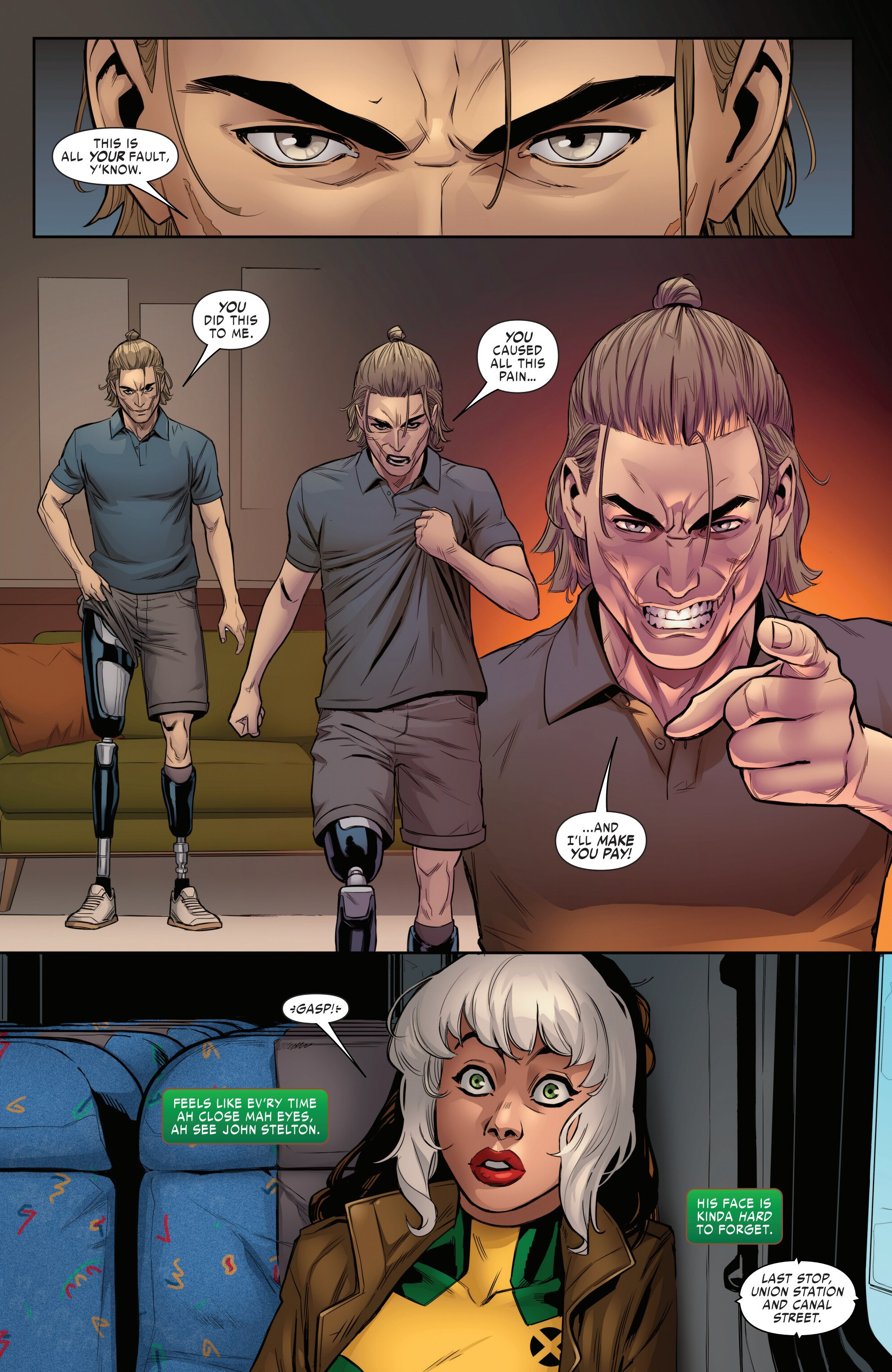 Previously, Rogue visited Mystique and Destiny to get answers to what happened during the mission with the Brotherhood of Evil Mutants in Project PEGASUS. Unfortunately she did not get any actual answers to what happened, causing her to storm out. During her flight, she contacts Gambit and gets the info that the allegedly dead Constrictor - who also happened to be there on that mission - is secretly alive and has placed himself in hiding. But the moment she gets that info, she loses control of her powers and (due to having accidentally absorbed Mystique’s powers when she visited her) began rapidly shapeshifting, causing her to crash into a warehouse where a deal was being made with associates of Constrictor and the anti-mutant group Humanity First, forcing her to fight with them.Meanwhile, the handicapped former Project PEGASUS guard J. Stelton comes home to his wife to tell her the news: he has found Rogue, who is apparently responsible for what happened to him during that mission…and he’s going to make her pay!