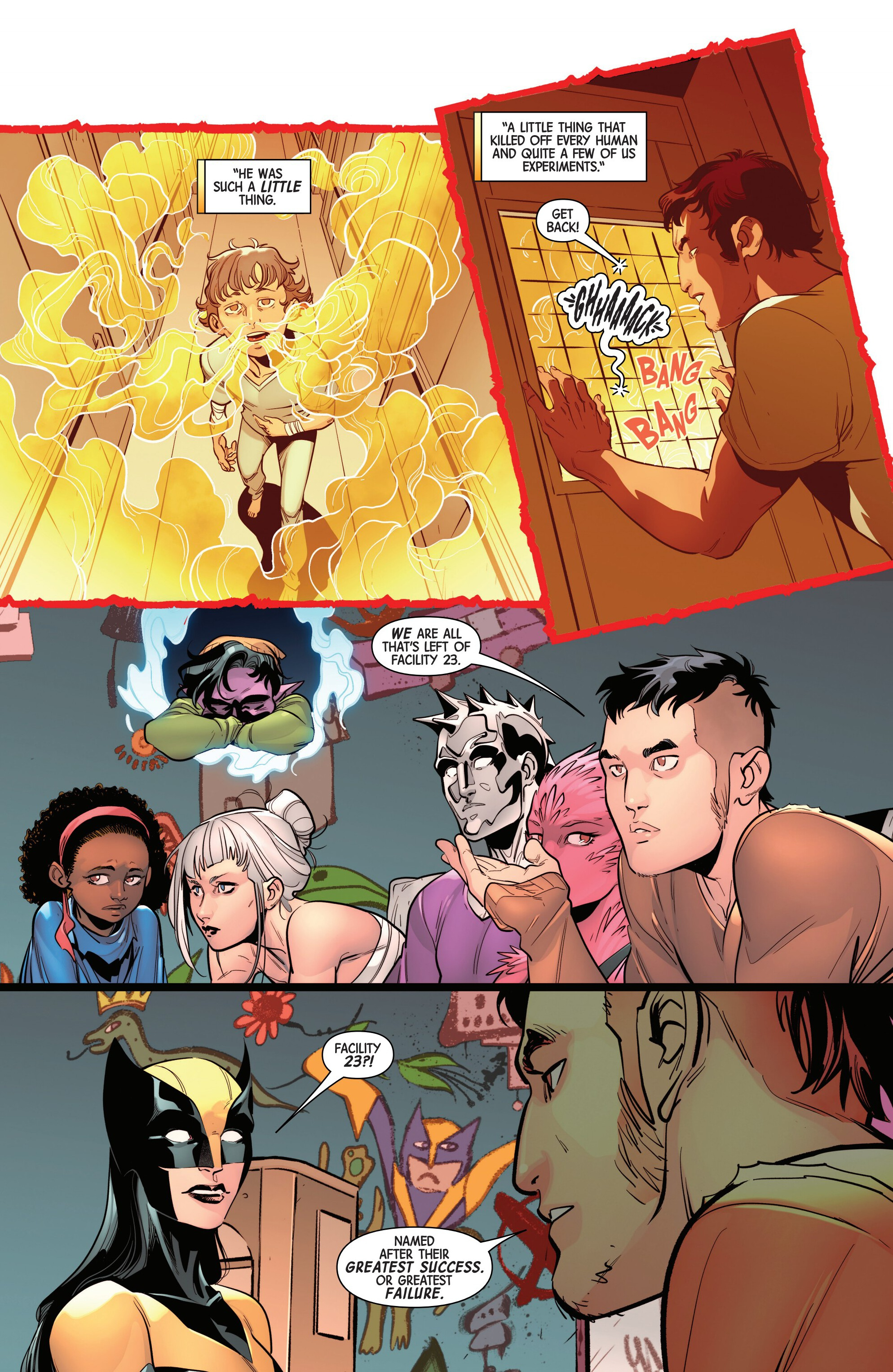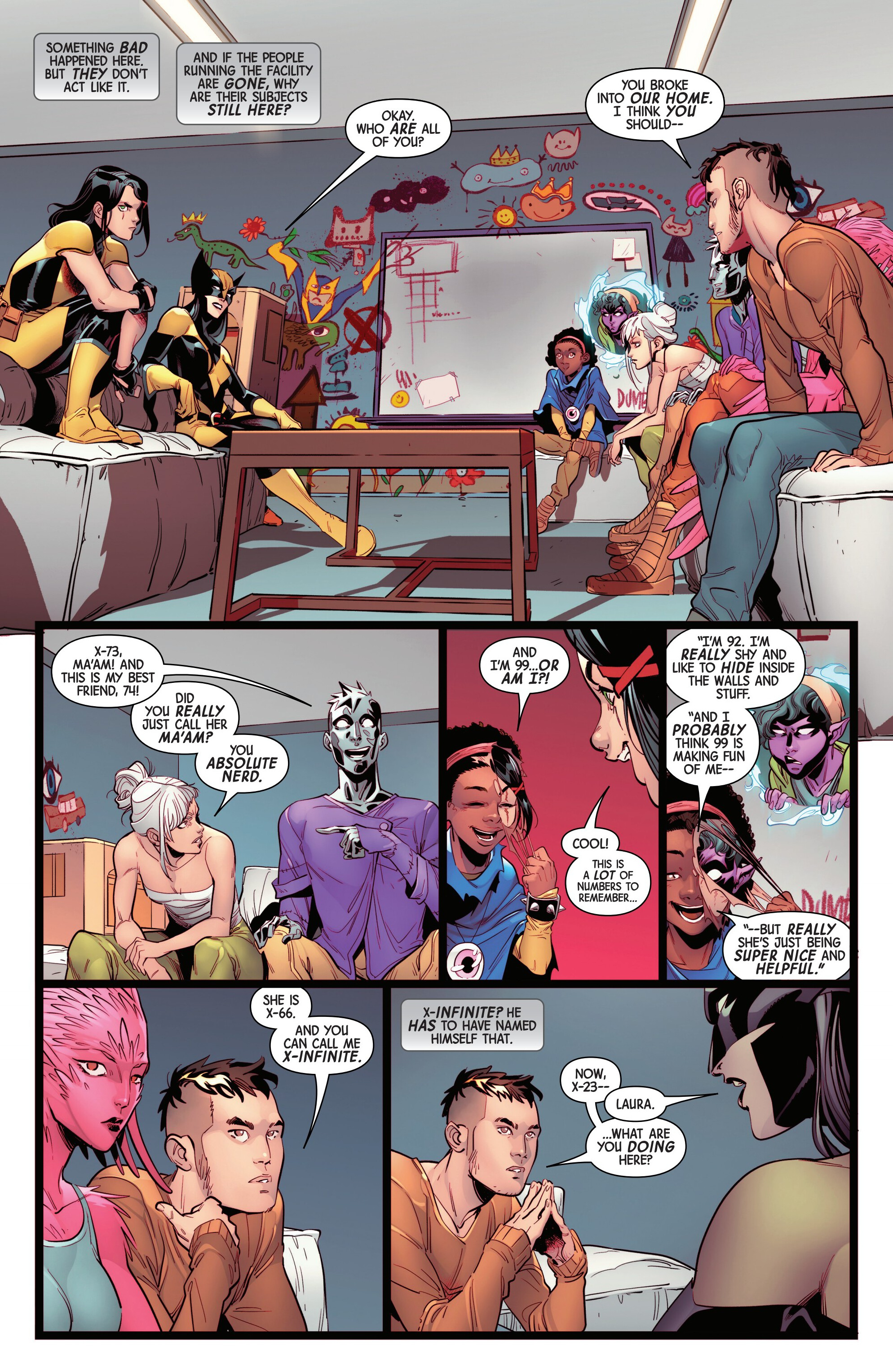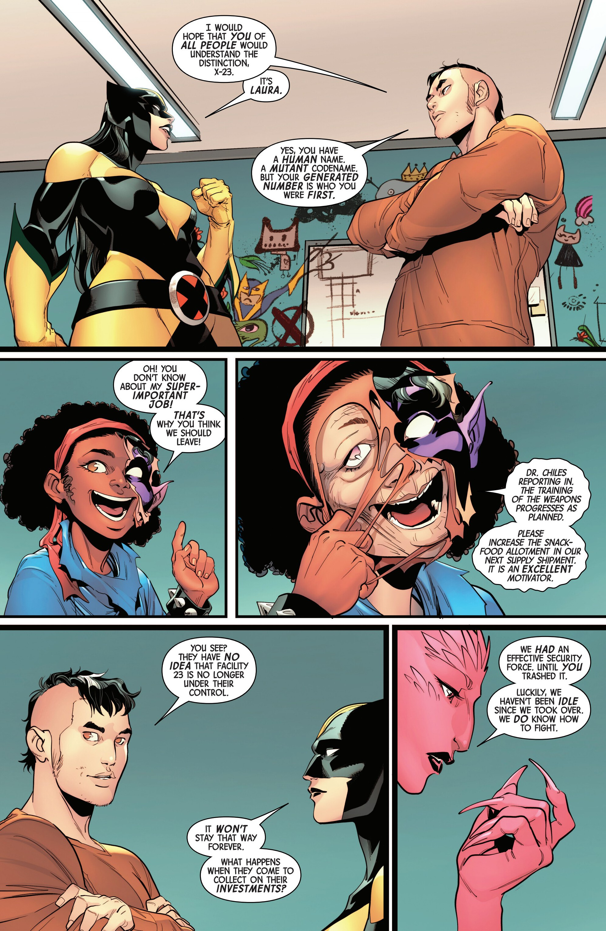 Last month, Laura and Gabby were protecting a mutant from an angry mob when they suddenly saw time itself breaking down around them. Thinking that it was Kiden Nixon due to picking up her scent, Laura began tracking and met instead X-80 - a mutant created using Kiden’s DNA - who asked Laura to save others like her before she apparently died unable to control her powers. Traveling to a seemingly abandoned storage facility (that smelled awfully like the Facility that Laura grew up in), the sisters broke in and were ambushed by the Robo-Bubs guarding the place, before finding themselves against the newest weapons: X-66, X-73, X-74, X-92, X-99 and X-Infinite. And the weapons were ready to…not fight them at all?
