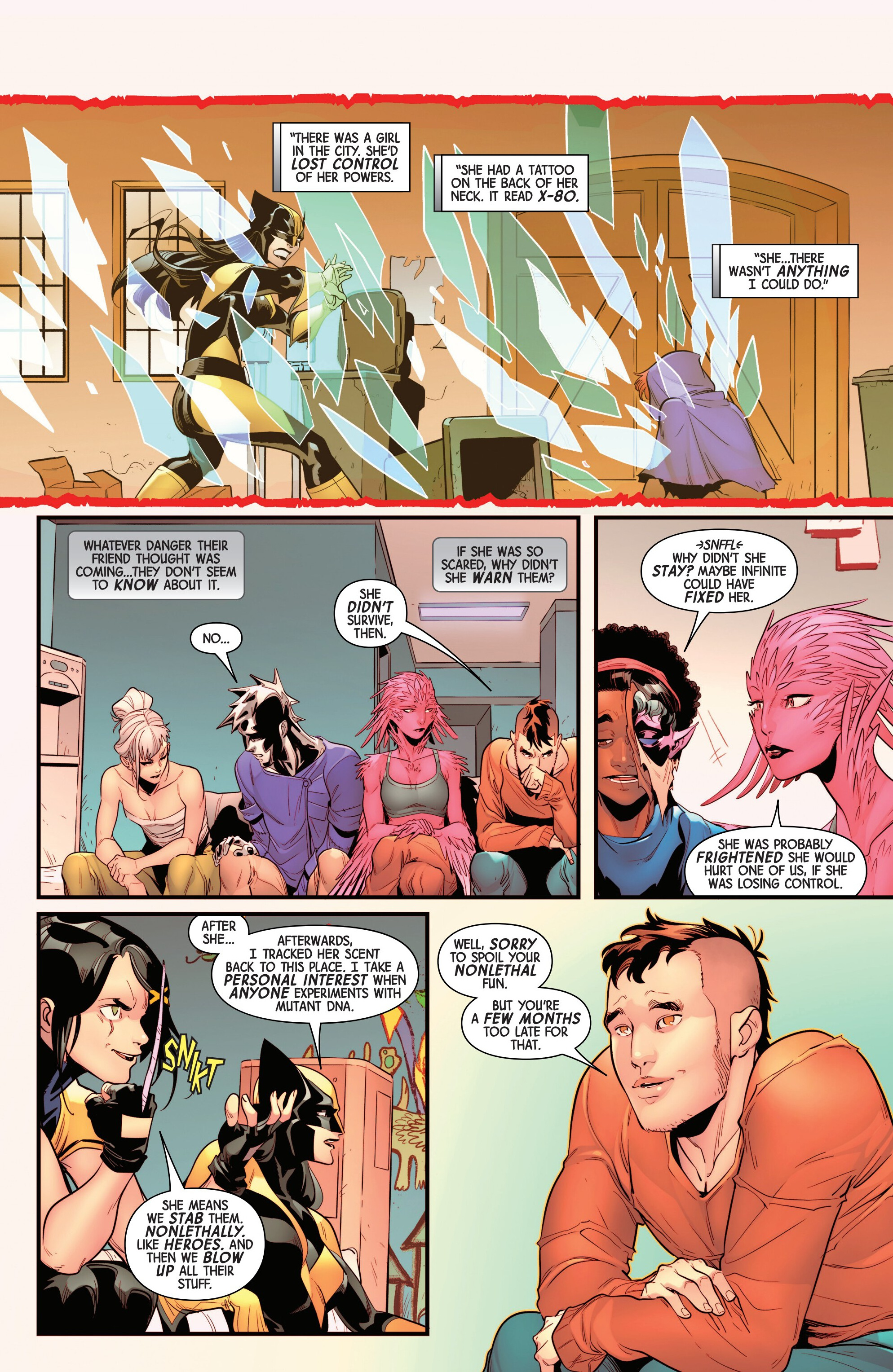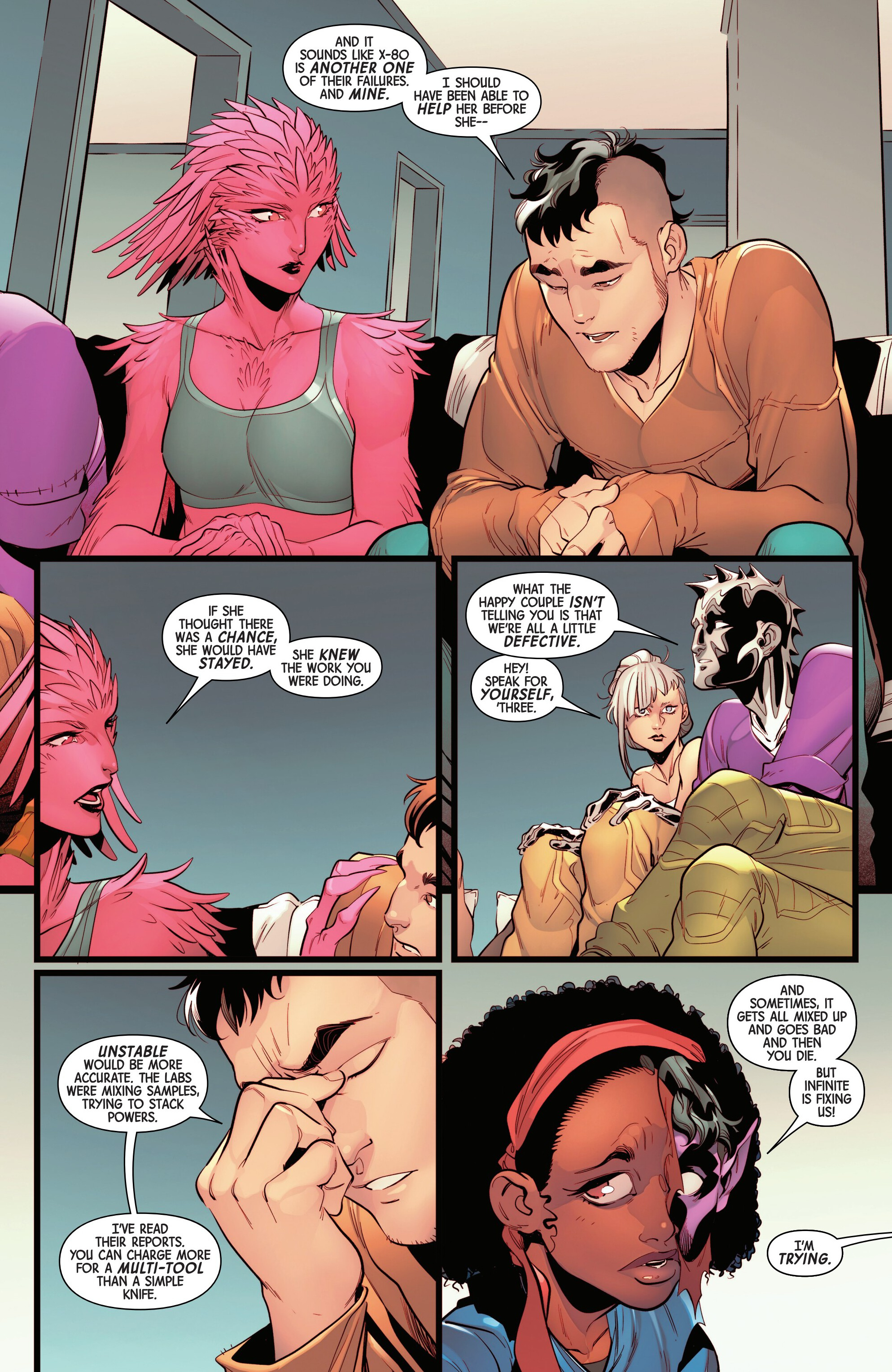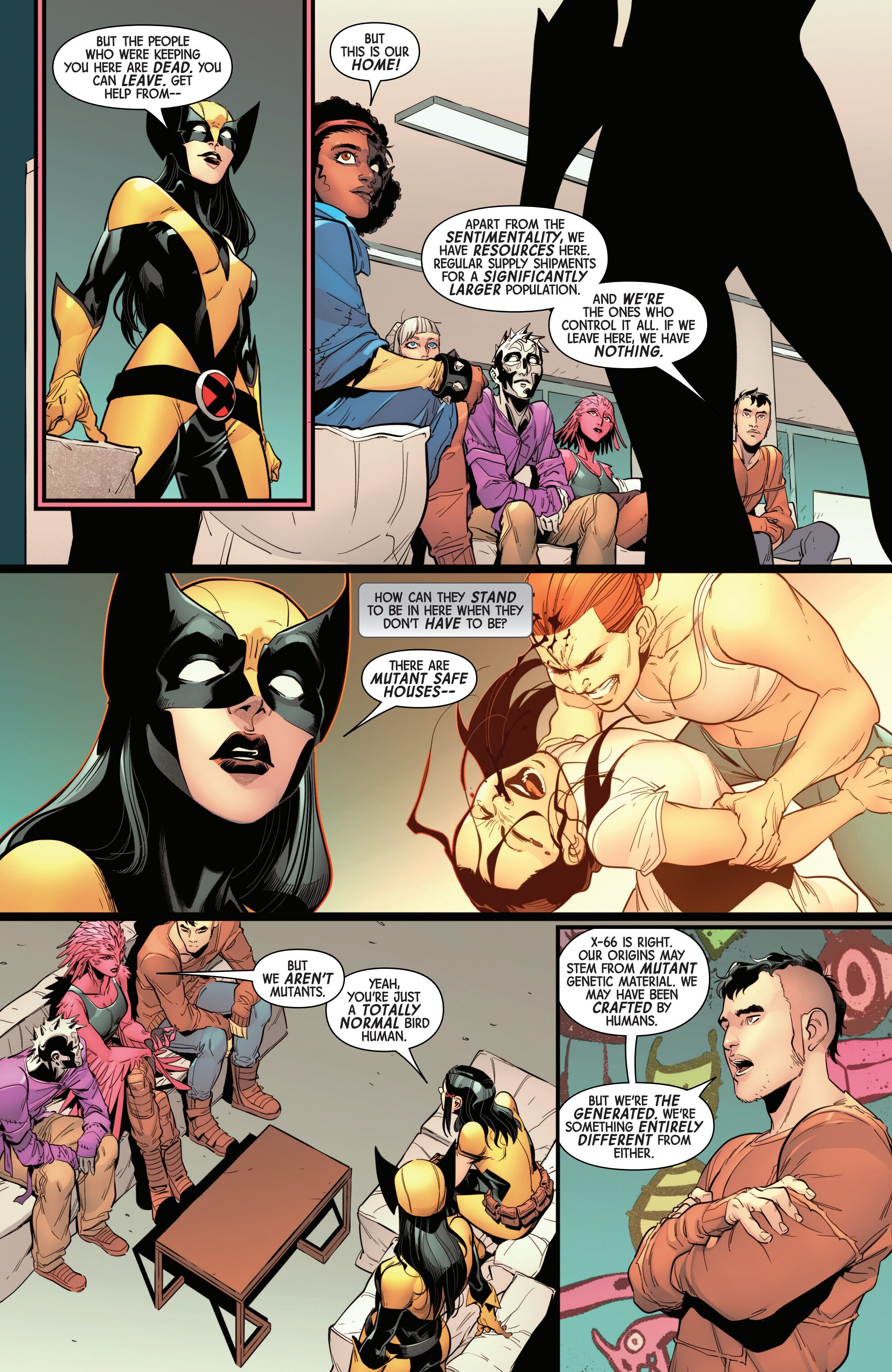 >They’re not letting Laura help themShut up, just let her help. If you’re still having the same problems months later even with the resources you have access to, then you’re better off just asking Laura to hook you up with someone who can help you before you break yourselves. >”Our origins may stem from mutant genetic material. We may have been crafted by humans. But we’re the Generated. We’re something entirely different from either.”Is that a fancier way of calling yourself artificial mutants?