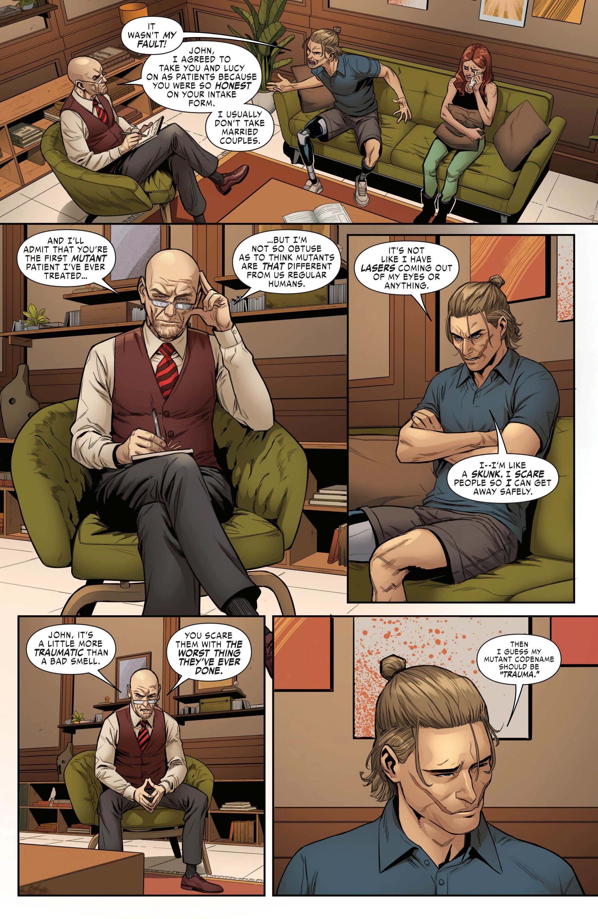>Stelton is a mutant who can make people experience the worst thing they have ever doneCould have shared that info with us earlier, you know.>”Then I guess my mutant codename should be ‘Trauma’.”Hate to break it to you buddy, but that name is already taken by another guy who also has fear-based powers.>https://marvel.fandom.com/wiki/Terrance_Ward_(Earth-616)