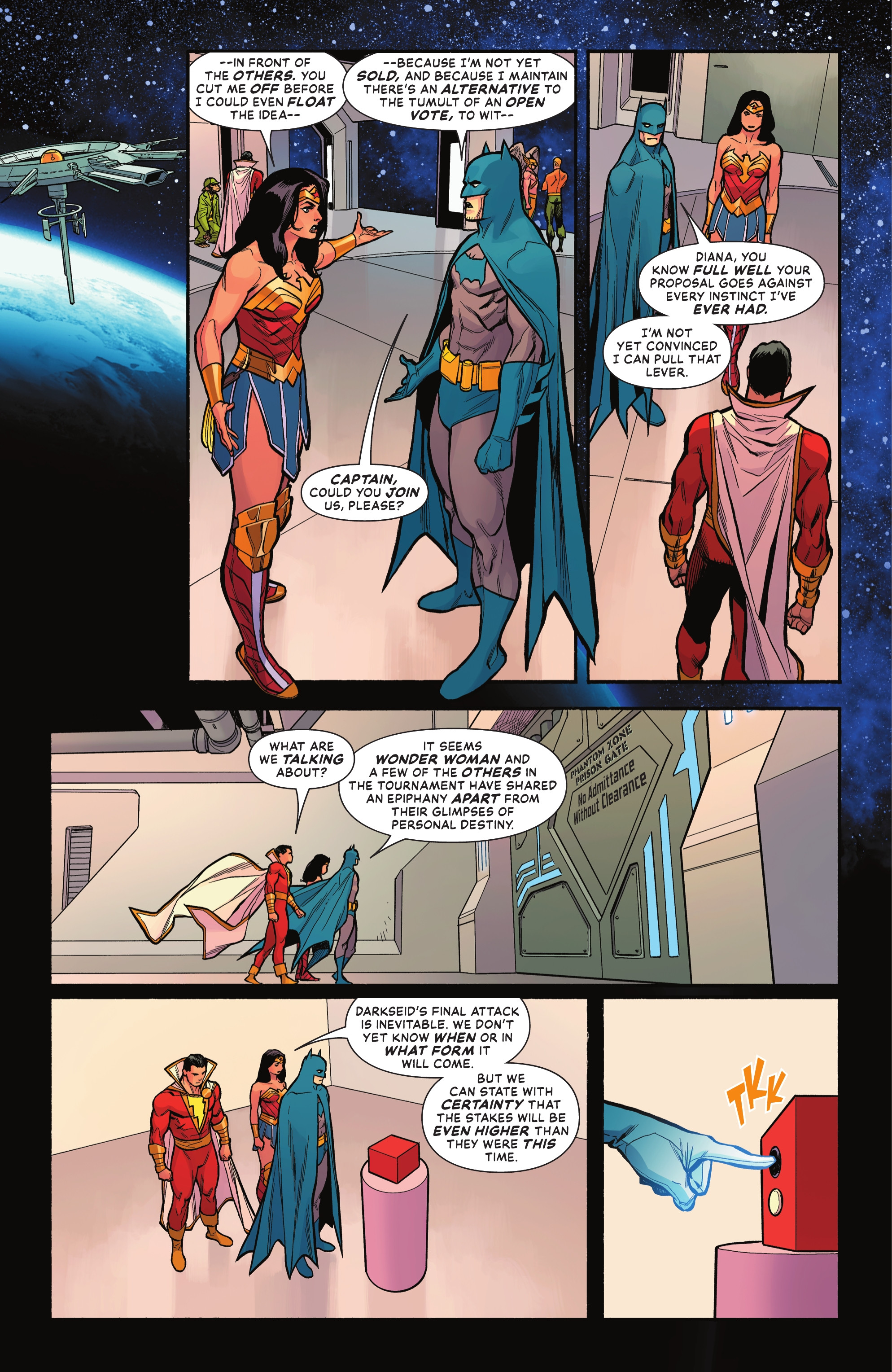 PERIL OF THE POWER PLANET! Lex Luthor and the Dark Knight are the heart of the mystery surrounding Brainiac Queen's return, and a surprising connection between the two men is driving a wedge into the JLU. Meanwhile, the mission to shepherd the JLU's power repository from the Watchtower to Oa goes awry, and you'll never believe that it was all Guy Gardner's fault. Well, I mean, you might believe that. I do.