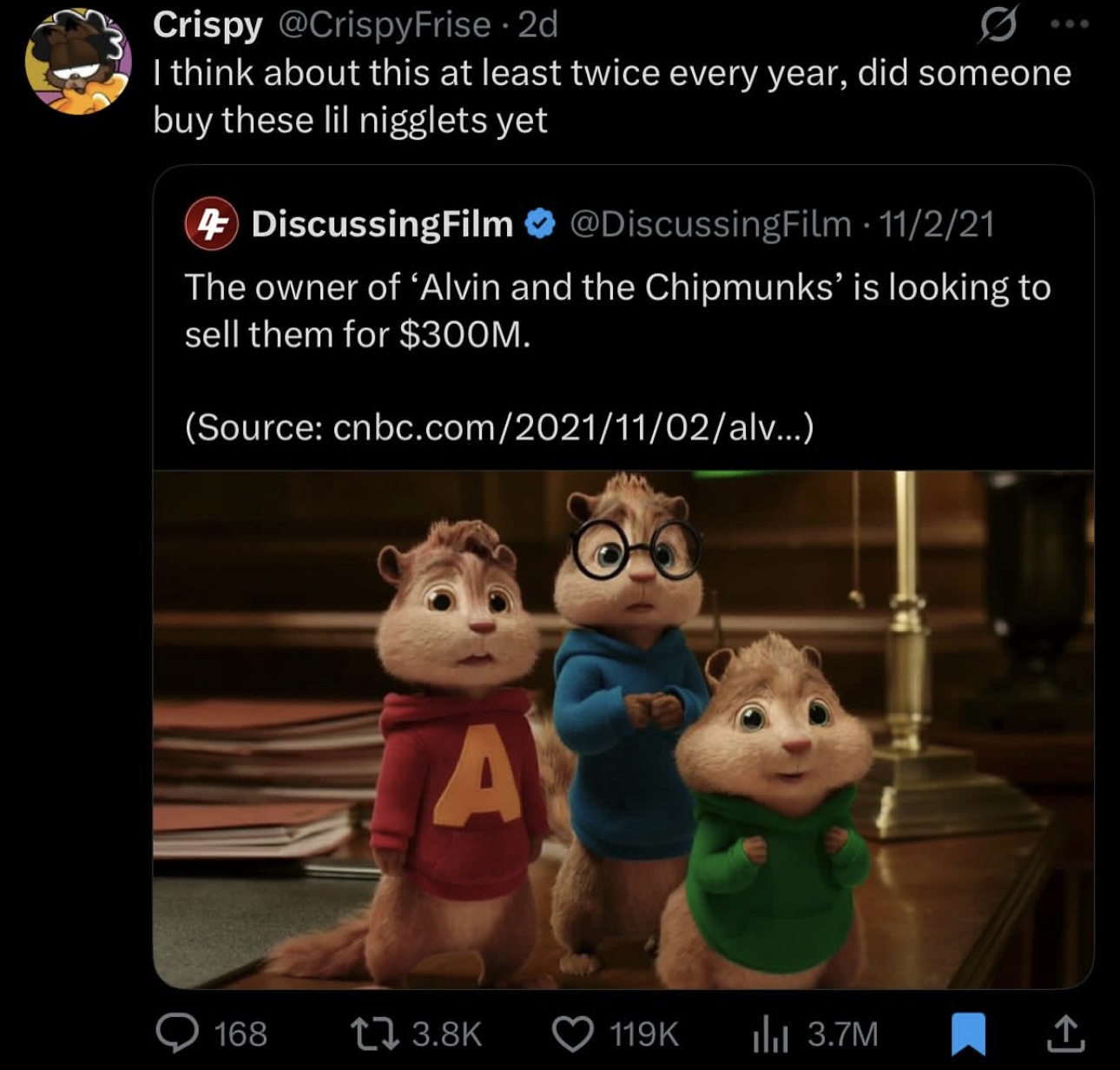 I find it hilarious that the family thats owned the chipmunks since the 60s has been trying to sell it for the past five or so years and the IP is just so dated and so unlikable no one wants to purchase it lmao>>152960684Was your boss masturbating to the chipettes while he was in the middle of writing up your pink slip?