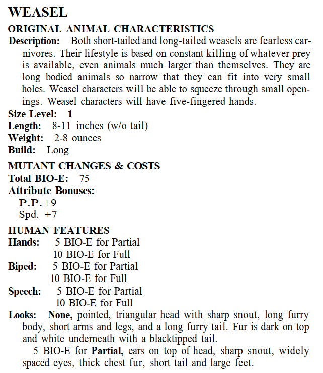 She should be a mutant. A weasel, preferably, shift, fast, lying, bastich weasel. They get +4 P.P. in the TMNT RPG game.