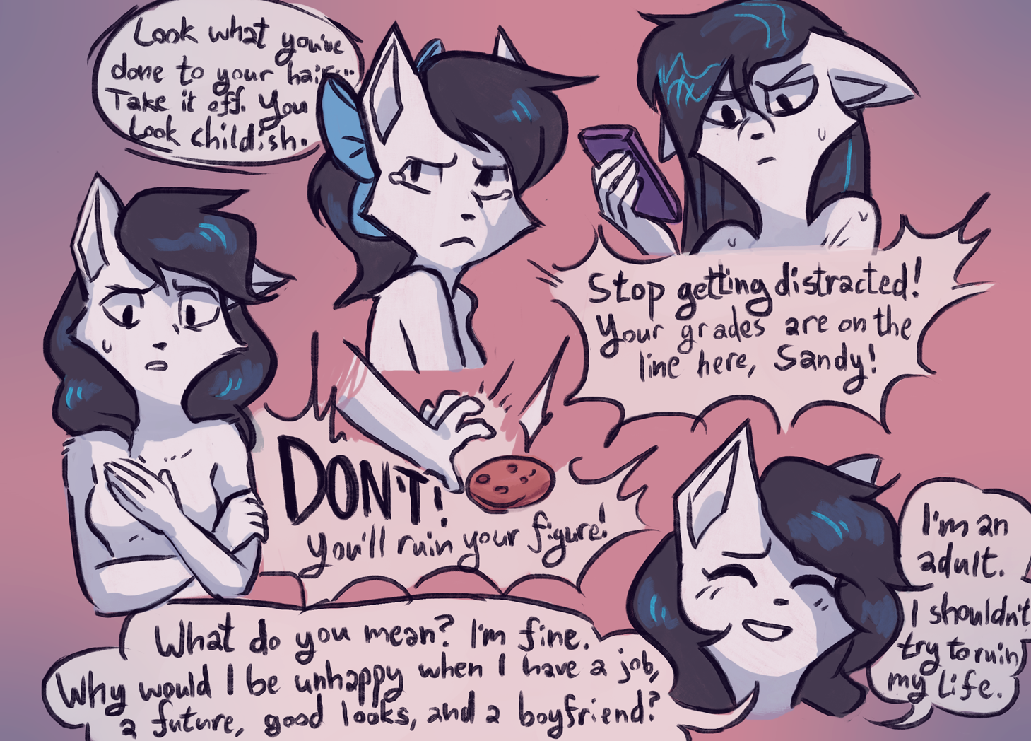 Back when I first started browsing these threads they would have fucking exploded with a BCI dump like this. I feel like I'm reading these all alone here.Falling Back is hilarious and I'm not sure how intentional that was. You can really feel how embarrassed Tae is over her Pucy phase.>picWhat is David's fucking problem honestly. I mean I know it's just the author sockpuppet frowning because this is the Pucy Bad comic but c'mon, this is not in-character. His two favorite people are boning constantly, this is something he gets pissed about not happening in canon.