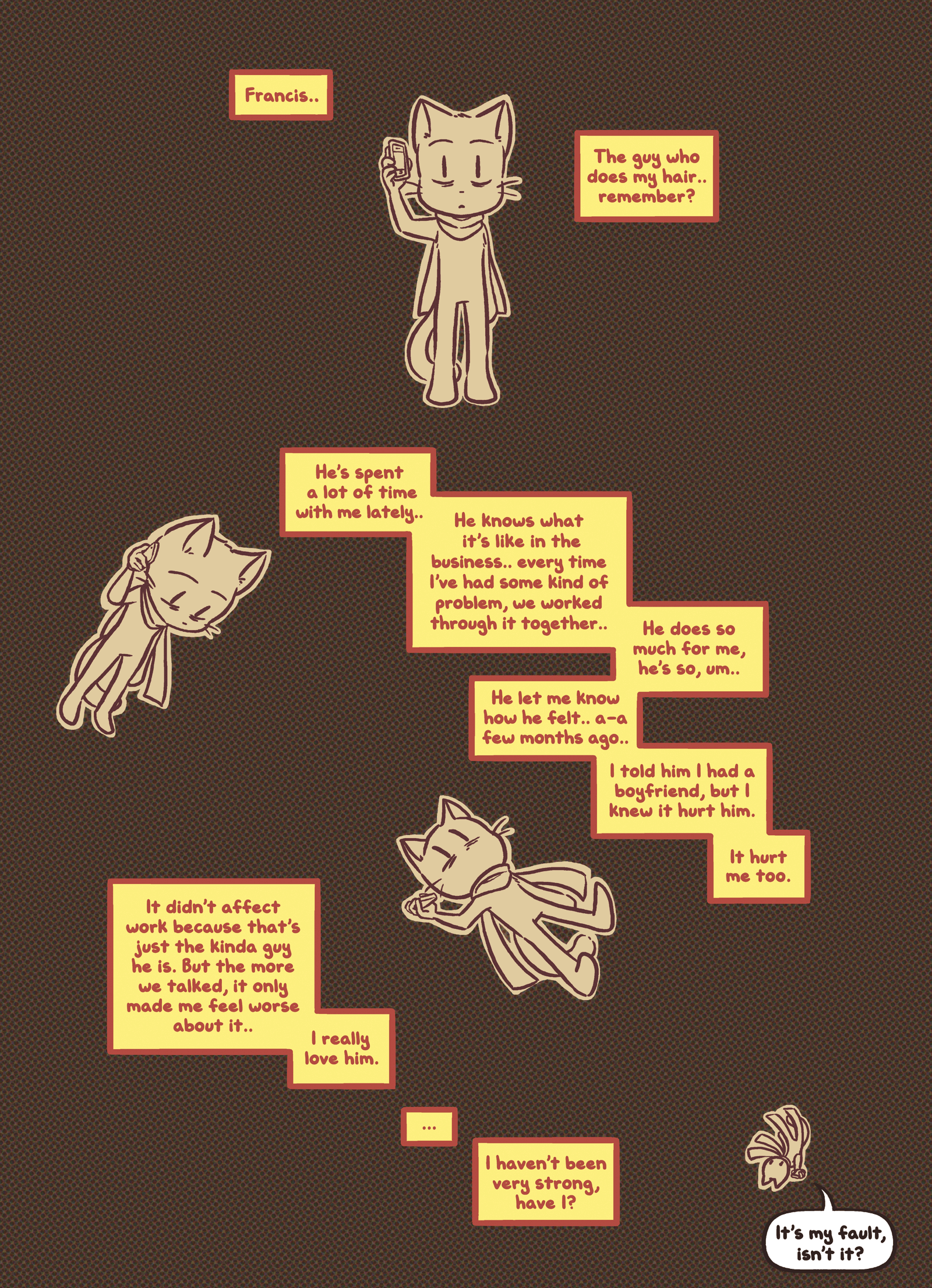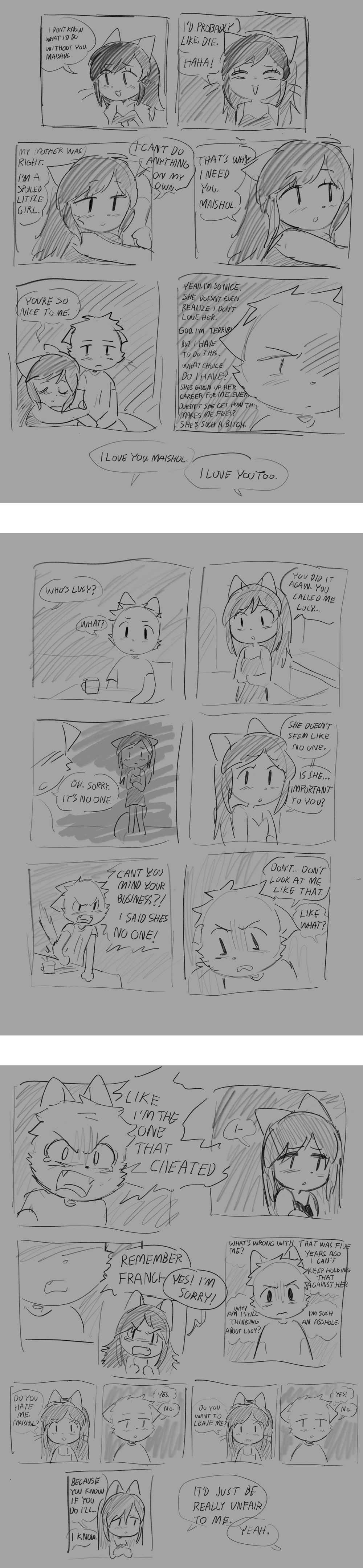 >>152959556Yeah I don't see this page as "Sandy is being mean to Mike by only talk about herself" but as "Mike agreed to take her back because she needed him more than he needed her, and she spilling all her problems at him is only evidence of that", he took her back knowing things wouldn't be the same, he didn't forgive her cheating he took her despite of it because the other option was leaving a seemingly desperate girl on her own after something must have gone wrong. Sandy can't talk about anything that's not work because that's all she knows right now, her life has forced her to ignore other things else she starts feeling the anxiety of not being able to live a normal life so she copes by embracing her career.