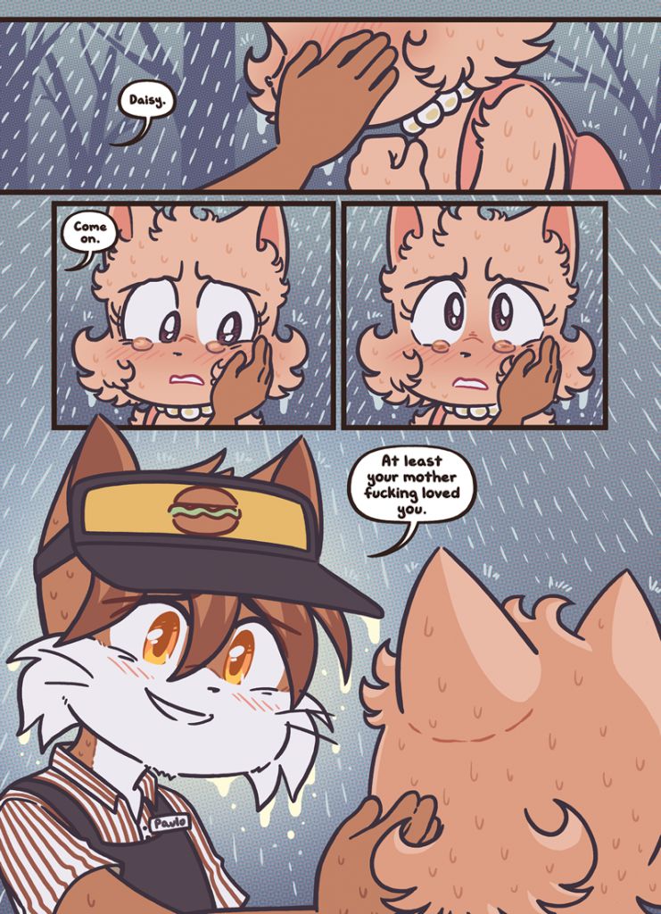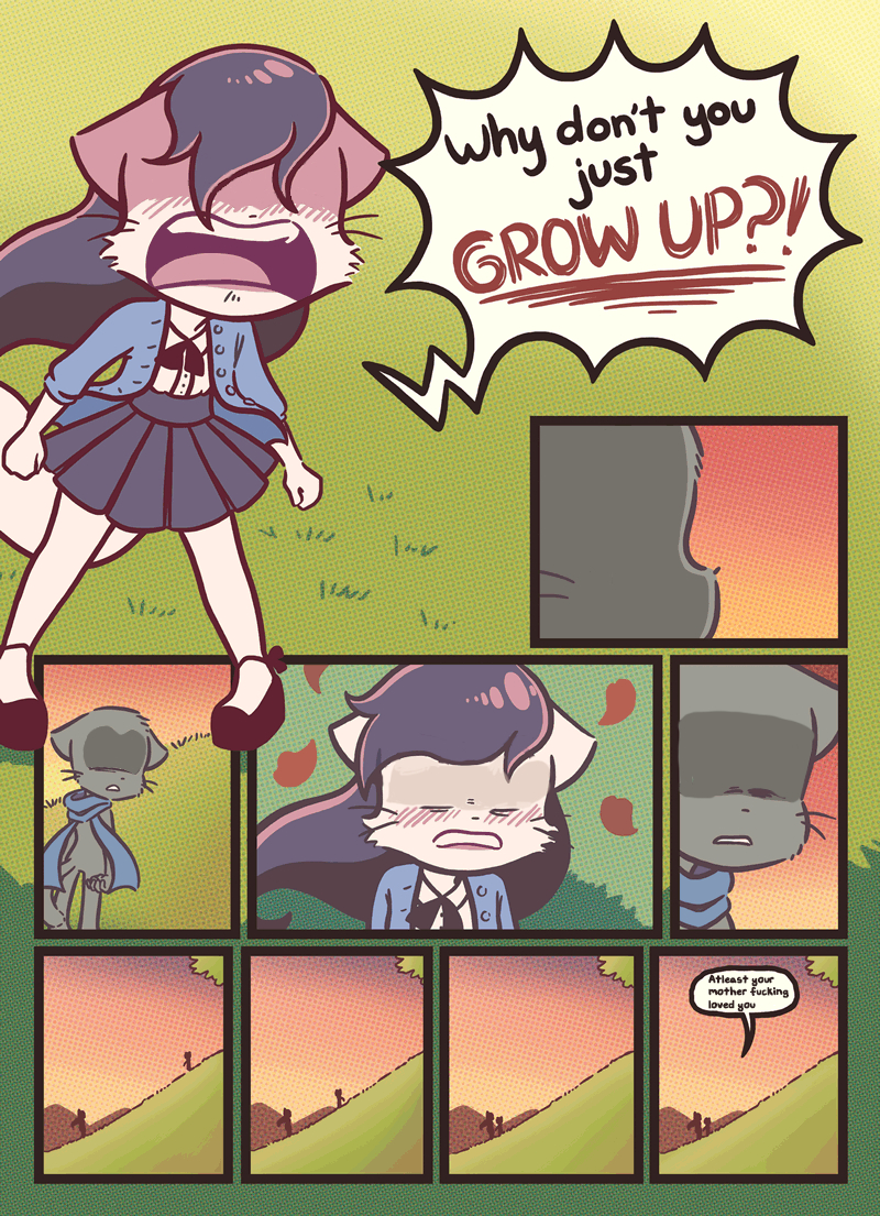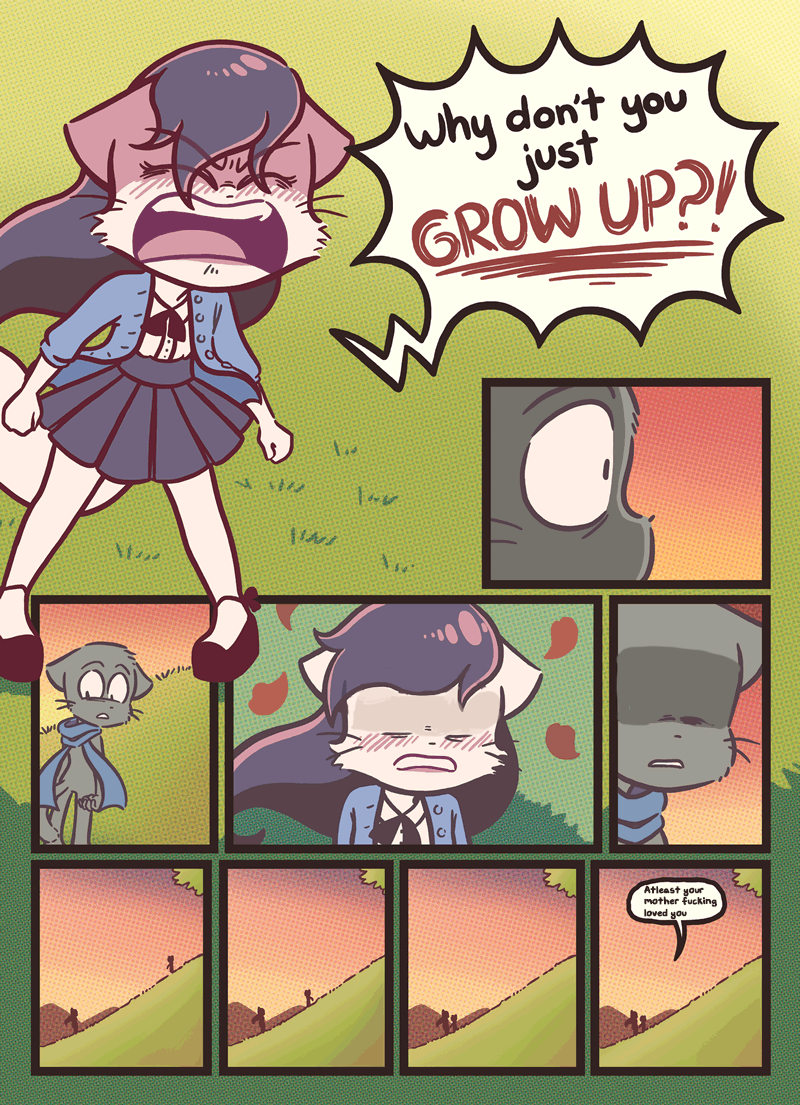 >>152958400I only talk about the comic here and have never gone on the discord, and I'm unironically more sympathetic to Sandy than Mike. She's got actual stuff going on offscreen, with tension, stakes, motive, all that shit. Mike is just a leaf in the wind - he started as the popular kid, with good grades, anime reflexes, loyal friends, confidence, et cetera, and his story has just been him declining from that peak one abuse at a time. And unlike the Paulo "soggy" bitch or Lucy "never wanted it" whitecat, there's not even a sense of schadenfreude: Mike's misery isn't amusing to watch, just sad and pathetic.Sandy has an ultra-controlling mother and a full-time job monopolizing her time, and she still has more personal agency than Mike.