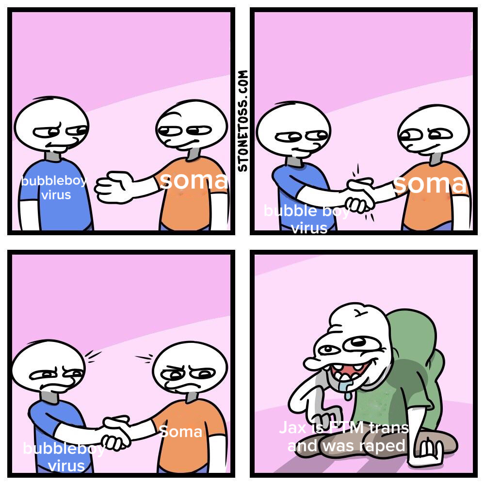 >>152961813I think “Jax got raped” is a /co/ original, but the trans thing is fandom-wide (but still largely accepted as non-canon)Jax’s psychology just lends itself to being read as the result of a lot of different life experiences, the way he acts and the things he fears are a pretty standard result of a wide range of struggles (which personally I think is the point, that it’s not so much a question about what specifically made him that way, but is rather an examination of why these coping mechanisms are pretty much incompatible with life over a long enough timeline, regardless of how you got there)