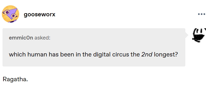 imagine if someone joined the circus just as Caine was crashing out