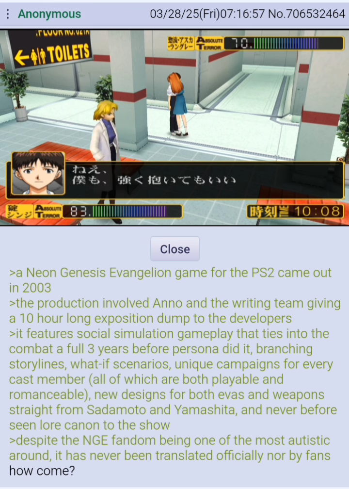 >>152970690>>152970728Damn I’m sad and a little jealous. Logically I’m sure this is just a cultural phase we’re going through and it will probably pass like everything before it, but it feels infinite when you’re in it. And so many political and cultural elements of 80s and 90s America feel like a different country from an outsider’s perspective. It’s nice to just spend some of my free time on stuff like TADC so I don’t have to think about it
