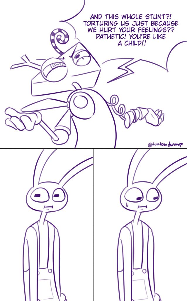 I can forgive Kinger making the circus and getting his wife killed, Ragatha micromanaging other’s emotions and not letting people in, Gangle’s powertrip, Pomni abandoning Ragatha for the exit, Jax fucking with every person and throwing people into deep-friers, Zooble asking to be referred to as a they, but don’t ever EVER ask me to consider Caine, he’s a meany head.