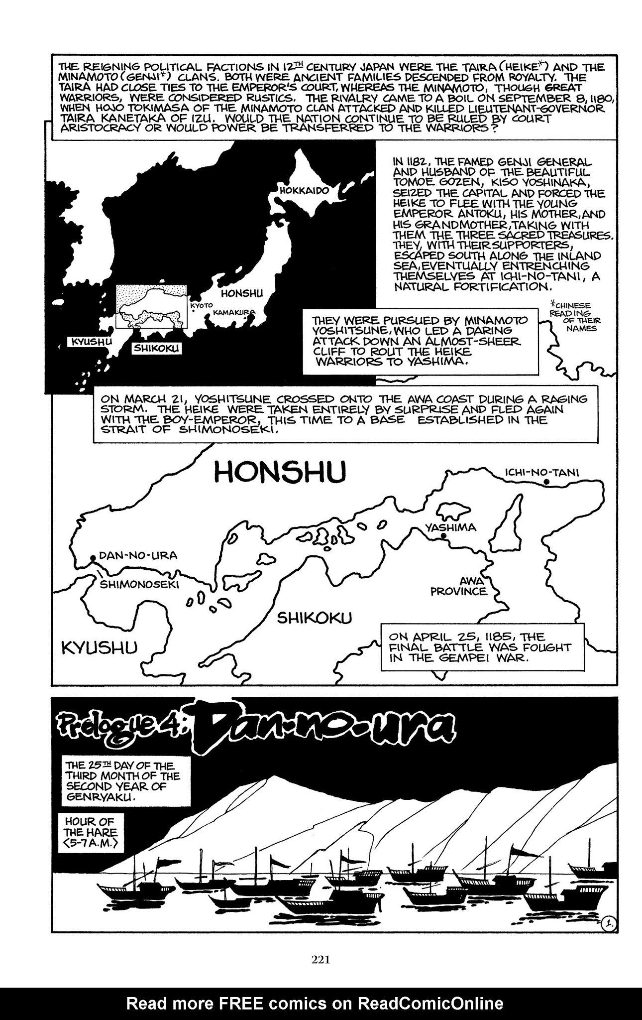 it's a more lighthearted scene than presented here: The fan was so far away that Yoichi rode out thirty or forty feet,but from there it still looked a good hundred yards off.It was the eighteenth of the second month,the hour of the cock—very late in the day—and a strong north wind was blowing.High waves were breaking on the beach.The drifting boat tossed up and down,the fan kept fluttering on its pole.The sea was dark with Heike boatsgathered to watch, while on the shorethe Genji gazed out, bridle to bridle.Both sides seemed in a festive mood.With one hand Yoichi covered his eyesand silently prayed the following prayer:“Hail Hachiman, Great Bodhisattva,and you, gods of my home province,Nikkou Gongen of Utsunomiya,Yuzen Daimyjin of Nasu,I beg of you, guide my arrowto hit the center of that fan!For should the arrow miss its mark,I shall break my bow and die,nor ever again face any man.If you wish me to return,let this arrow of mine strike home!”Once more he opened his eyes.The wind had dropped just a little;the fan looked easier to hit.He took out his humming arrow,put it to the string, and let fly.Small as he was, it was still long—twelve full handbreadths and three fingers—Nasu no Yoichi’s arrow hits the fan.and he drew a strong man’s bow.The arrow’s song rang out afar.Unerringly, it struck the fanan inch above the pivot pinand flew straight on into the sea.The fan shot up into the air,fluttered there a moment or two,then, buffeted by the spring wind,dropped to the water with a splash.The waning sunset’s slanting rayslit the red fan, with its sun disk,adrift on the white-foaming waves,bobbing high and low. The Heike,out at sea, in admirationpounded the gunwales of their boats,while on shore the delighted Genjibeat on their quivers a sharp tattoo.