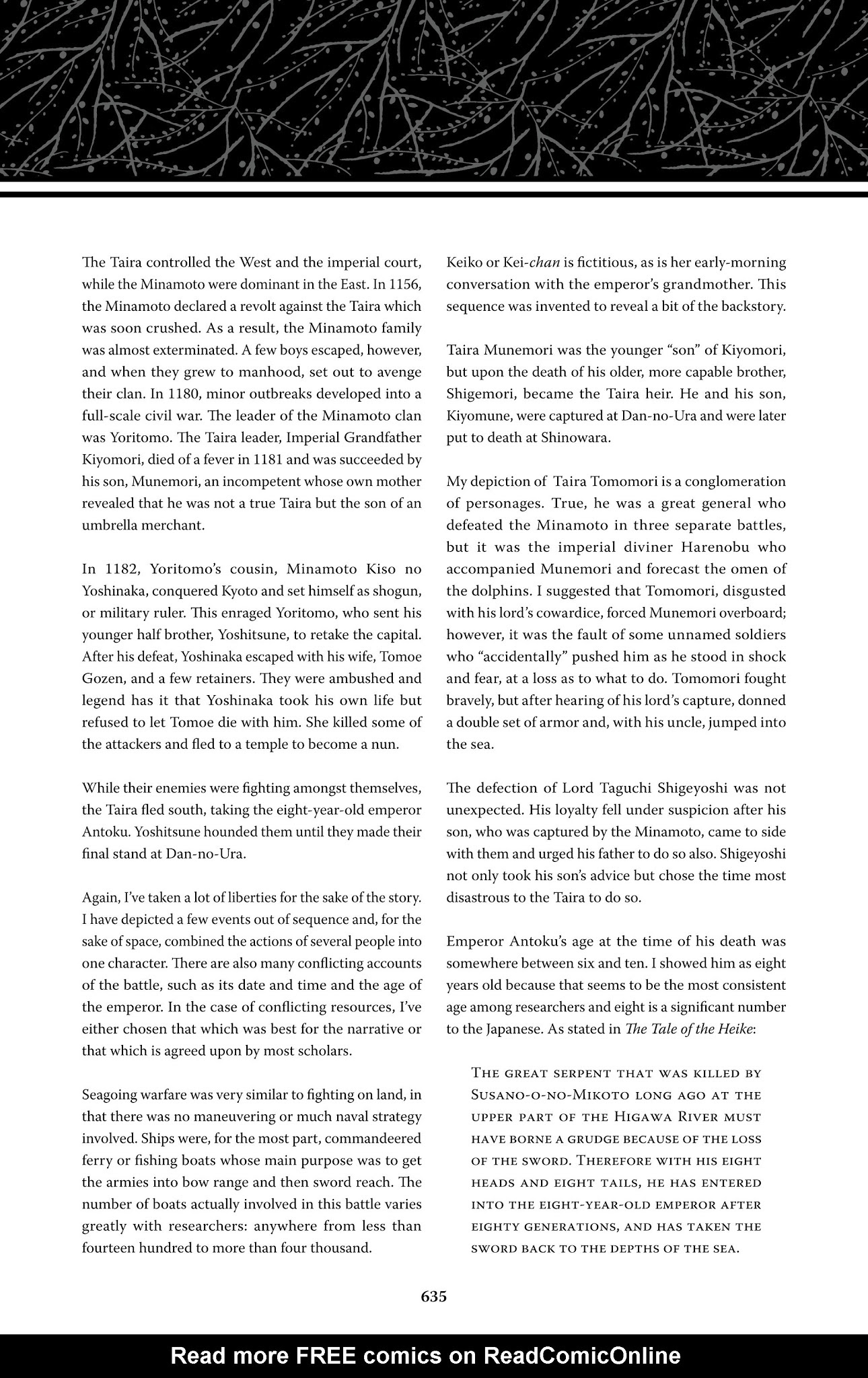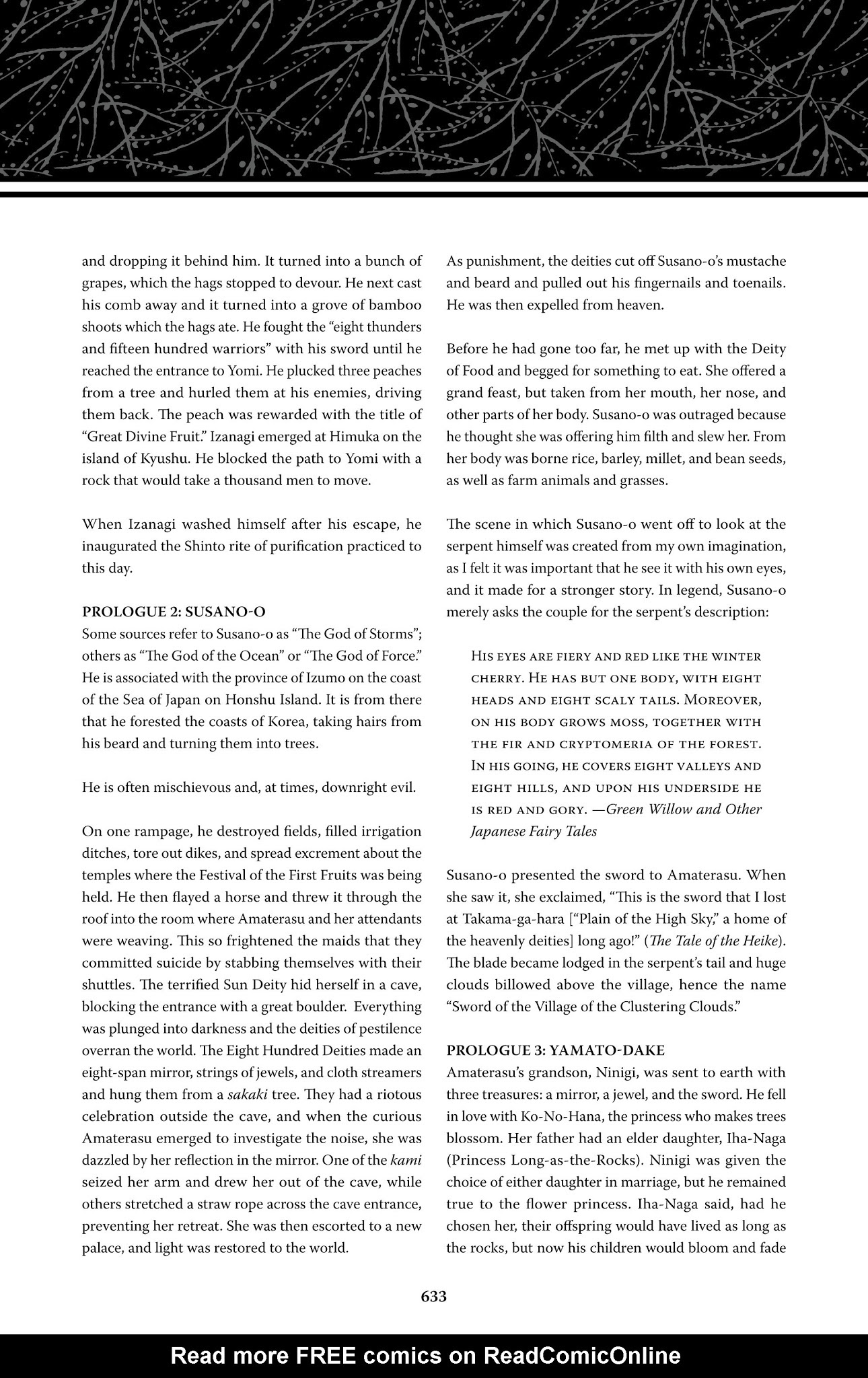 >>152984255>>152983140So in some versions of the story, Susano transforms the girl into a comb and he waits by the vats of rice wine with the comb. The clear liquid reflects her 'true' appearance as a beautiful princess and this causes Orochi to greedily drink the wine until he becomes drunk and passes out. In other versions such as the one I'm linking, Susano merely places a beautiful comb in the girl's hair as he uses her as live bait. He puts her on an altar and lights bonfires around her so the smoke and heat will deter Orochi from eating her, and the serpent then becomes thirsty so he once again drinks the vats of wine until he drunkenly passes out. In either case, the wording of the text isn't just that Susano decapitates Orochi, but that he hacks the serpent to pieces (I guess to make sure he's extra dead) and the swing in his tail section catches on something.Source: https://ia801604.us.archive.org/16/items/TheHeikeMonogatari/HeikeMonogatari.pdf